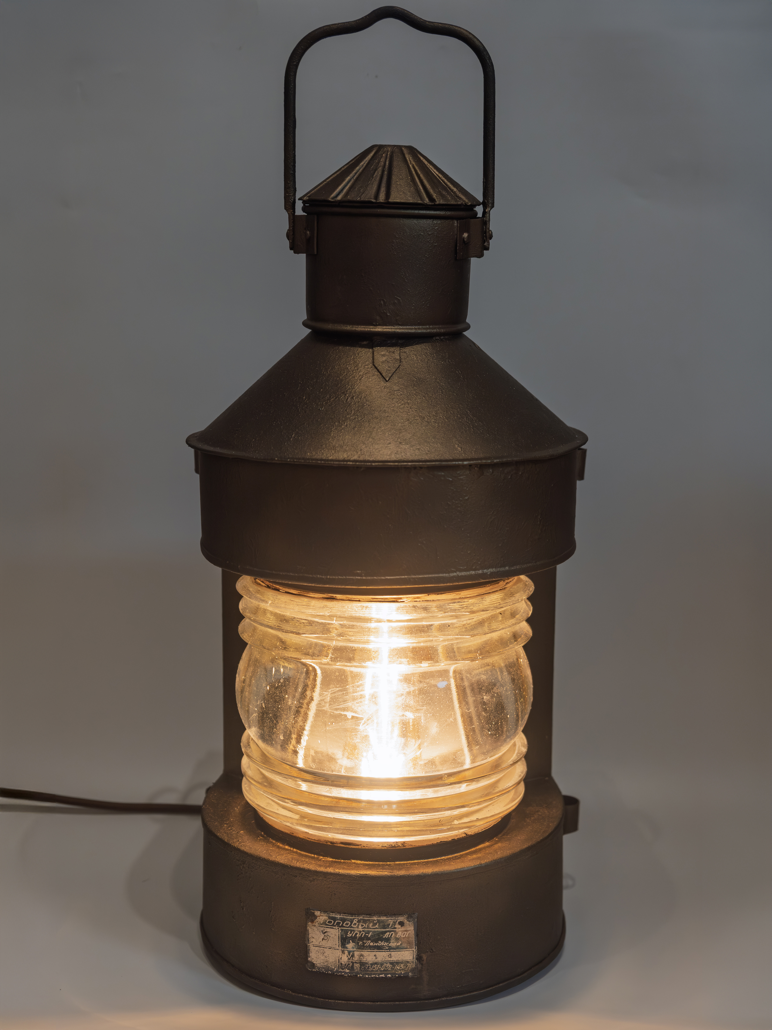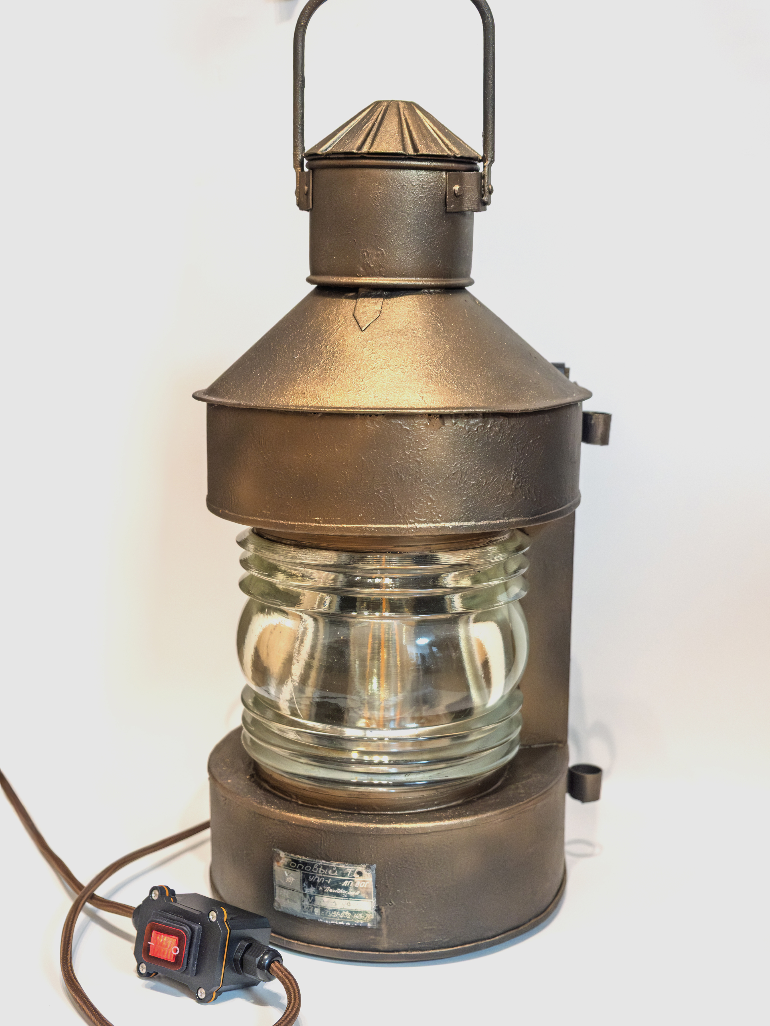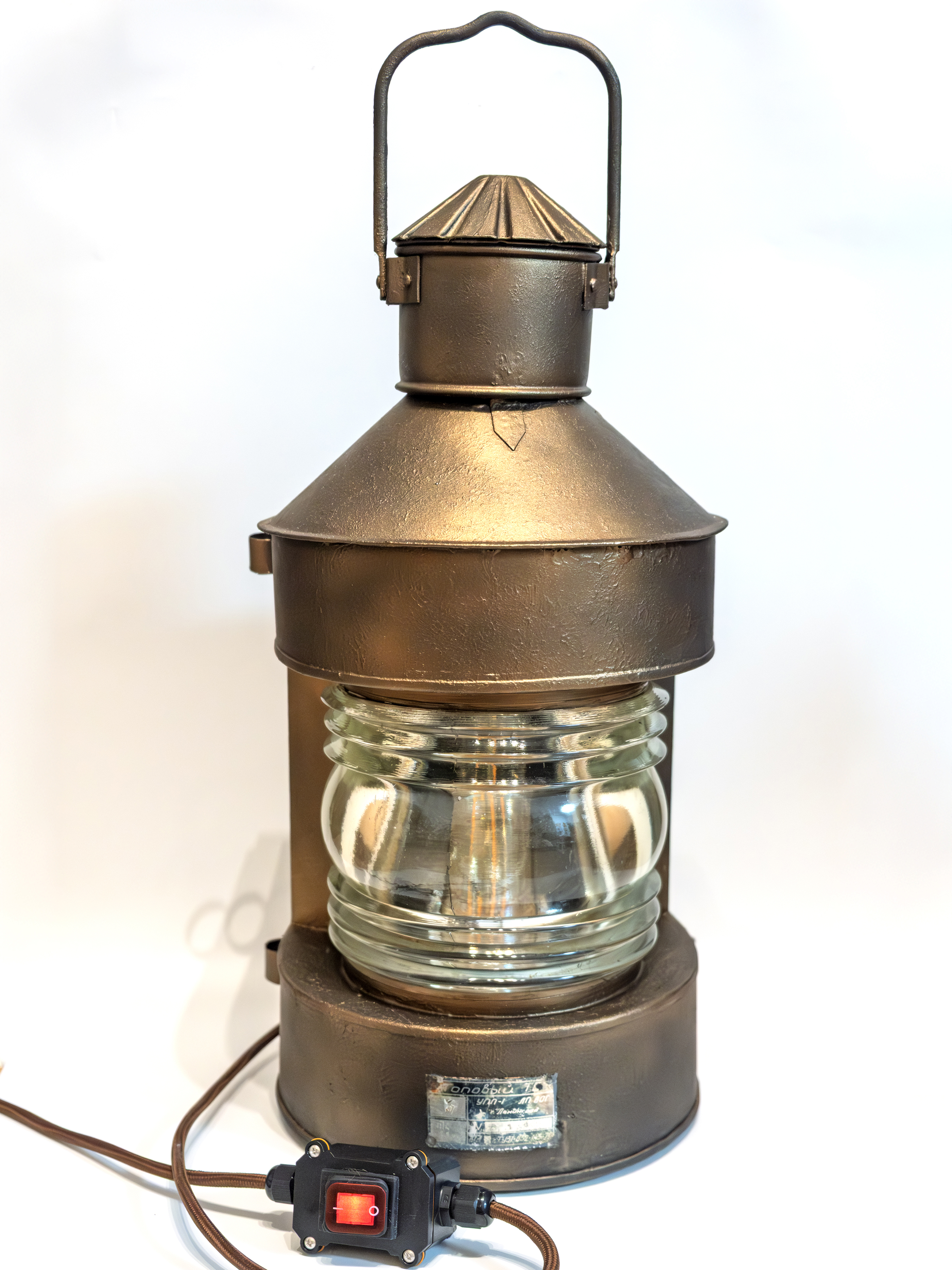 Этот предмет создан на основе подлинного корабельного топового фонаря модели «Топовый ТС», произведённого в Ленинграде в 1970 году. На корпусе сохранена оригинальная заводская плашка с указанием модели, серийного номера и даты выпуска. Таким образом, возраст фонаря на сегодняшний день составляет 56 лет.