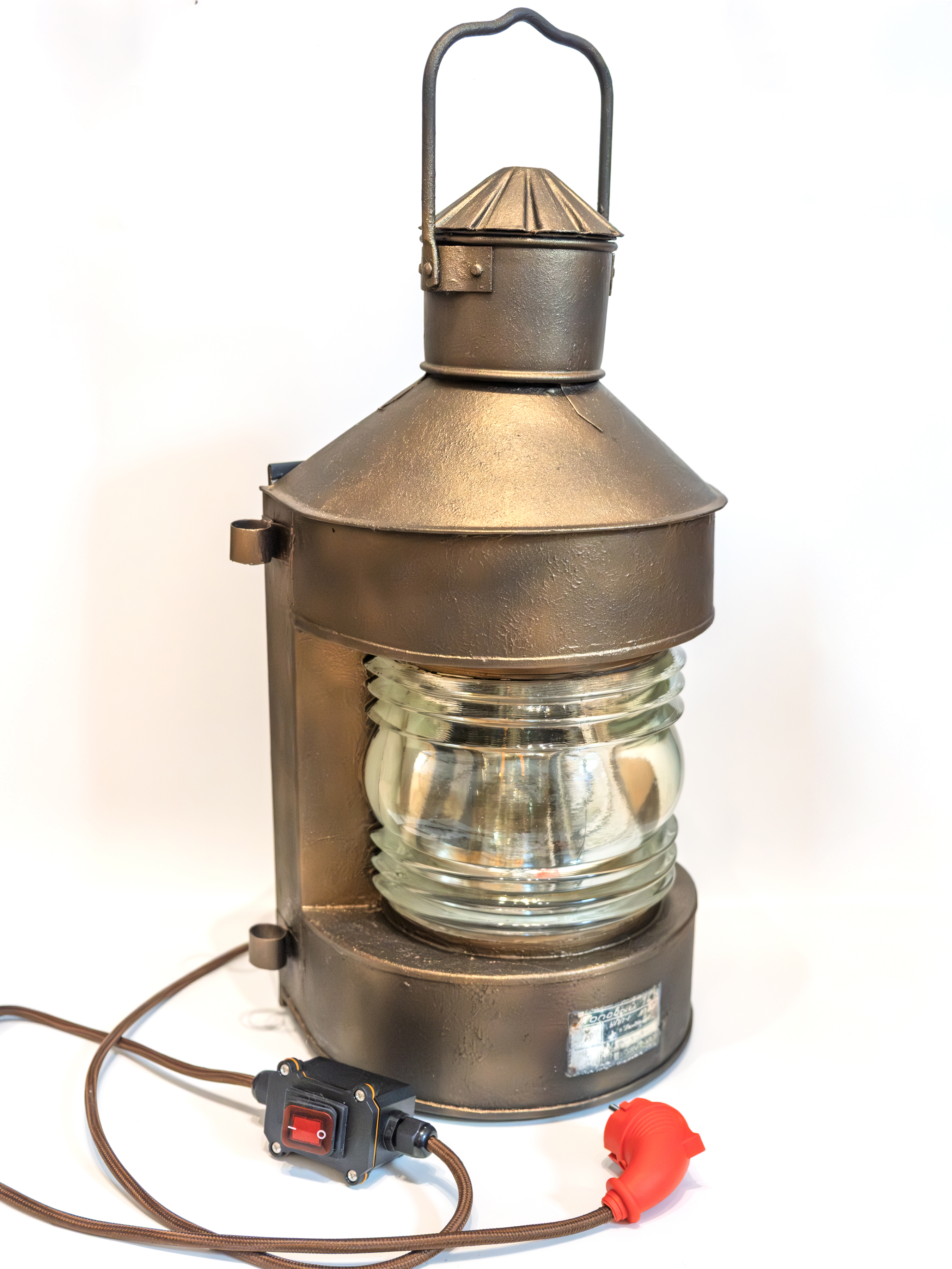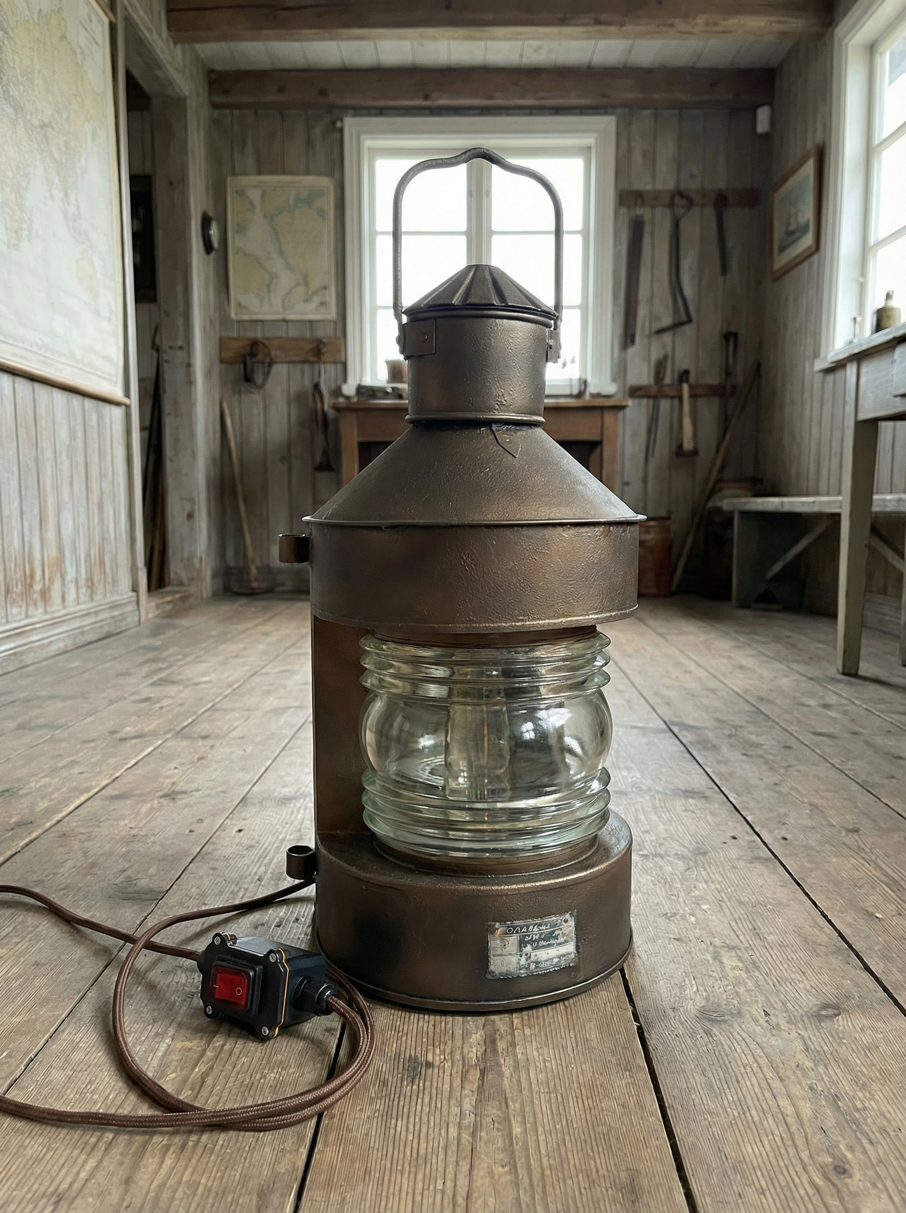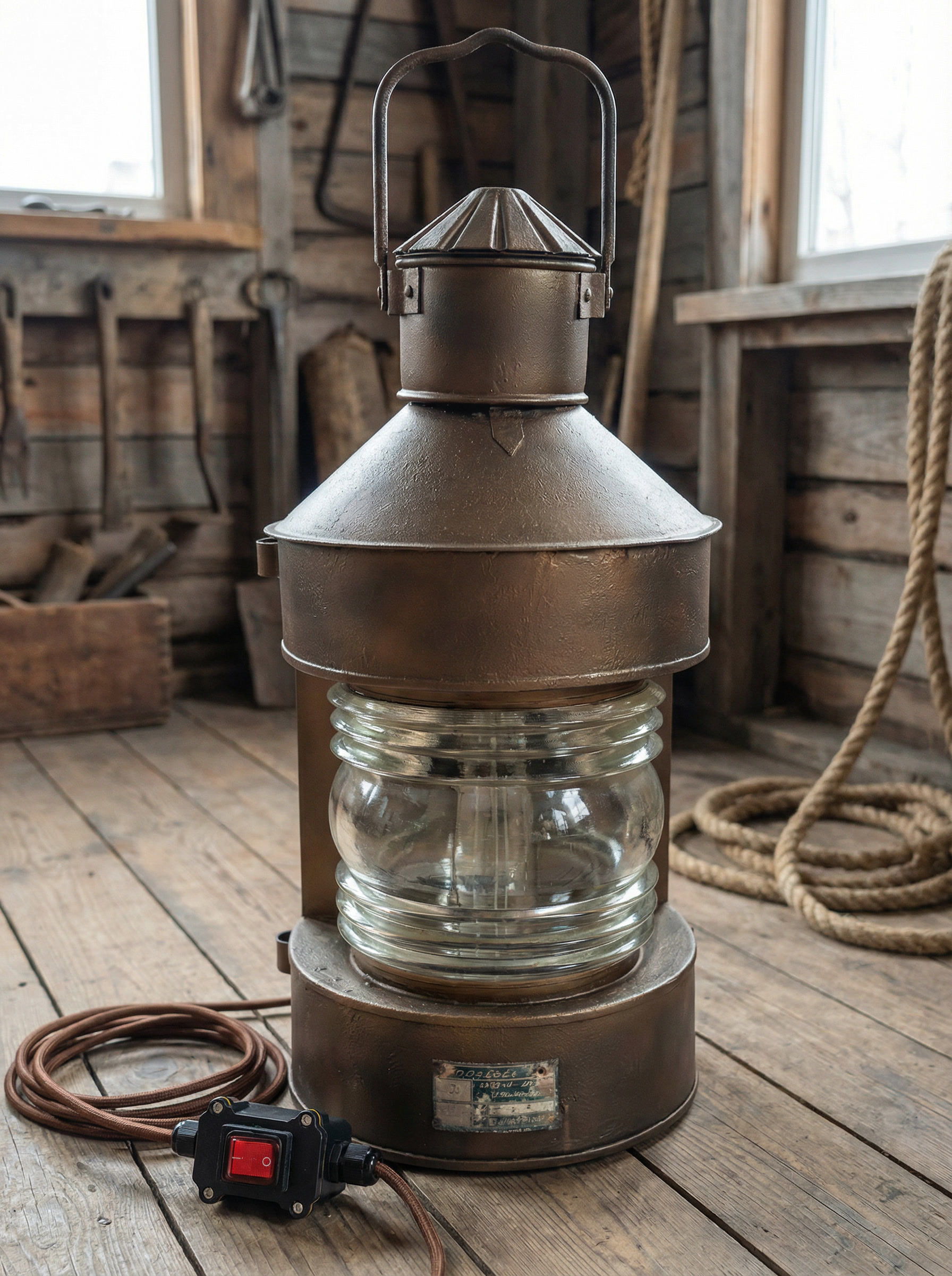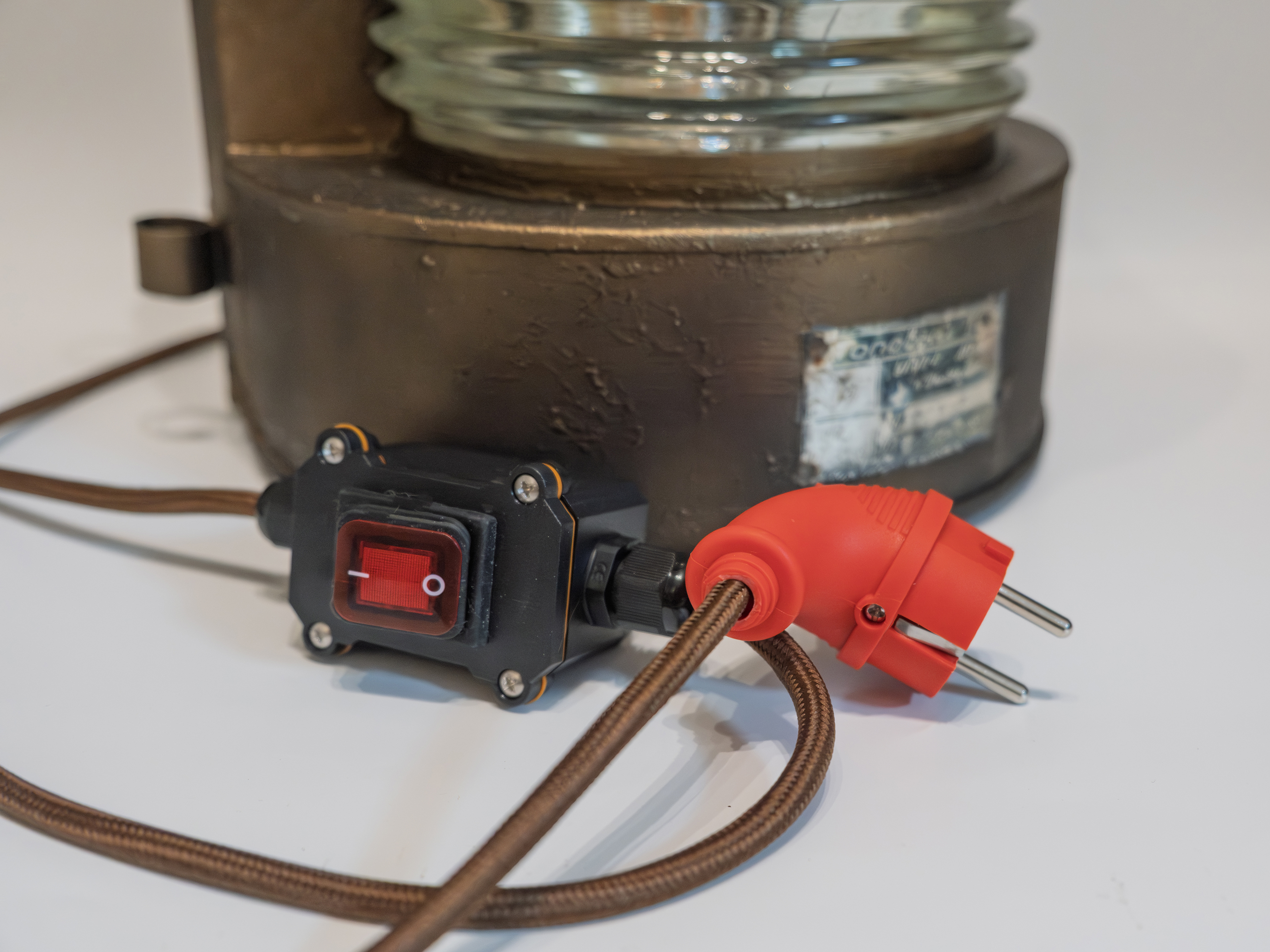 При адаптации под электрическое использование фонарь был аккуратно доработан. Установлен современный кабель в тканевой оплётке, надёжная силовая вилка и промышленный светящийся выключатель. Внутри используется винтажная лампа Эдисона с тёплой цветовой температурой, хорошо сочетающейся с оптикой и металлической фактурой корпуса.