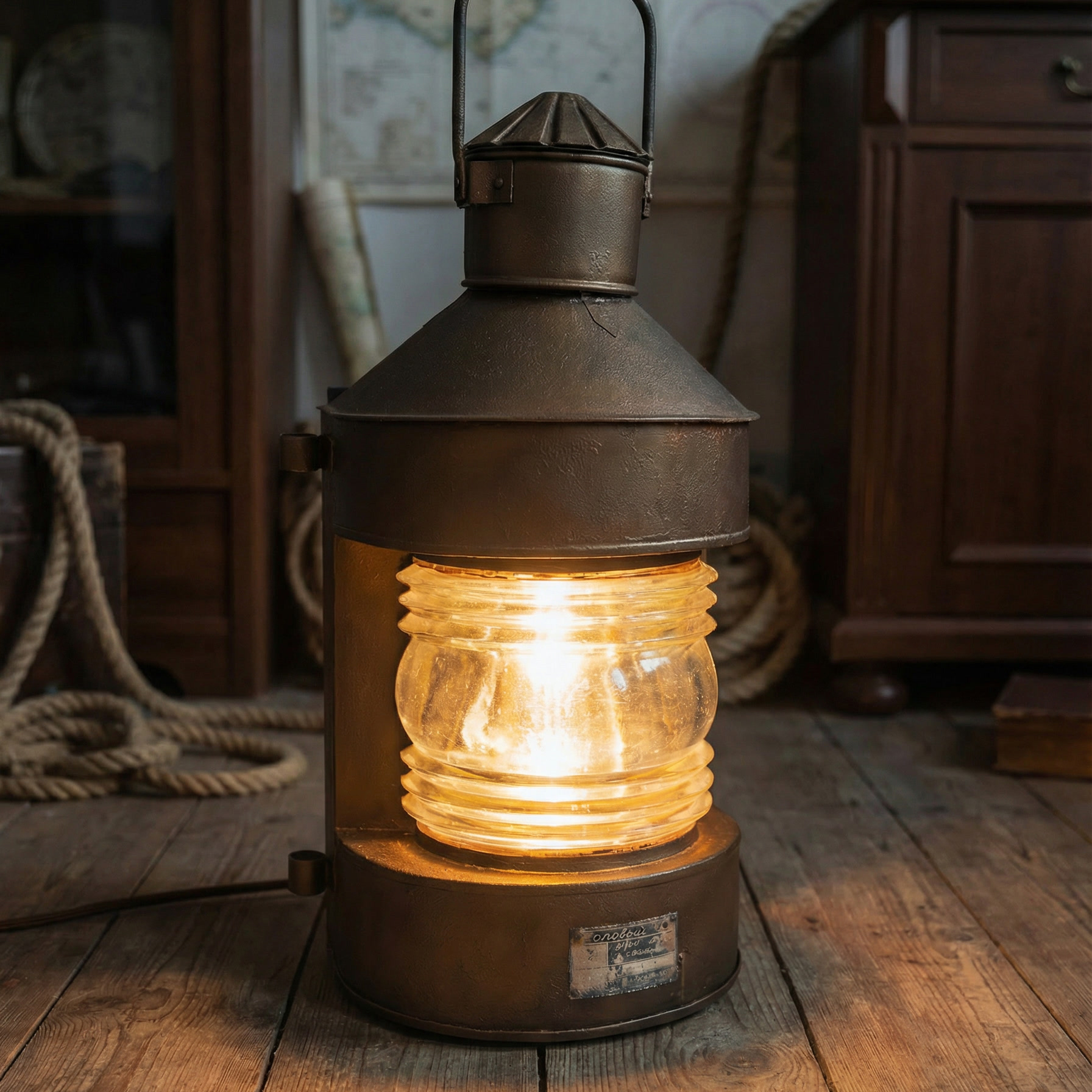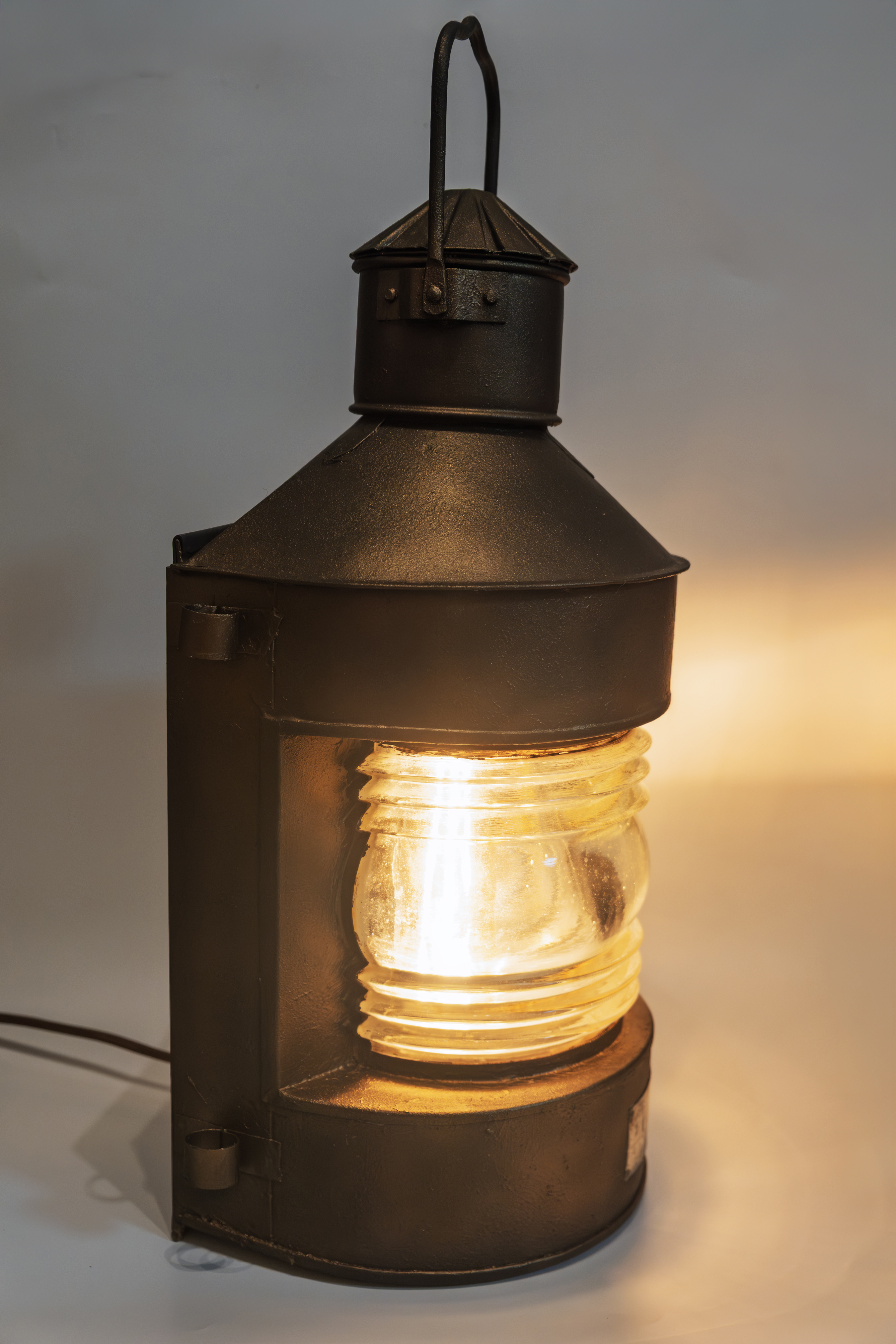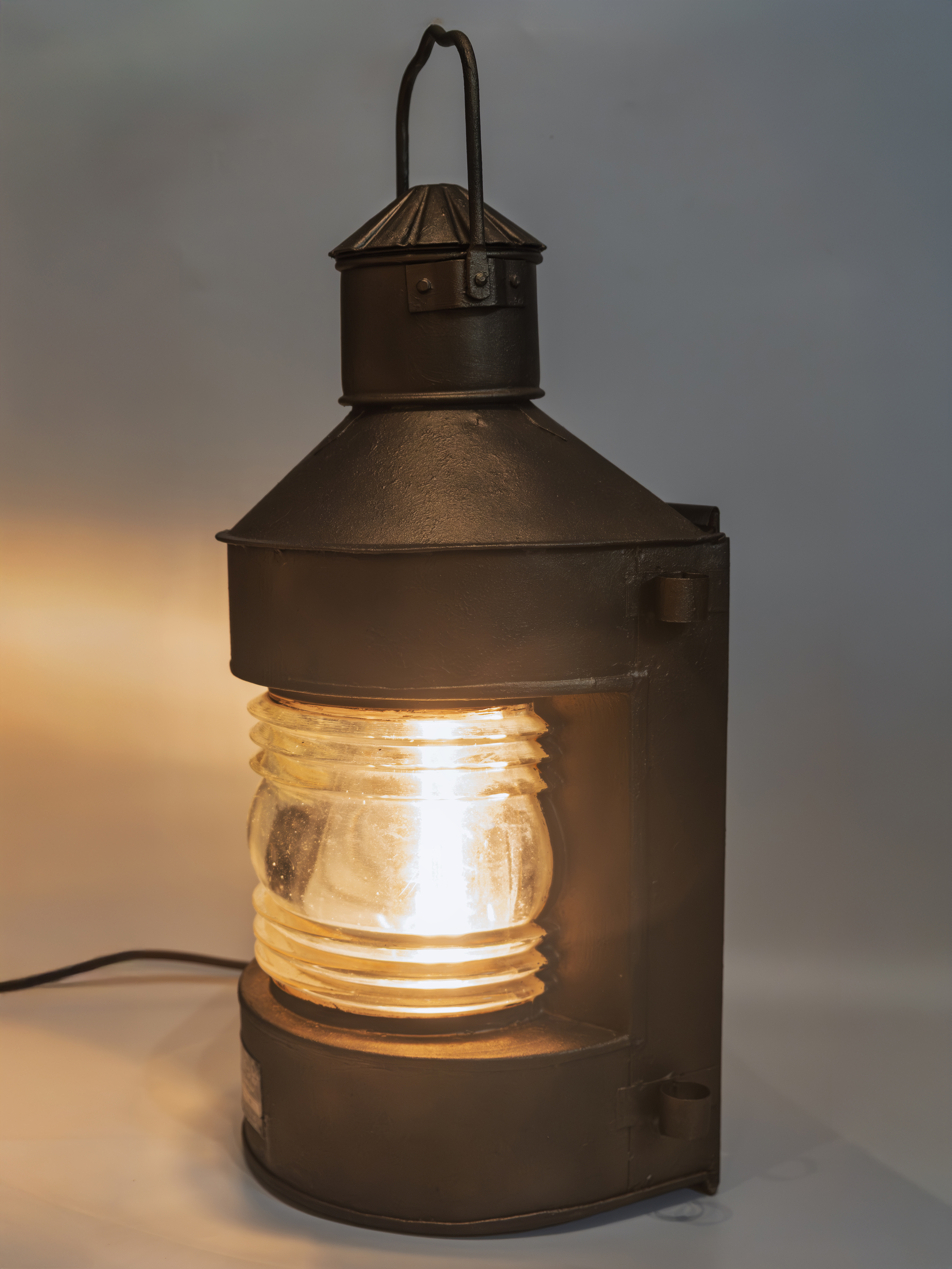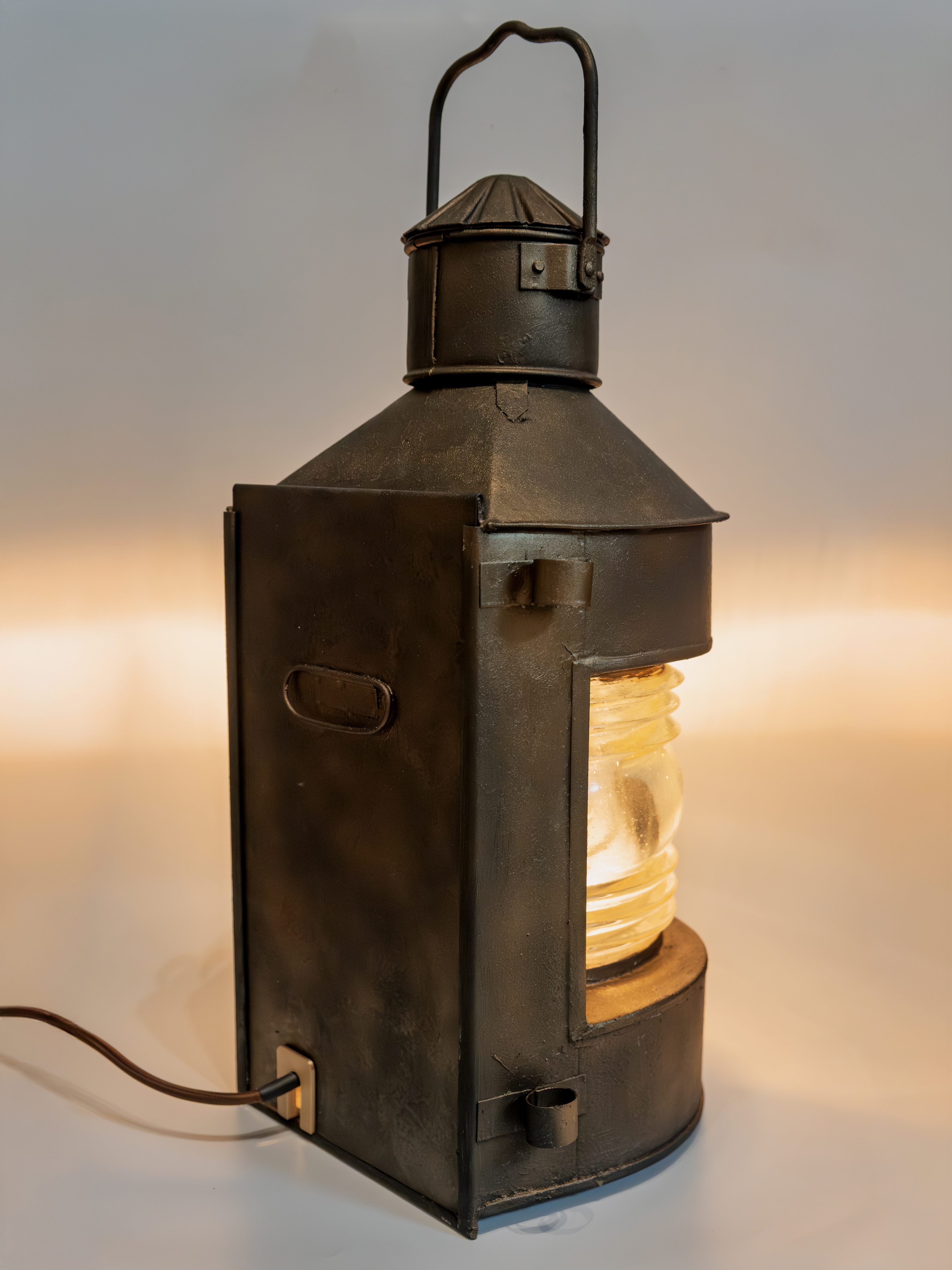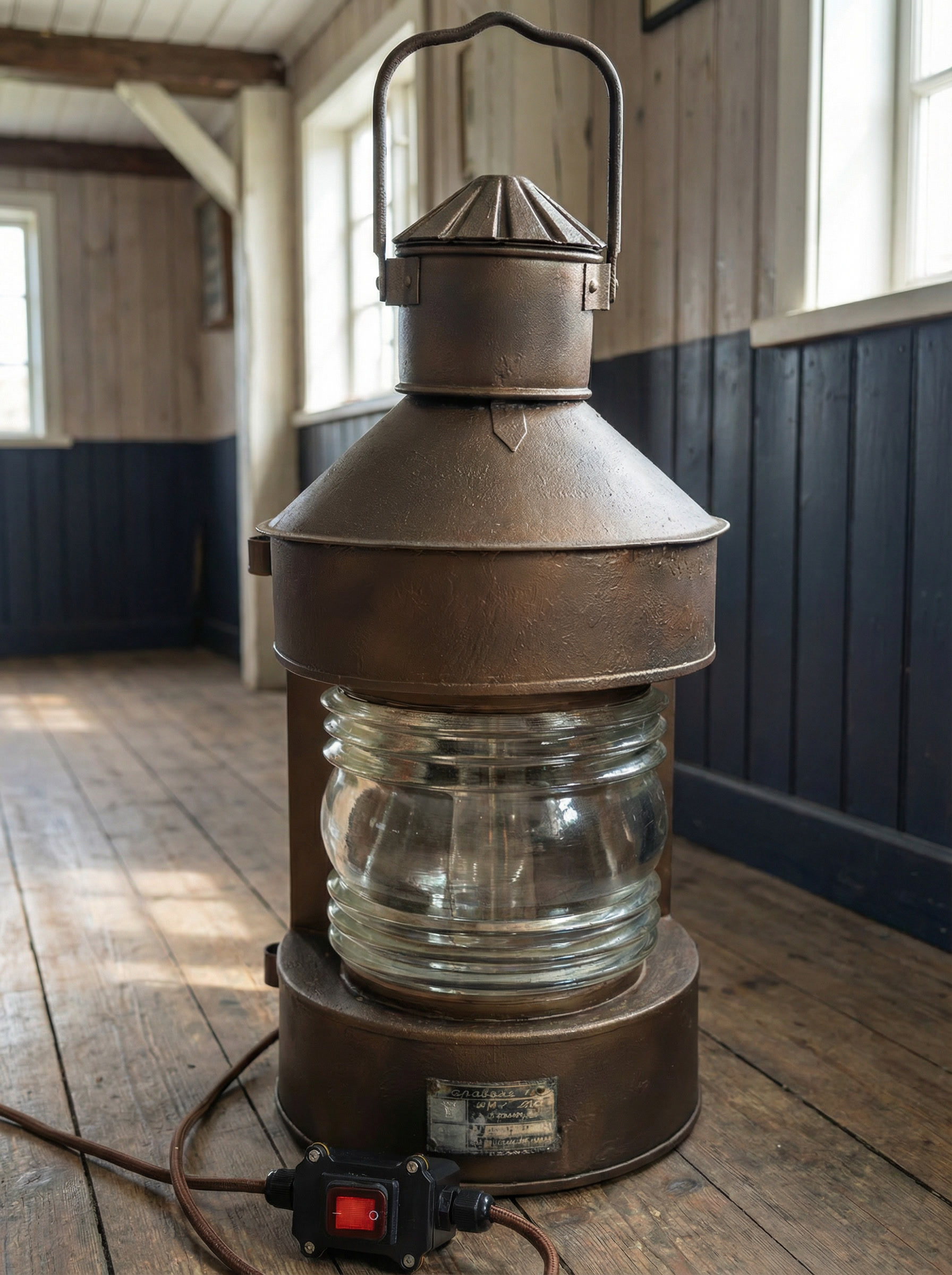 При адаптации под электрическое использование фонарь был аккуратно доработан. Установлен современный кабель в тканевой оплётке, надёжная силовая вилка и промышленный светящийся выключатель. Внутри используется винтажная лампа Эдисона с тёплой цветовой температурой, хорошо сочетающейся с оптикой и металлической фактурой корпуса.
