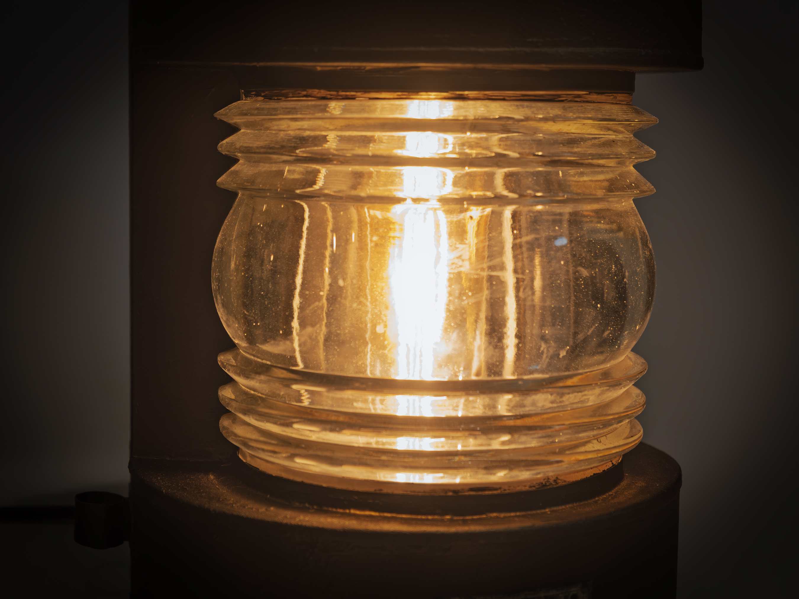 Оптический блок выполнен на основе стеклянной линзы Френеля. Подобные линзы применялись в навигационных огнях и маяках для формирования направленного и читаемого светового потока. В интерьере это даёт мягкий, объёмный свет с характерной глубиной и визуальной плотностью.