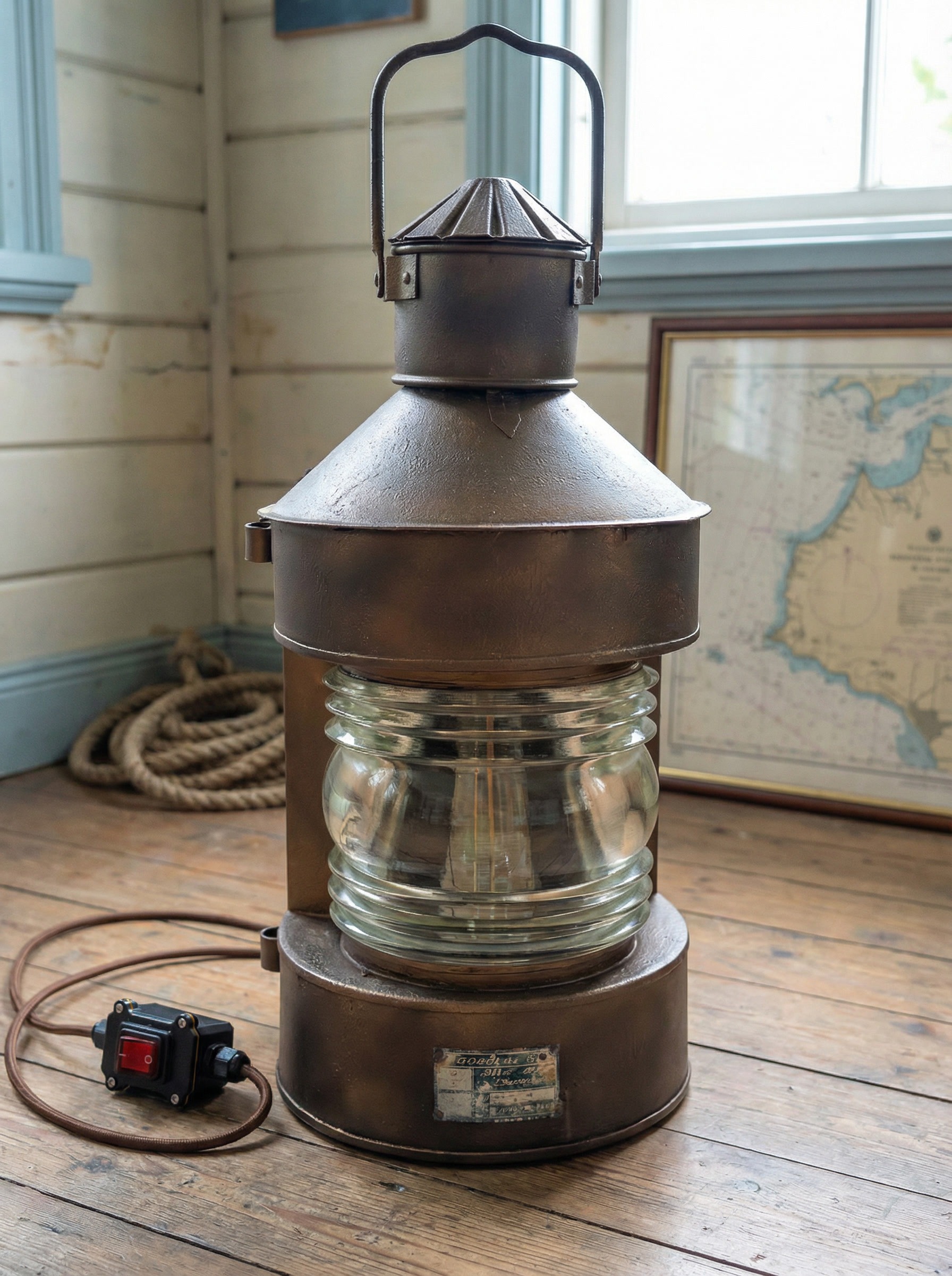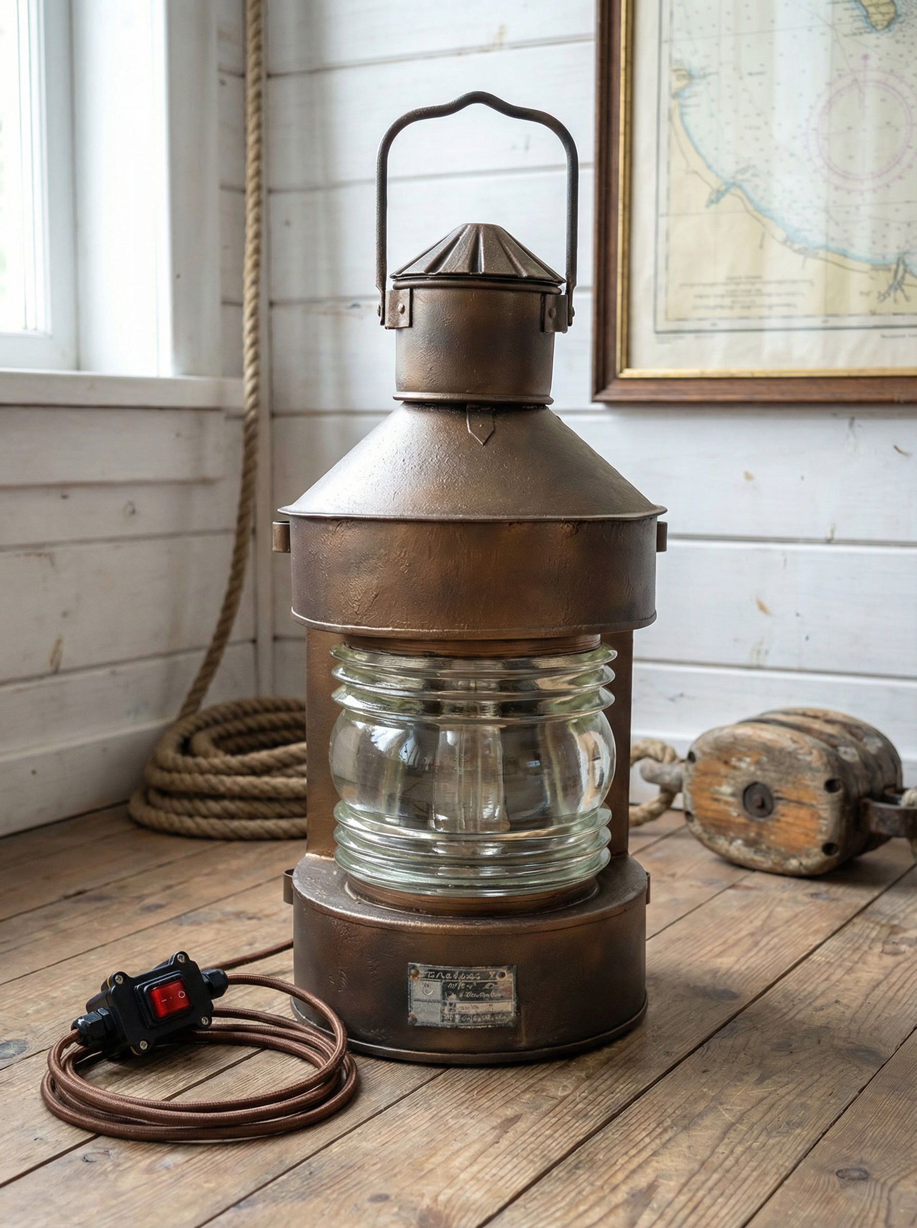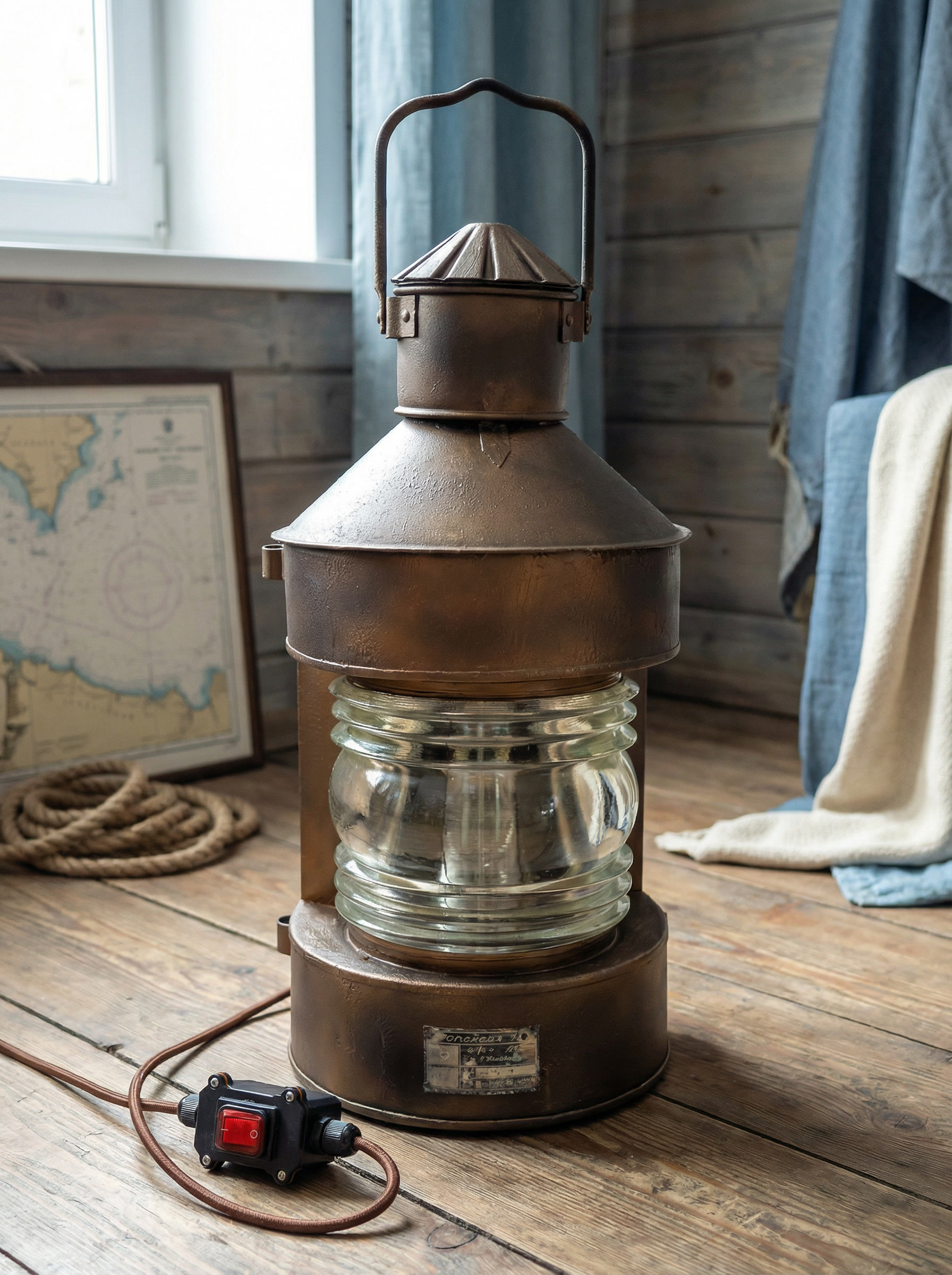 Этот объект рассчитан на размещение на полу или низких поверхностях. Он подходит для интерьеров в морской, индустриальной или лофт-эстетике, для частных пространств, мастерских и общественных помещений. Благодаря своему масштабу и происхождению он воспринимается не как декоративный светильник, а как самостоятельный интерьерный акцент с реальной историей.