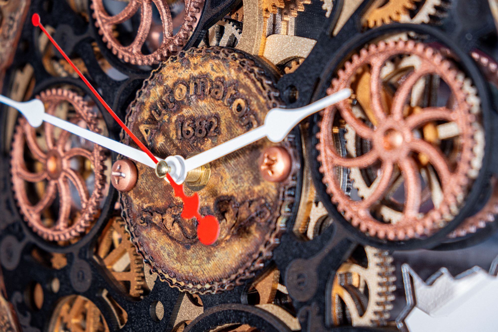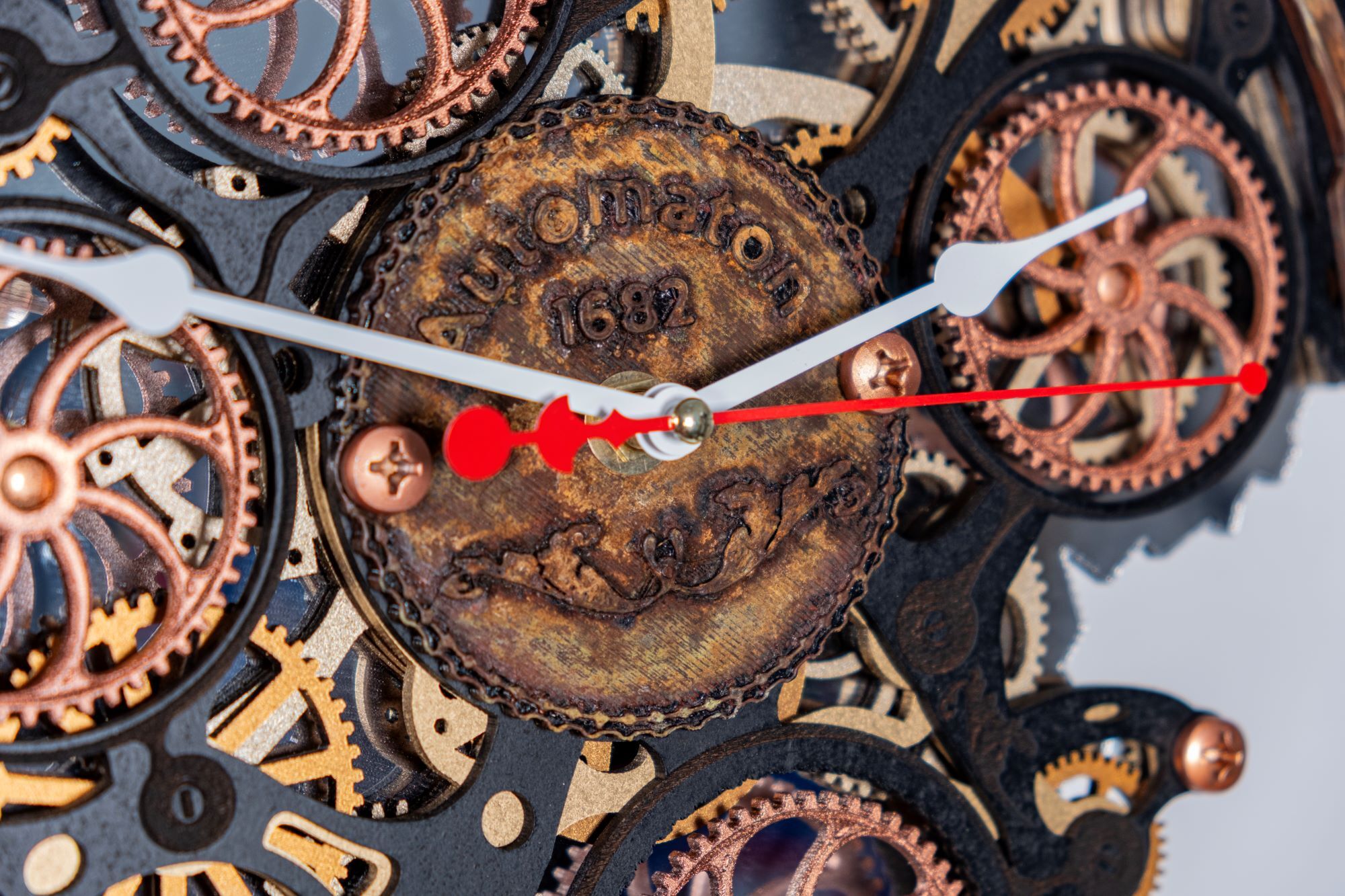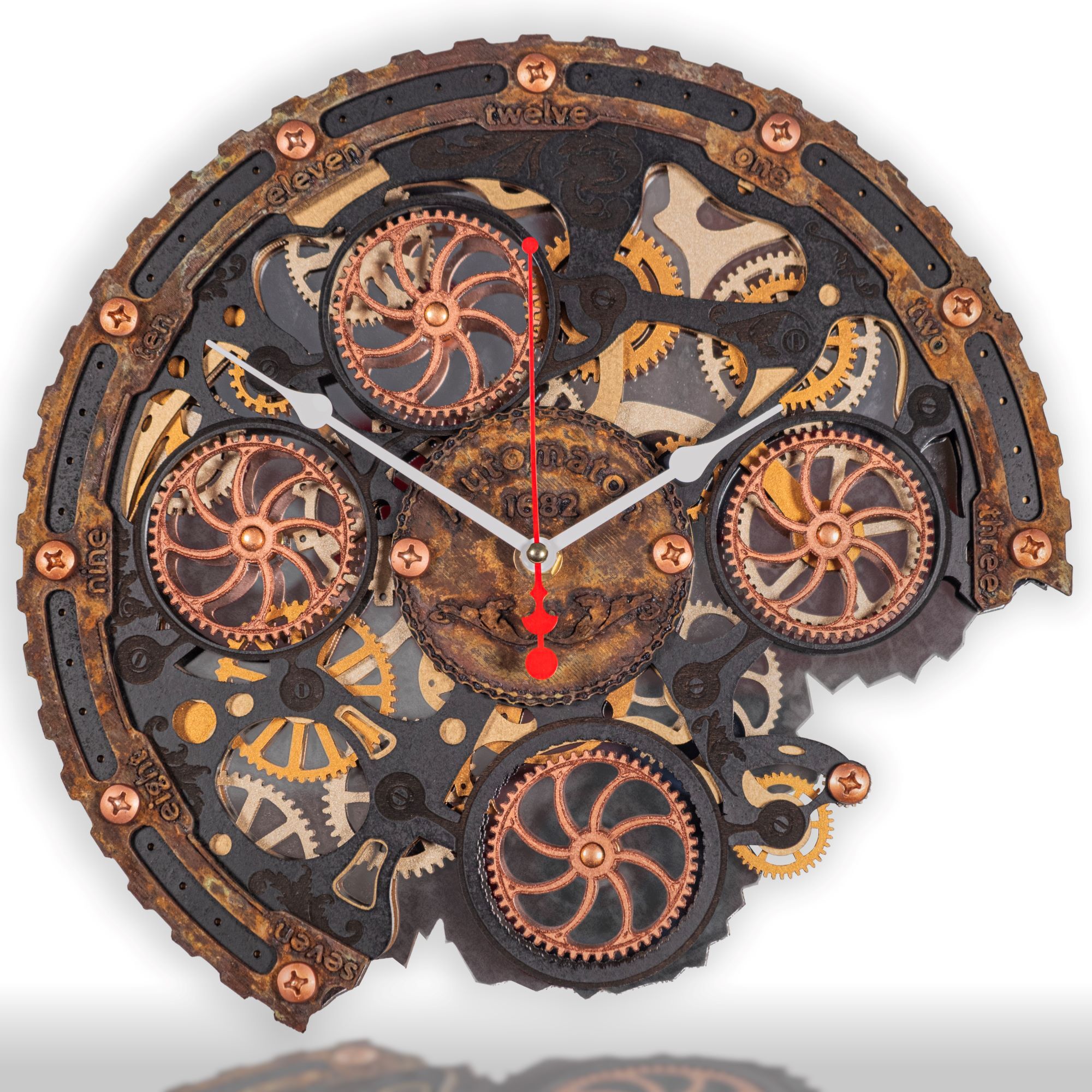 Настенные часы ручной работы "Автоматон Байт 1682" серии "Underwater" (Подводный мир) с вращающимися шестеренками представляют собой небольшую кинетическую настенную инсталляцию. Основные элементы корпуса изготовлены из МДФ и дерева, элементы фасада созданы по технологии 3D печати, покрыты вручную тонким слоем метала по авторской технологии, а затем состарены химическим способом для образования эффекта морской ржавчины и окиси. Для усиления визуального объема мы используем нижний слой из акрилового зеркала, в котором отражается вращение четырех основных шестеренок.