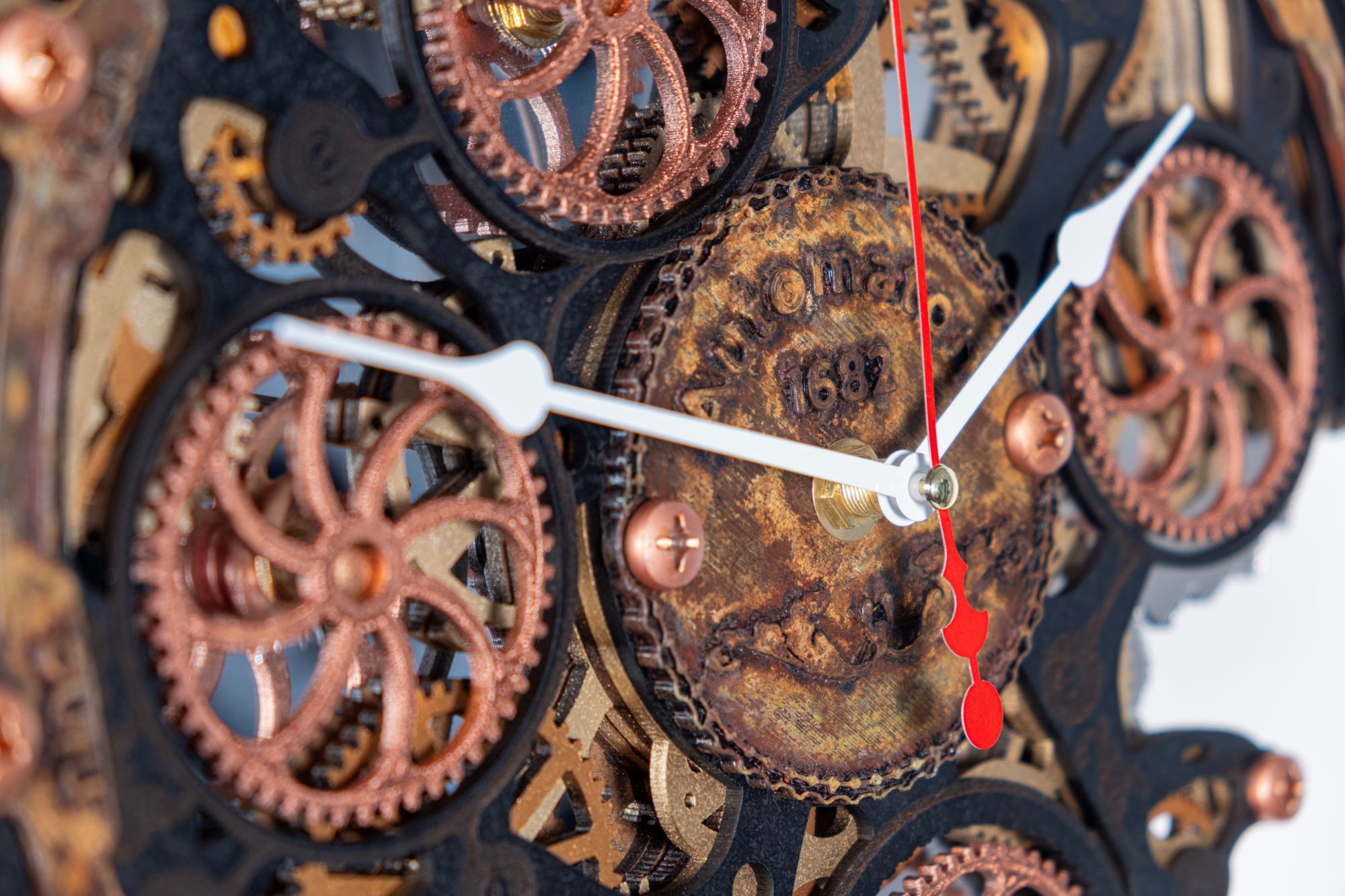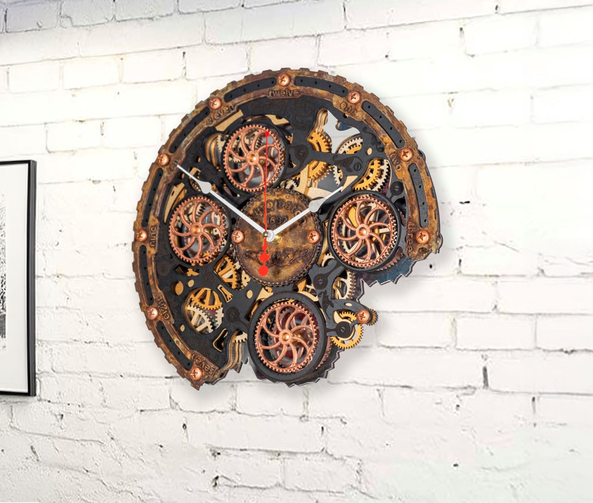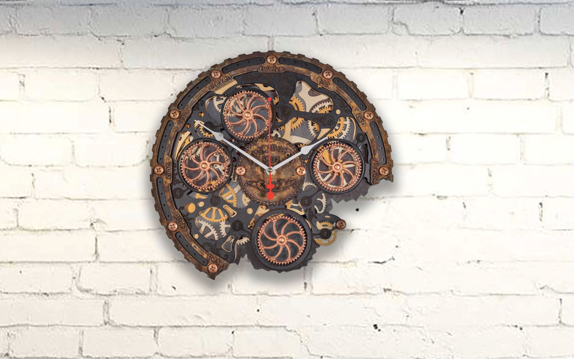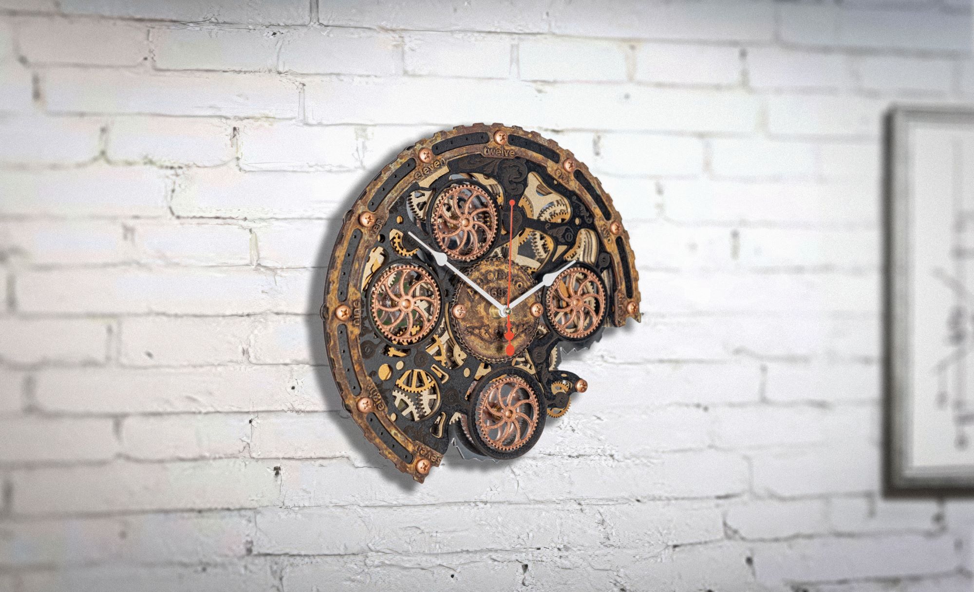Настенные часы ручной работы "Автоматон Байт 1682" серии "Underwater" (Подводный мир) с вращающимися шестеренками представляют собой небольшую кинетическую настенную инсталляцию. Основные элементы корпуса изготовлены из МДФ и дерева, элементы фасада созданы по технологии 3D печати, покрыты вручную тонким слоем метала по авторской технологии, а затем состарены химическим способом для образования эффекта морской ржавчины и окиси. Для усиления визуального объема мы используем нижний слой из акрилового зеркала, в котором отражается вращение четырех основных шестеренок.