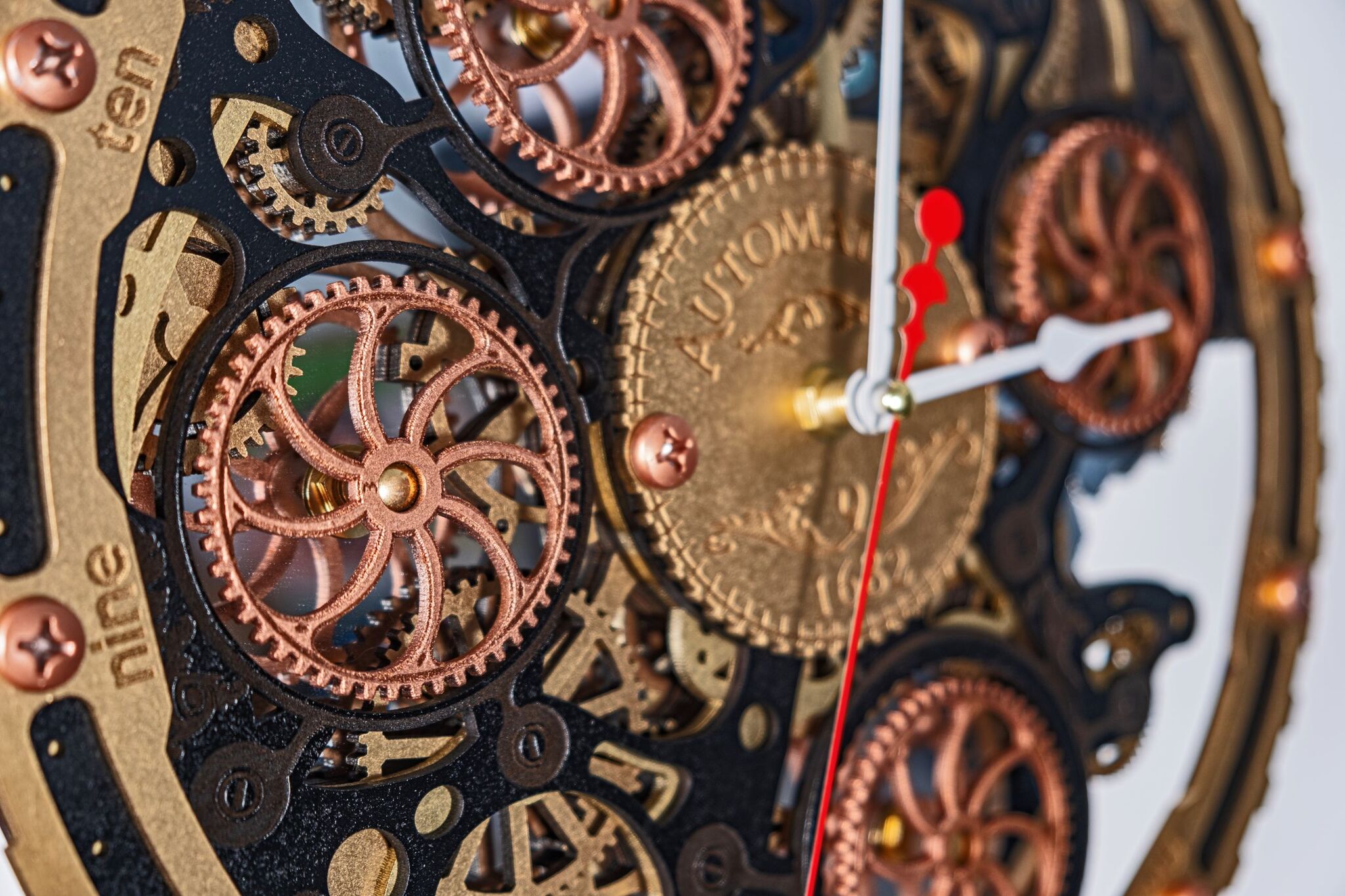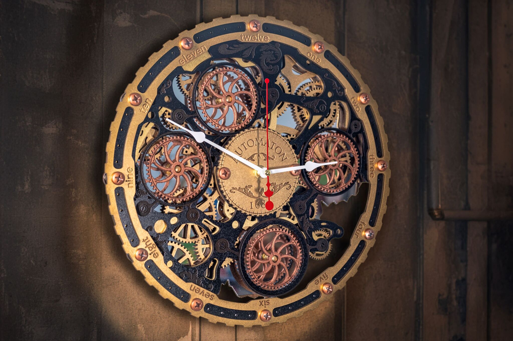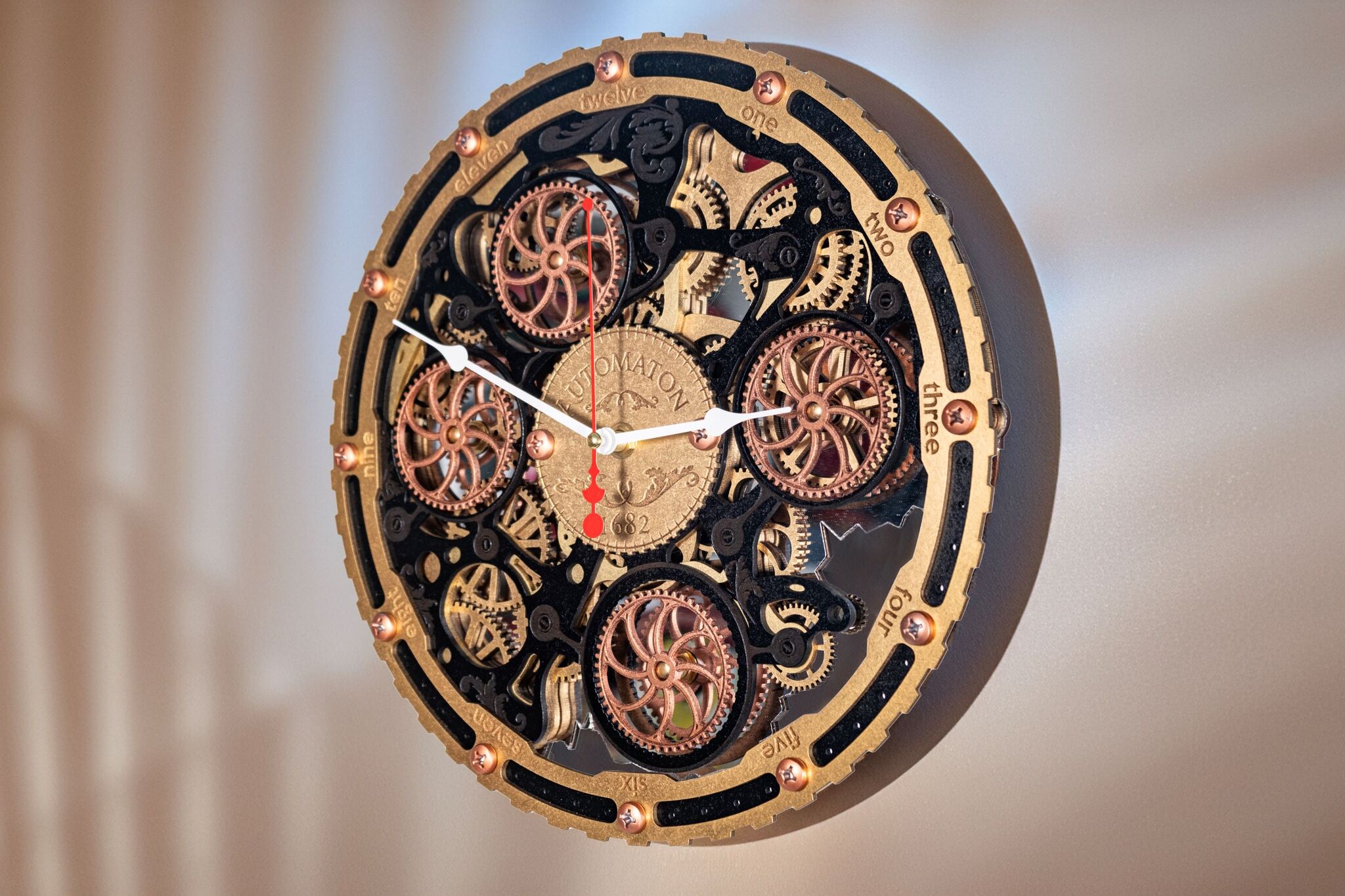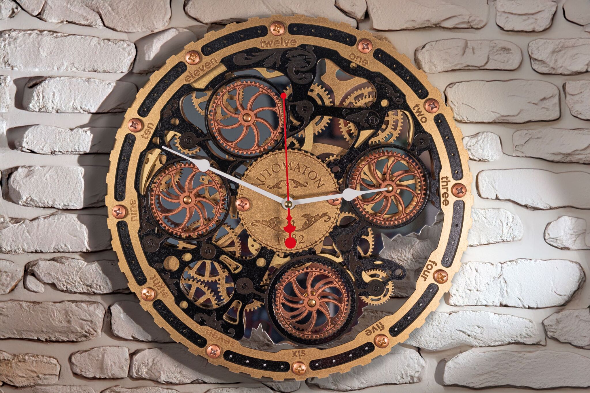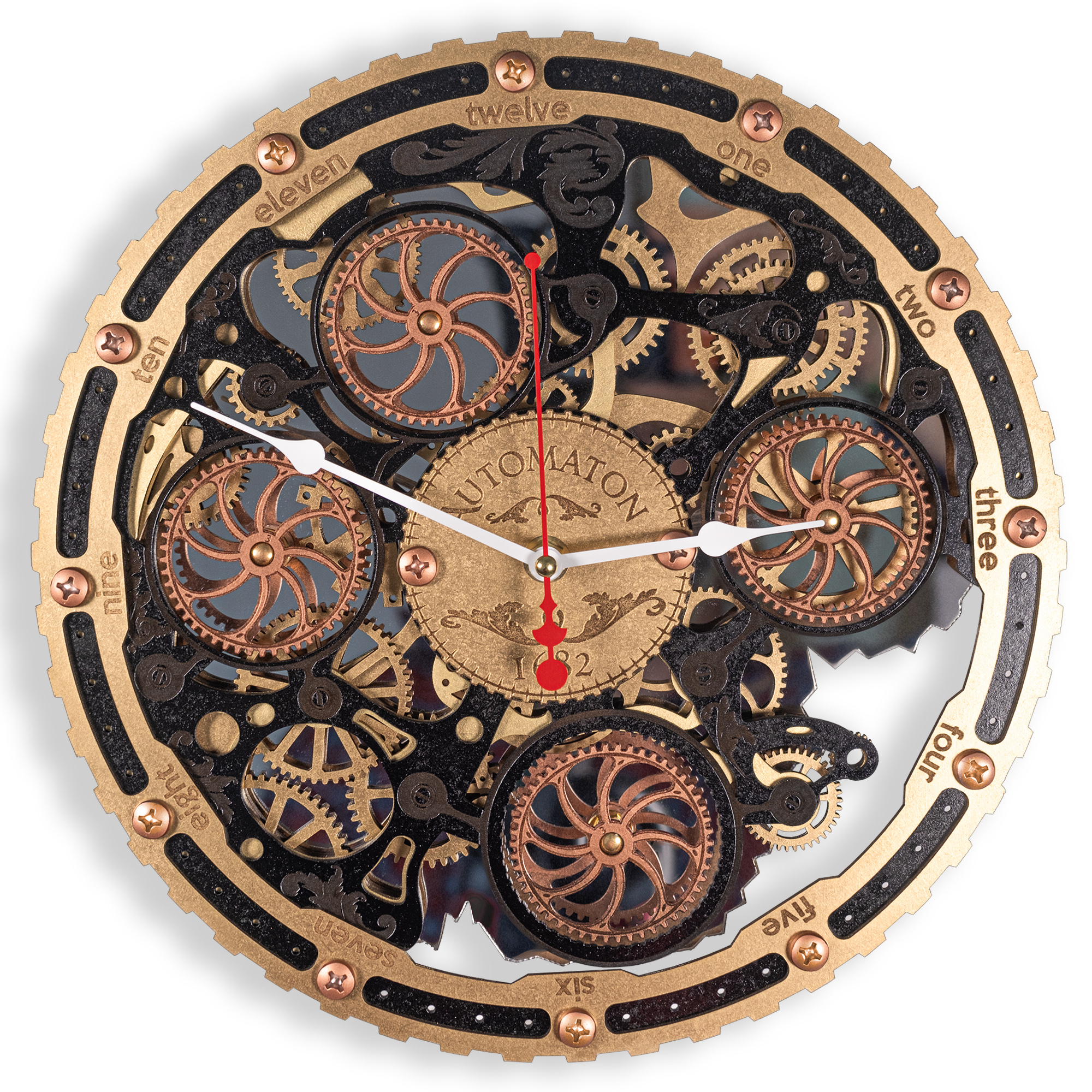 Настенные часы ручной работы "Автоматон Байт 1682" с вращающимися шестеренками представляют собой небольшую кинетическую настенную инсталляцию. Изготовлены из МДФ и дерева, для усиления визуального эффекта вращения четырех основных шестеренок используется нижний слой из акрилового зеркала.