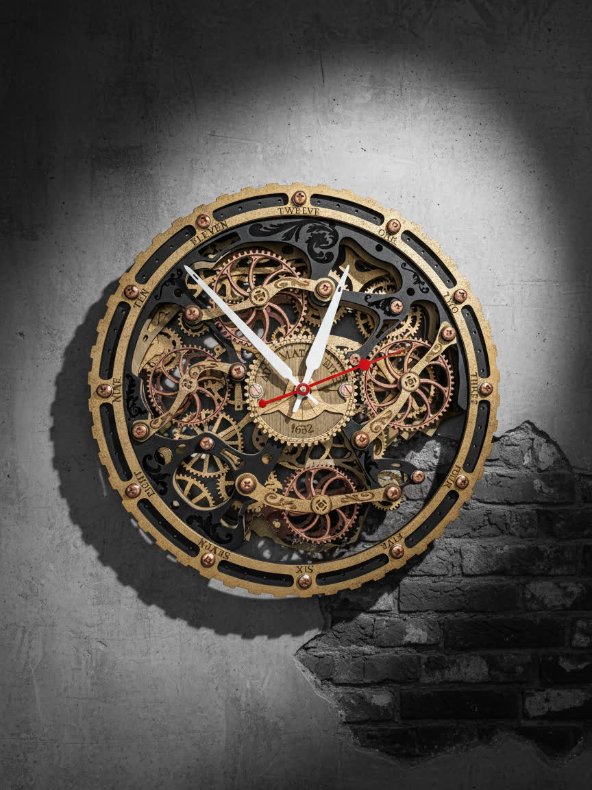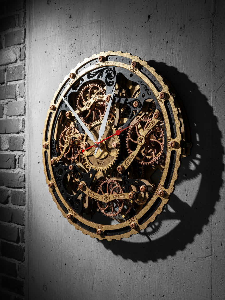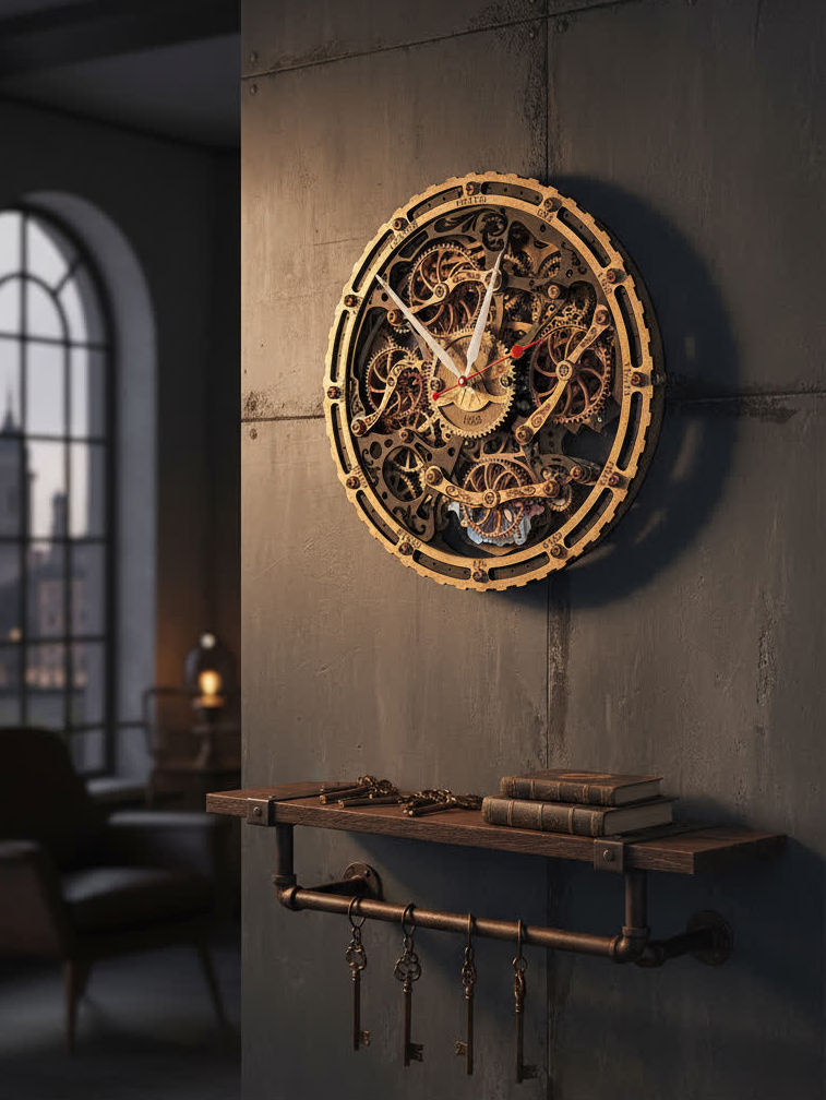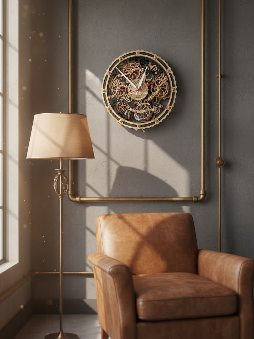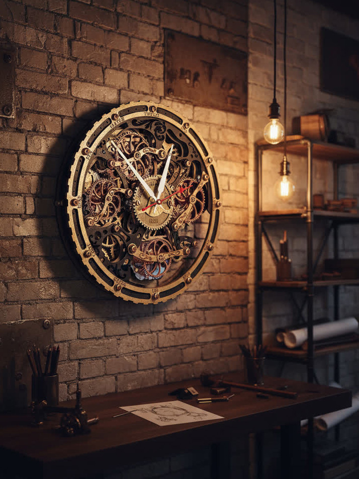 Вдохновением для создания этих часов послужили старинные часы с открытым механизмом, которые символизируют постоянство и движение времени. Открытые шестерёнки на циферблате и винтажная чёрно-золотая палитра дизайна передают дух индустриальной эпохи, оживляя пространство нотками стимпанка.