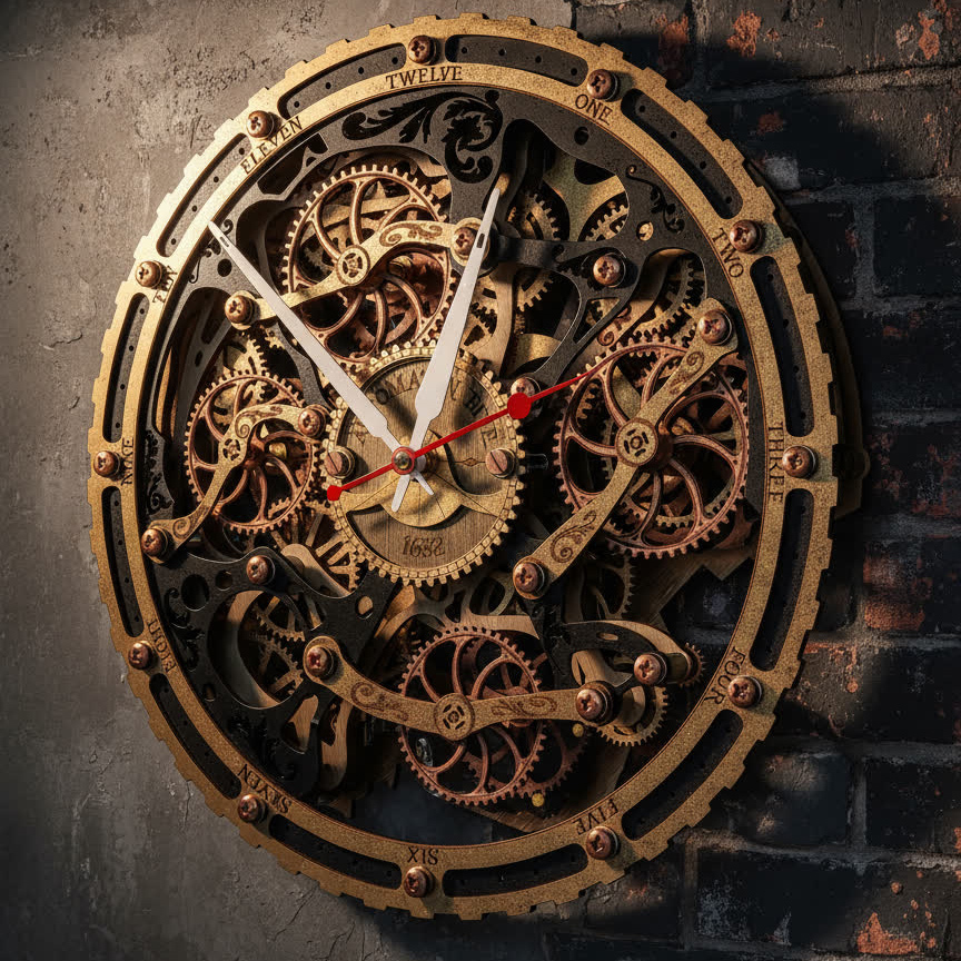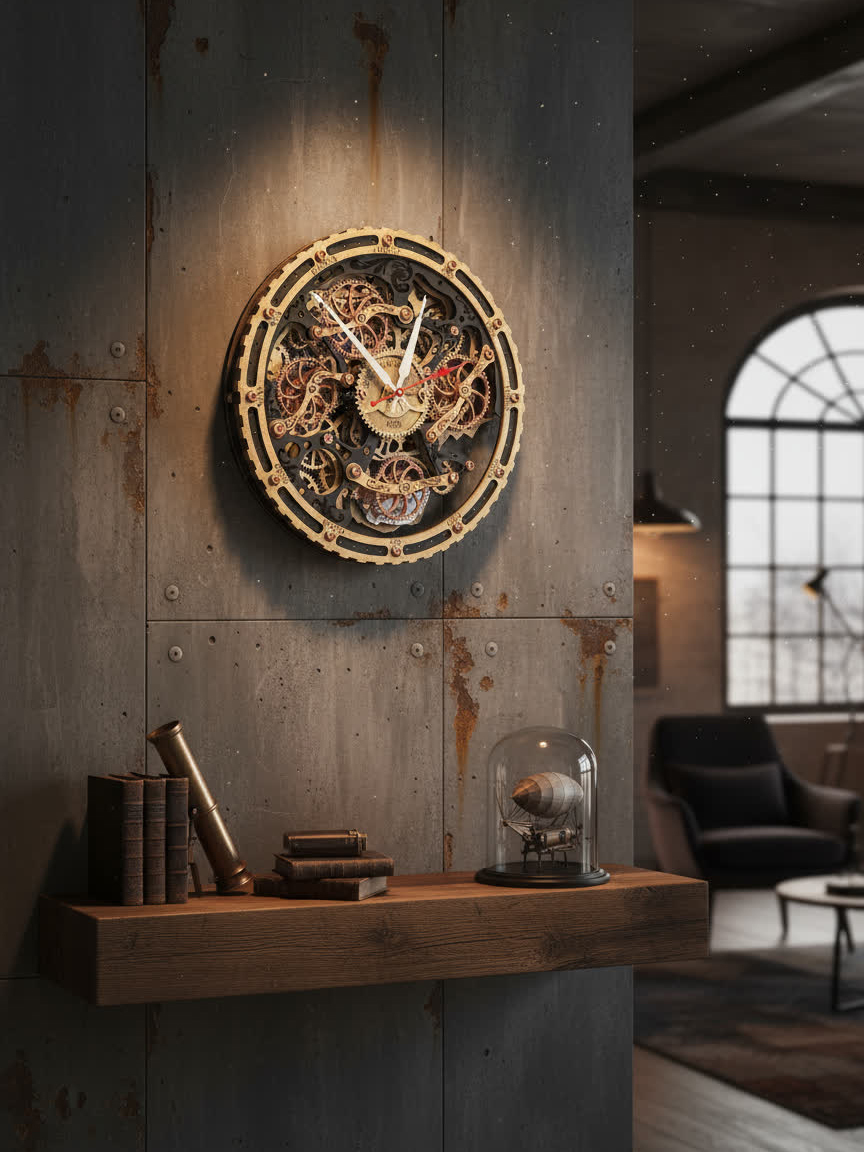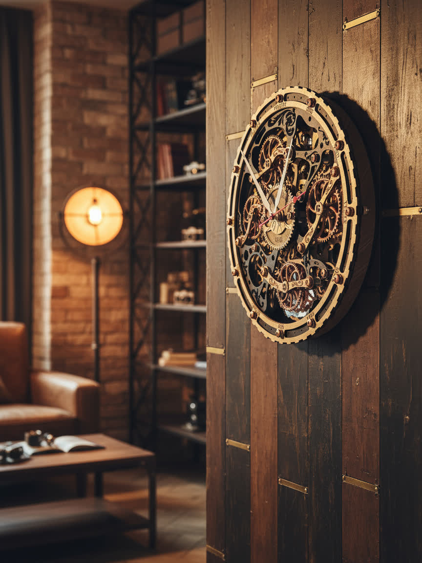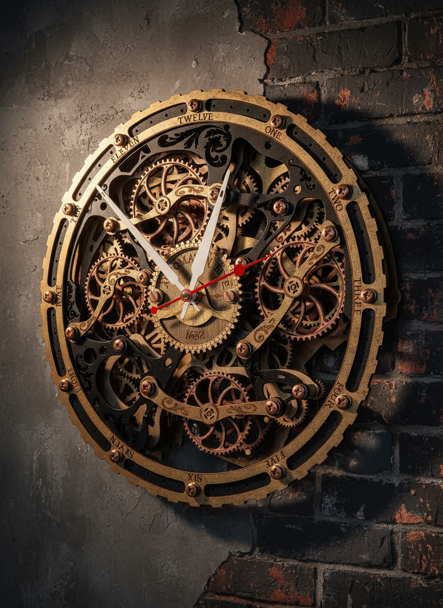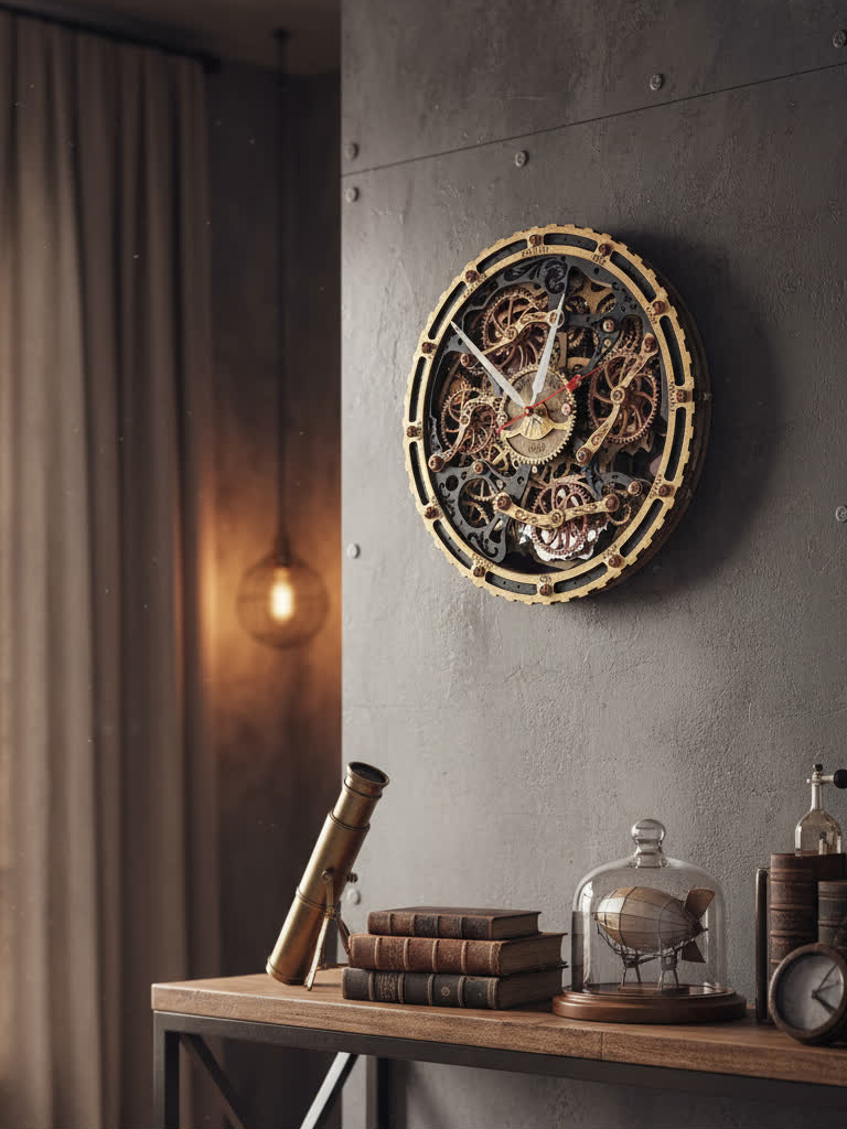 Вдохновением для создания этих часов послужили старинные часы с открытым механизмом, которые символизируют постоянство и движение времени. Открытые шестерёнки на циферблате и винтажная чёрно-золотая палитра дизайна передают дух индустриальной эпохи, оживляя пространство нотками стимпанка.