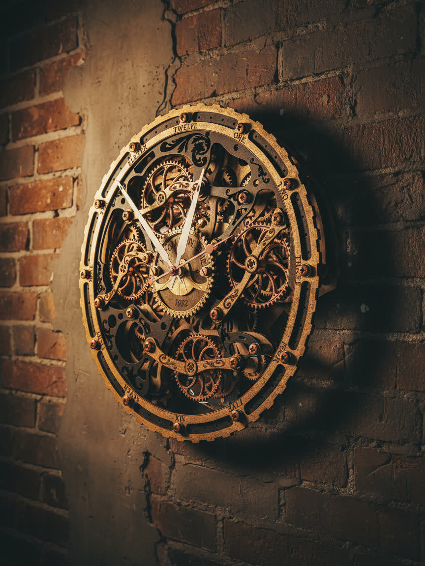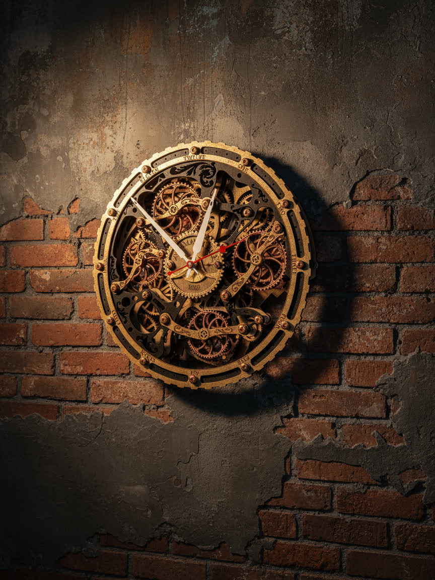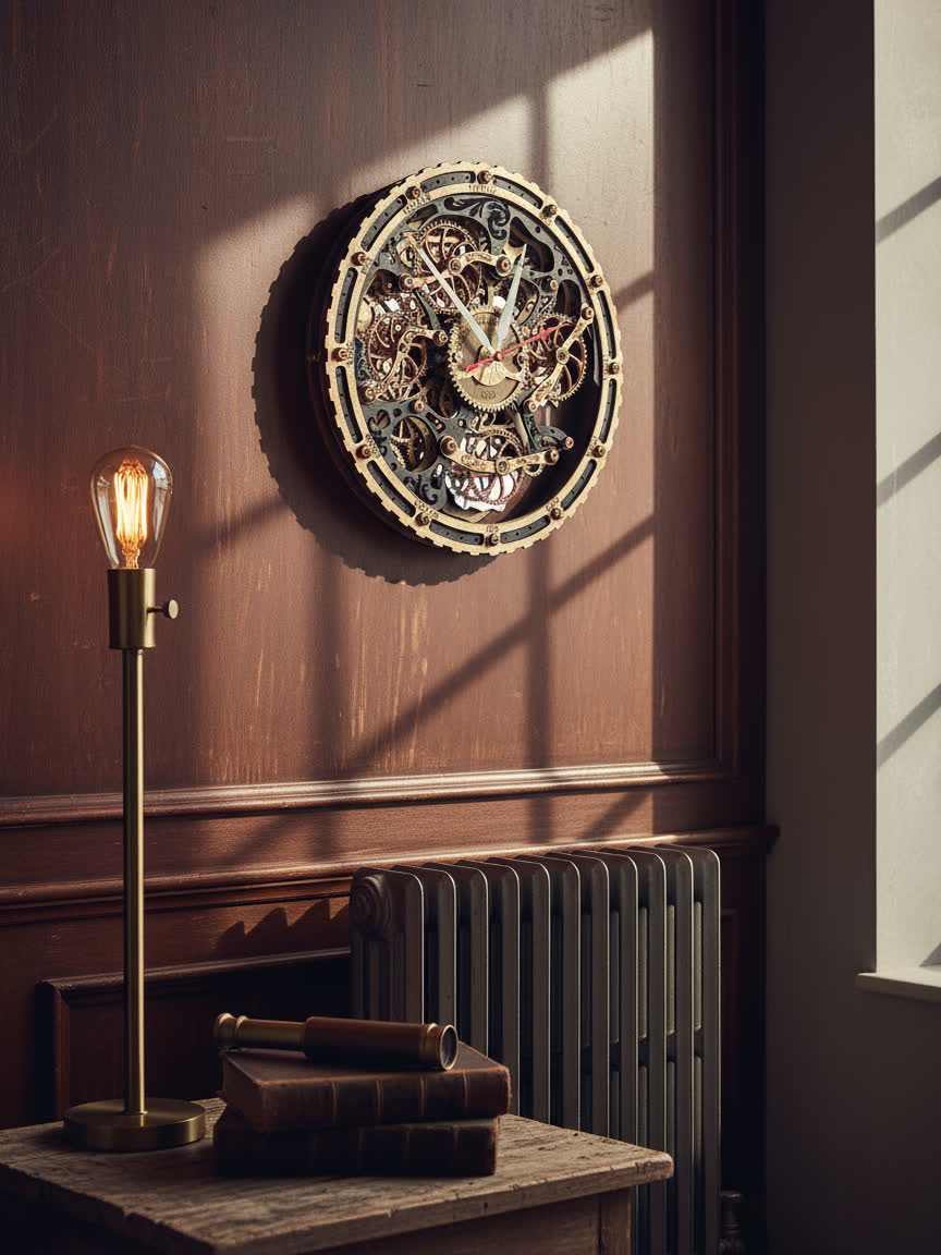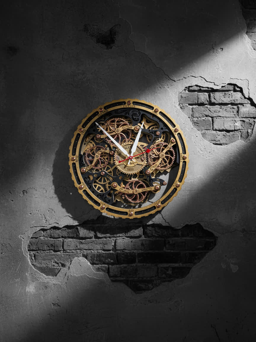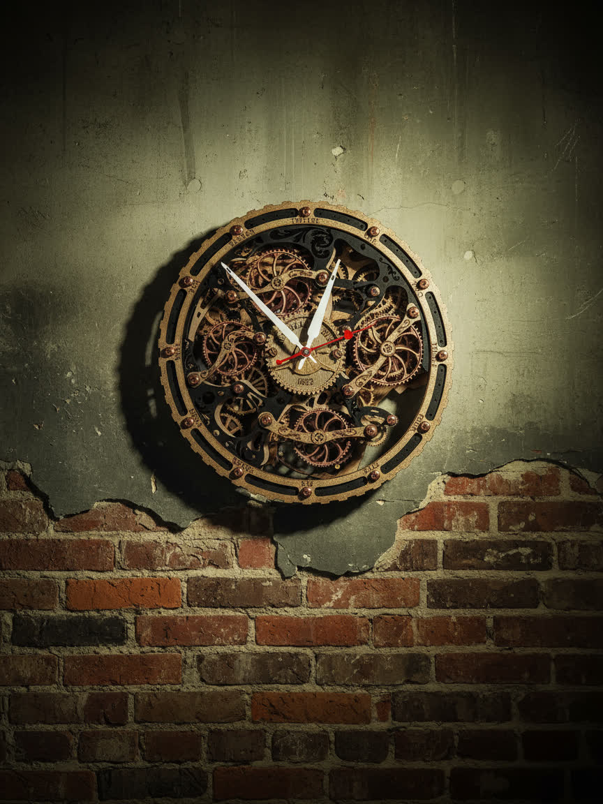 Вдохновением для создания этих часов послужили старинные часы с открытым механизмом, которые символизируют постоянство и движение времени. Открытые шестерёнки на циферблате и винтажная чёрно-золотая палитра дизайна передают дух индустриальной эпохи, оживляя пространство нотками стимпанка.