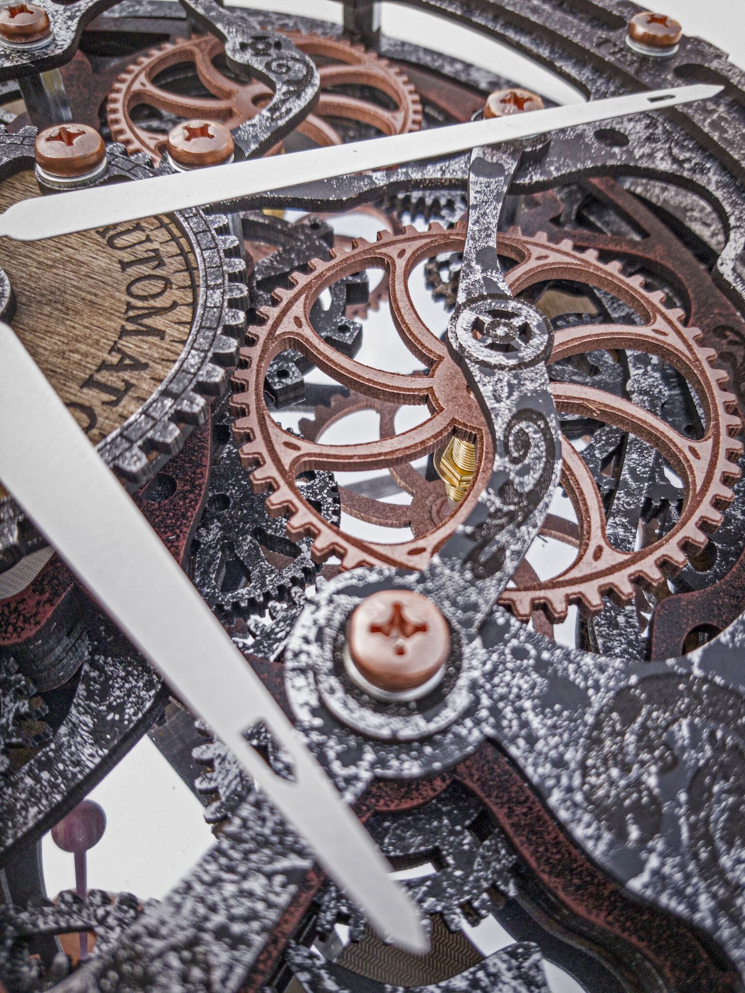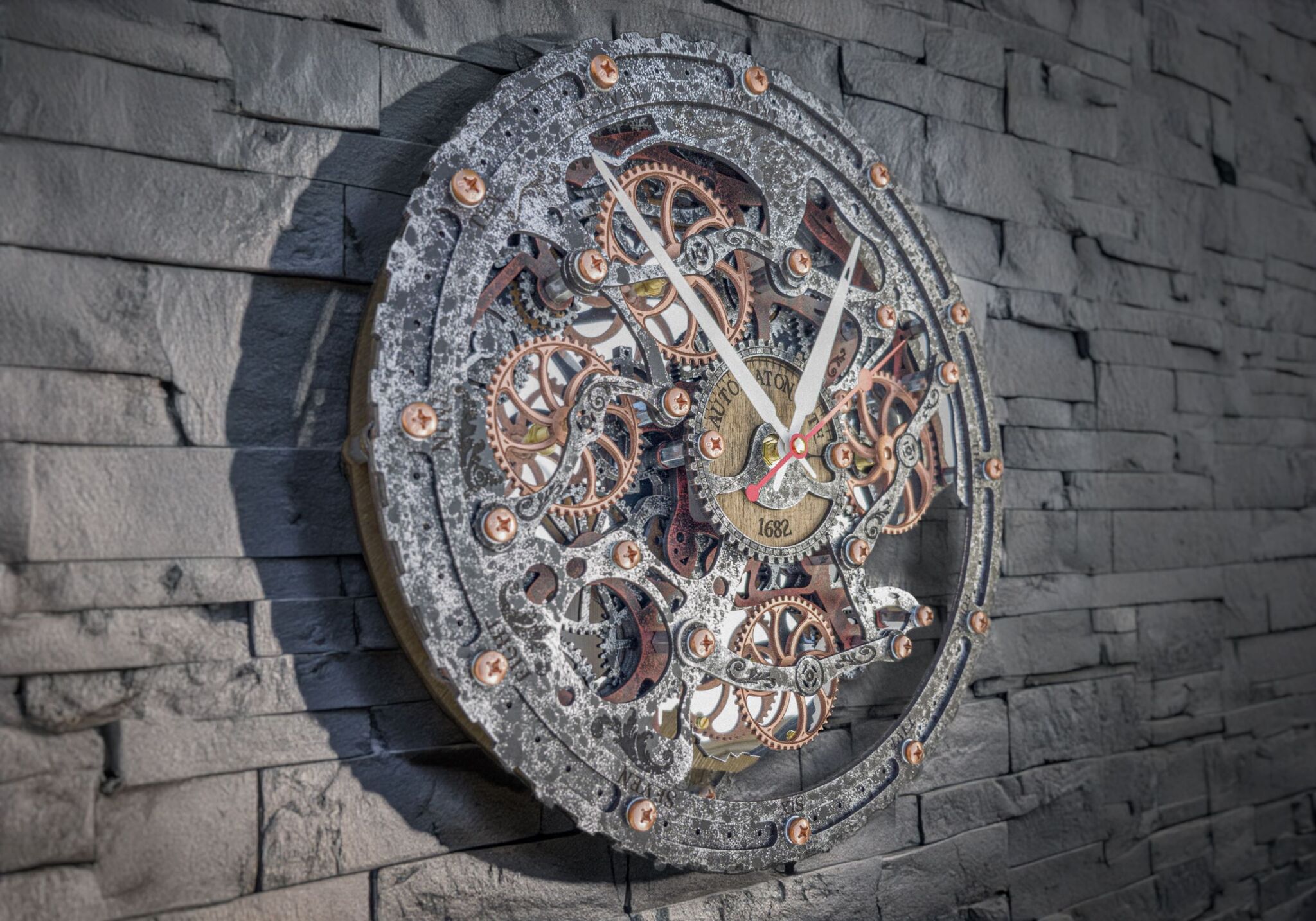 Эта модель выпускается ограниченным тиражом, что делает каждый экземпляр по-своему редким. Часы станут эффектным центром любого интерьера – будь то гостиная, офис или творческая студия – и особенно удачно дополнят обстановку в стиле лофт или ретро-футуризм. По желанию, циферблат можно персонализировать: мы нанесём на него ваше имя или дату вместо надписи «Automaton», добавив изделию индивидуальности. Наши мастера создают эти часы вручную в собственной российской мастерской, вкладывая душу в каждую деталь. Такой предмет декора предназначен для настоящих ценителей оригинального дизайна и качественной крафтовой работы.