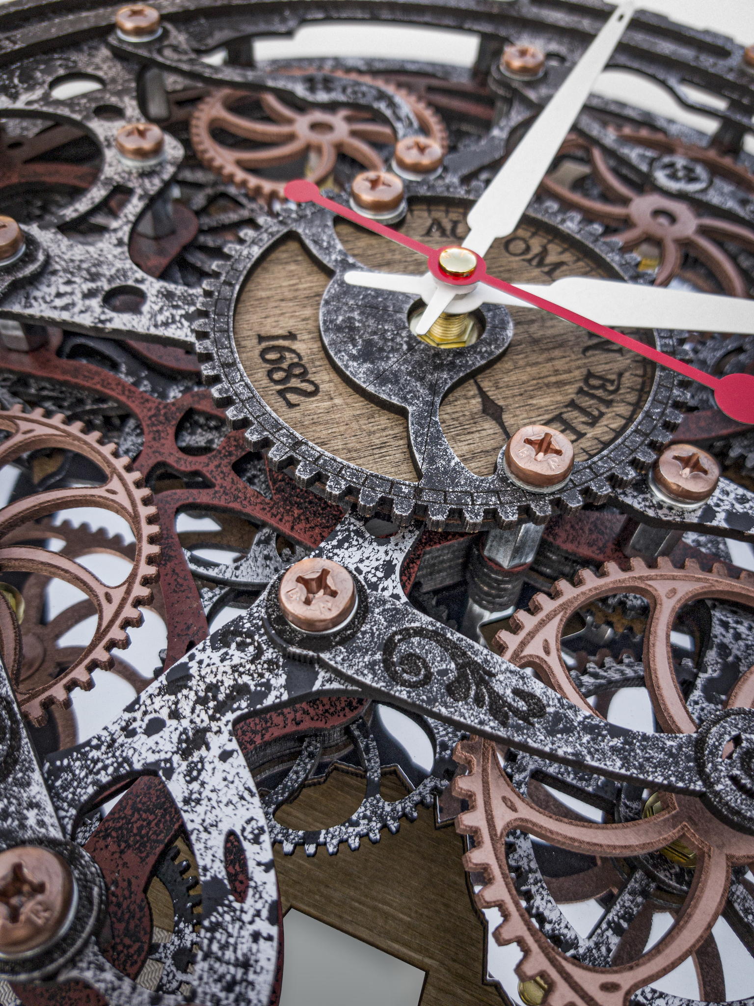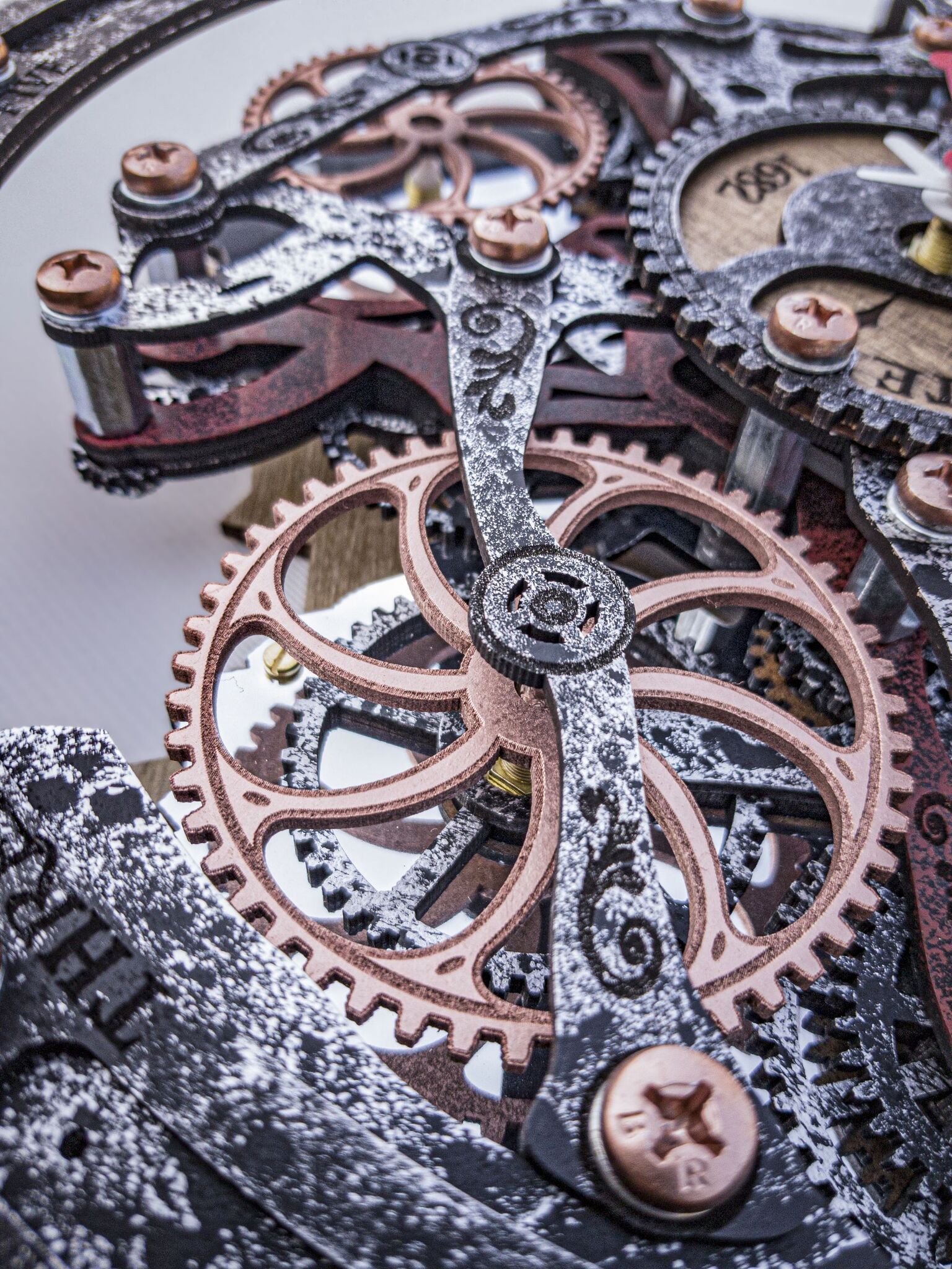 Корпус изделия вырезан из многослойного дерева и окрашен вручную акриловыми красками под эффект старого металла. Благодаря этой авторской технике деревянная поверхность приобретает вид состаренного железа с благородной патиной. Фронтальные элементы украшены тонкой гравировкой – изящные узоры придают композиции исторический характер и лёгкую загадочность.