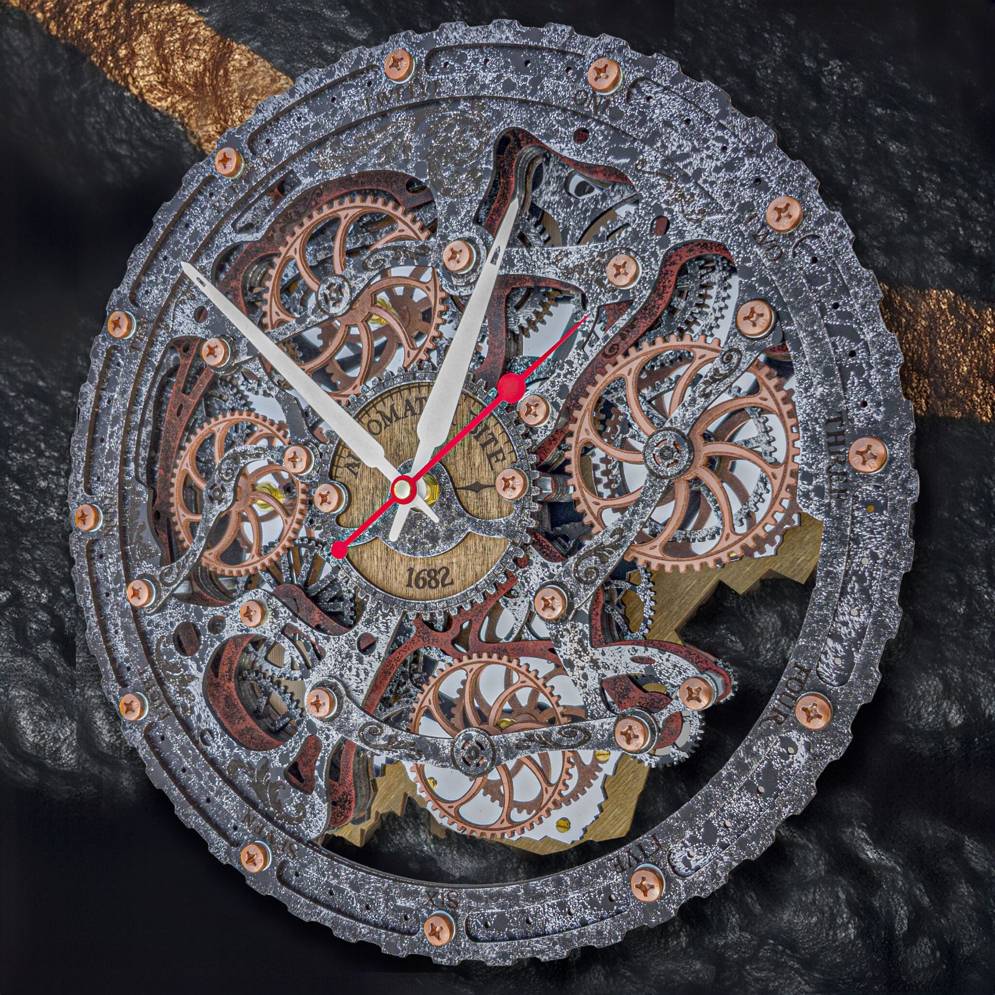 Самая захватывающая деталь – движущиеся шестерёнки. Несколько шестерней, приводимых в движение скрытым мотором, синхронизированы с ходом часов. Они плавно вращаются, создавая эффект живого механизма и гипнотизируя взгляд наблюдателя. Зеркальная подложка позади механизма углубляет композицию – отражаясь, шестерёнки словно приумножают своё движение. При всём богатстве деталей часы работают бесшумно благодаря высокоточному кварцевому механизму: ничто не отвлечёт от созерцания красоты времени.