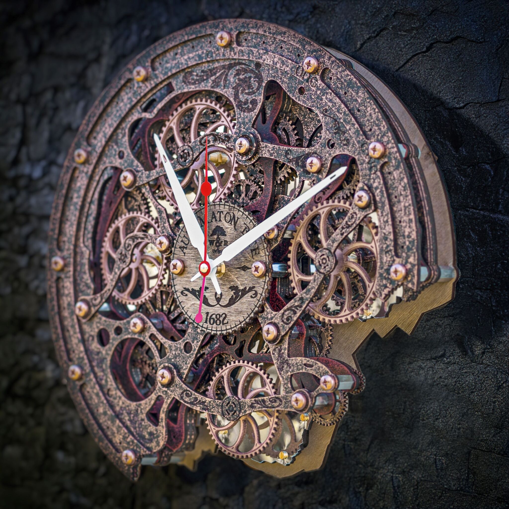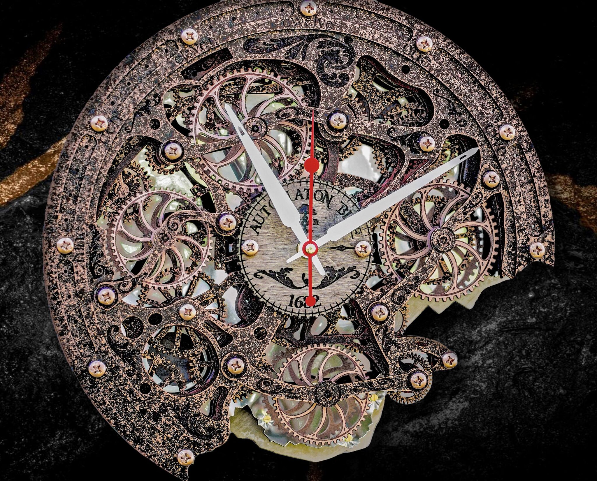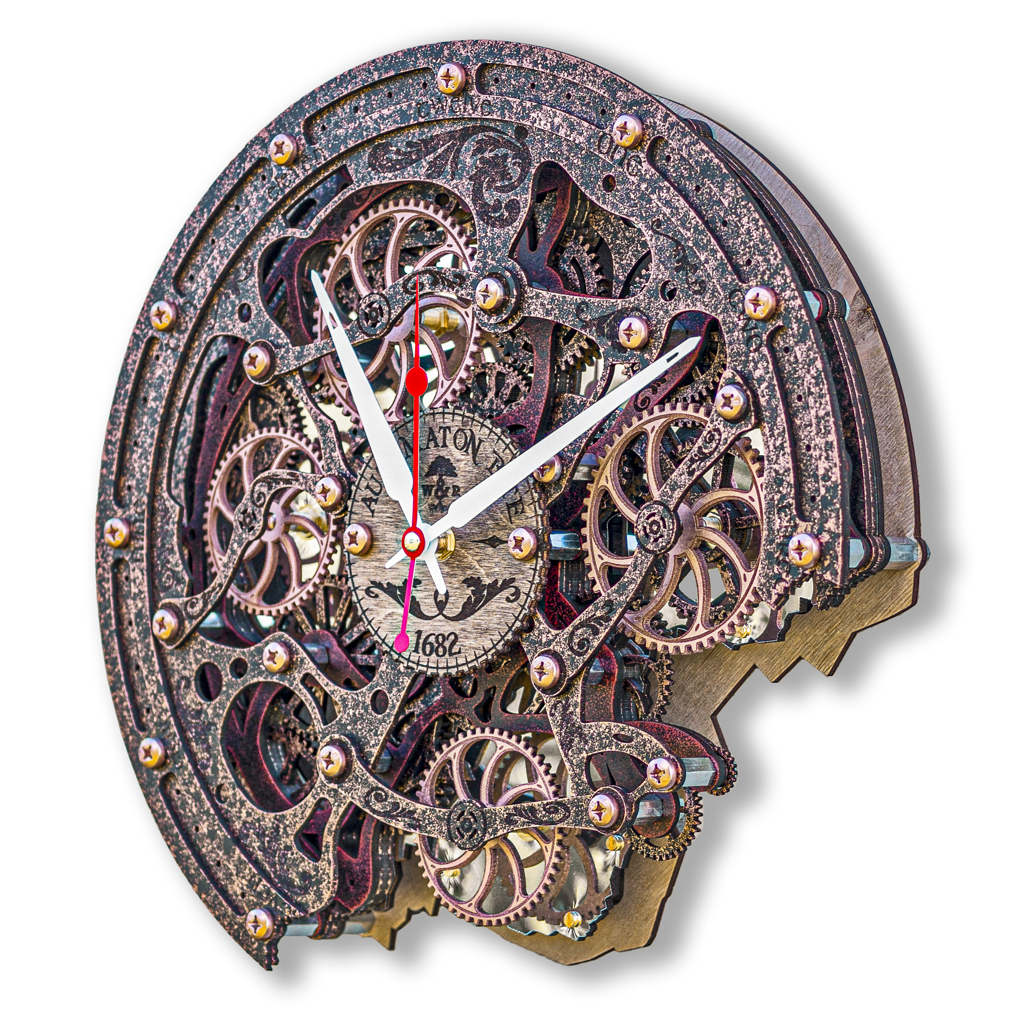Большие настенные часы Автоматон Bite винтажная медь с любовью сделаны вручную из множества слоёв дерева, выкрашенных высококачественной акриловой краской и морилкой, а также акрилового зеркала. Детализированная гравировка украшает элементы фасада часов. В данной работе использованы элементы из нержавеющей стали и винты с медным покрытием.