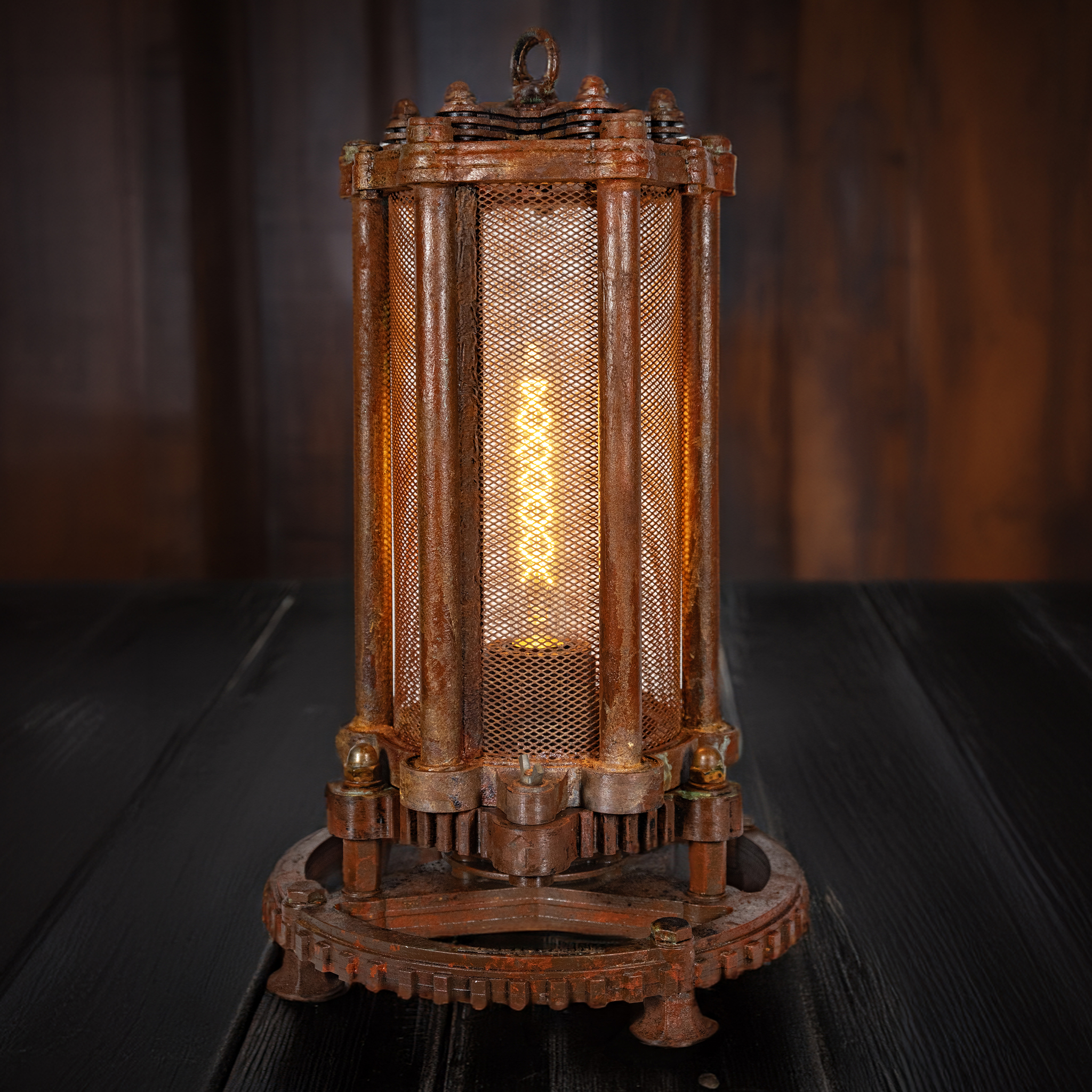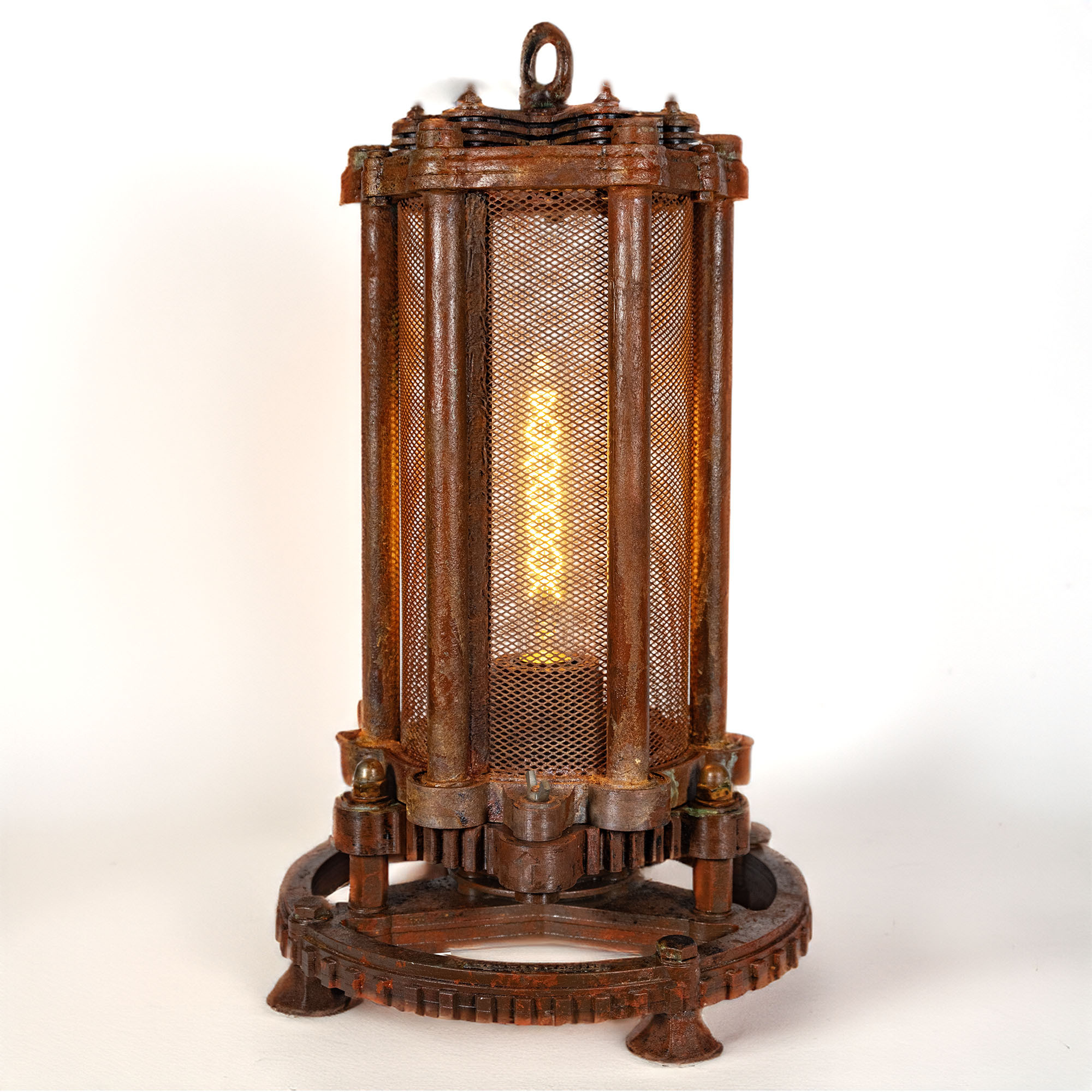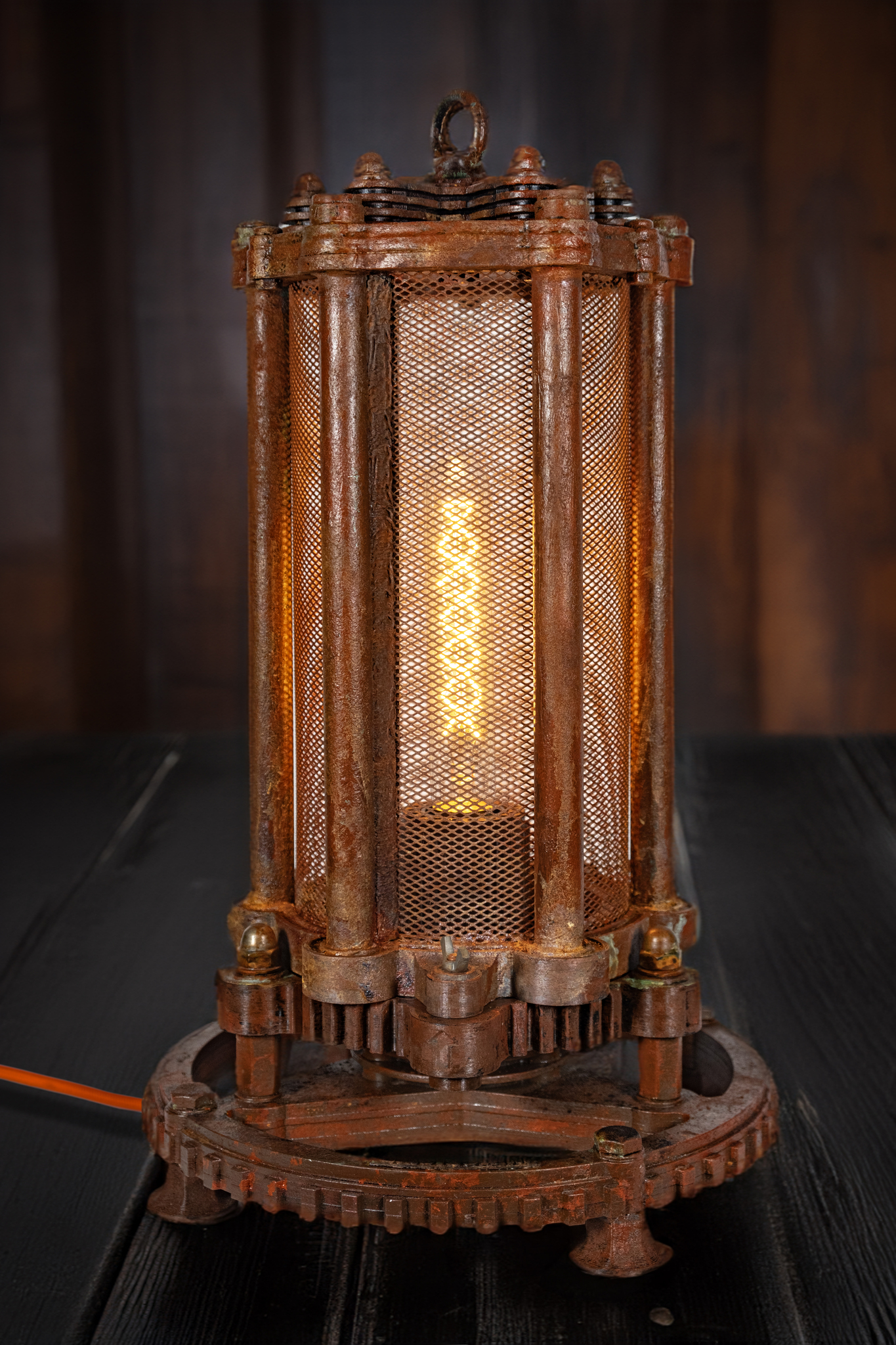 Светильник "Артефакт" словно древний загадочный механизм, покрытый настоящей стабилизированной ржавчиной и окисью, что придает ему неповторимый характер и историческую аутентичность. Внутри светильника установлена винтажная лампа с теплым светом, которая создает волшебную и уютную атмосферу в вашем помещении. Яркий тканевый кабель дополняет образ, создавая удивительный контраст и подчеркивая эксклюзивность дизайна.