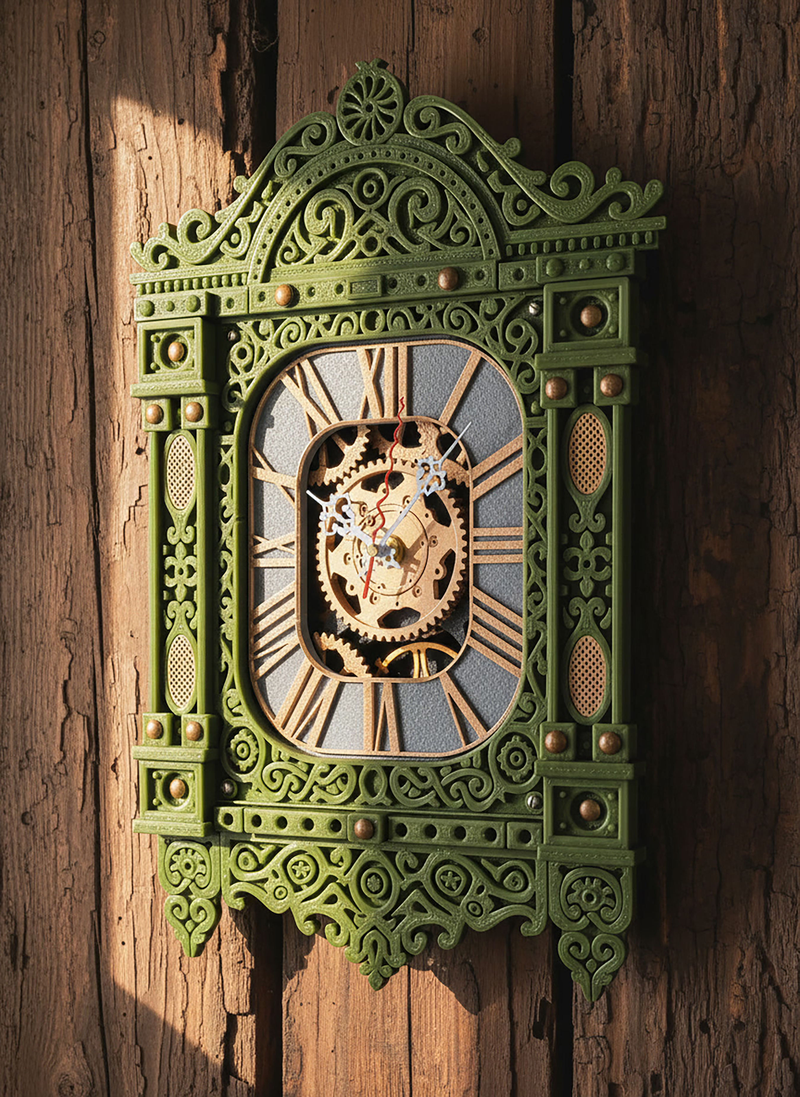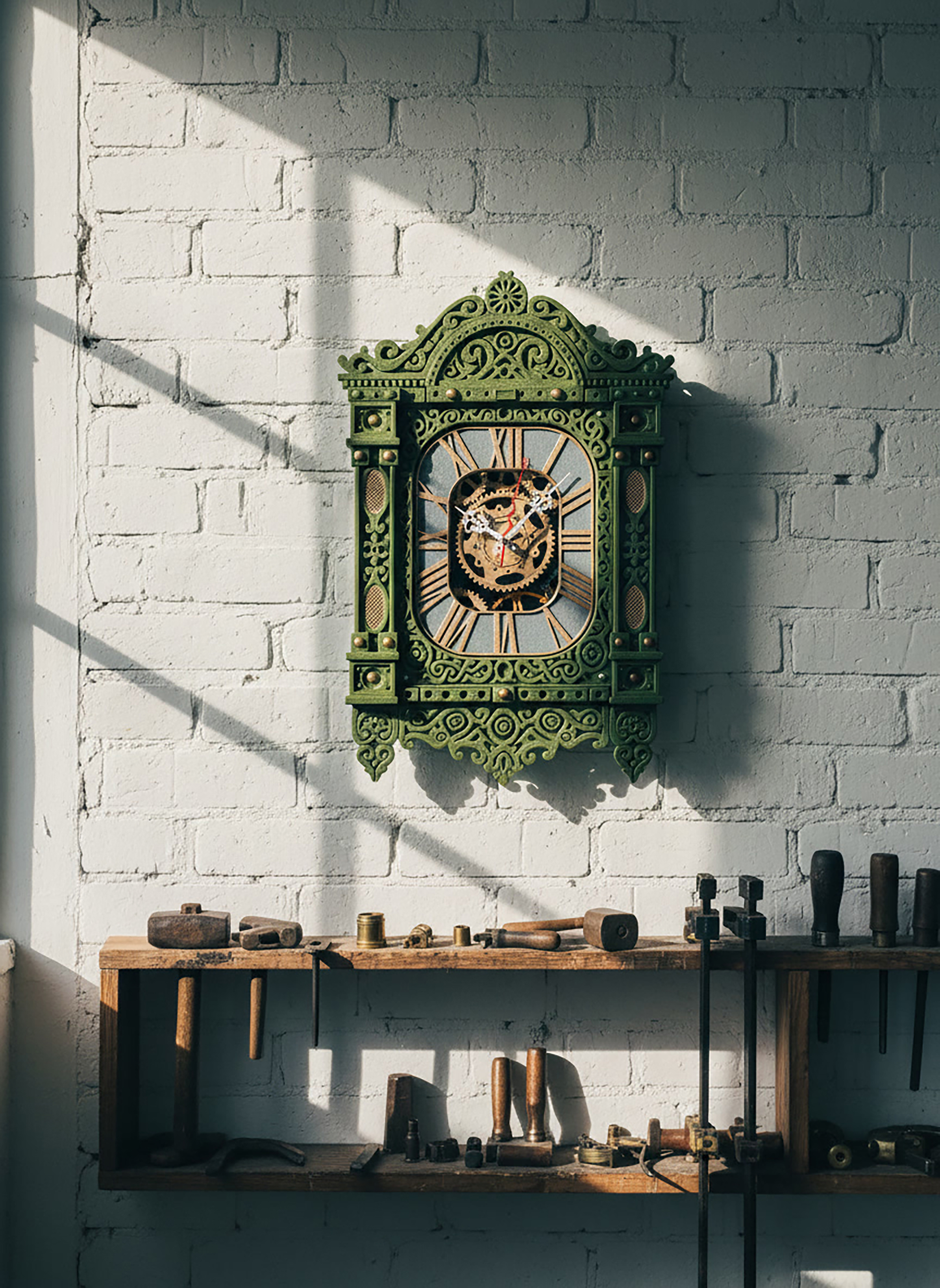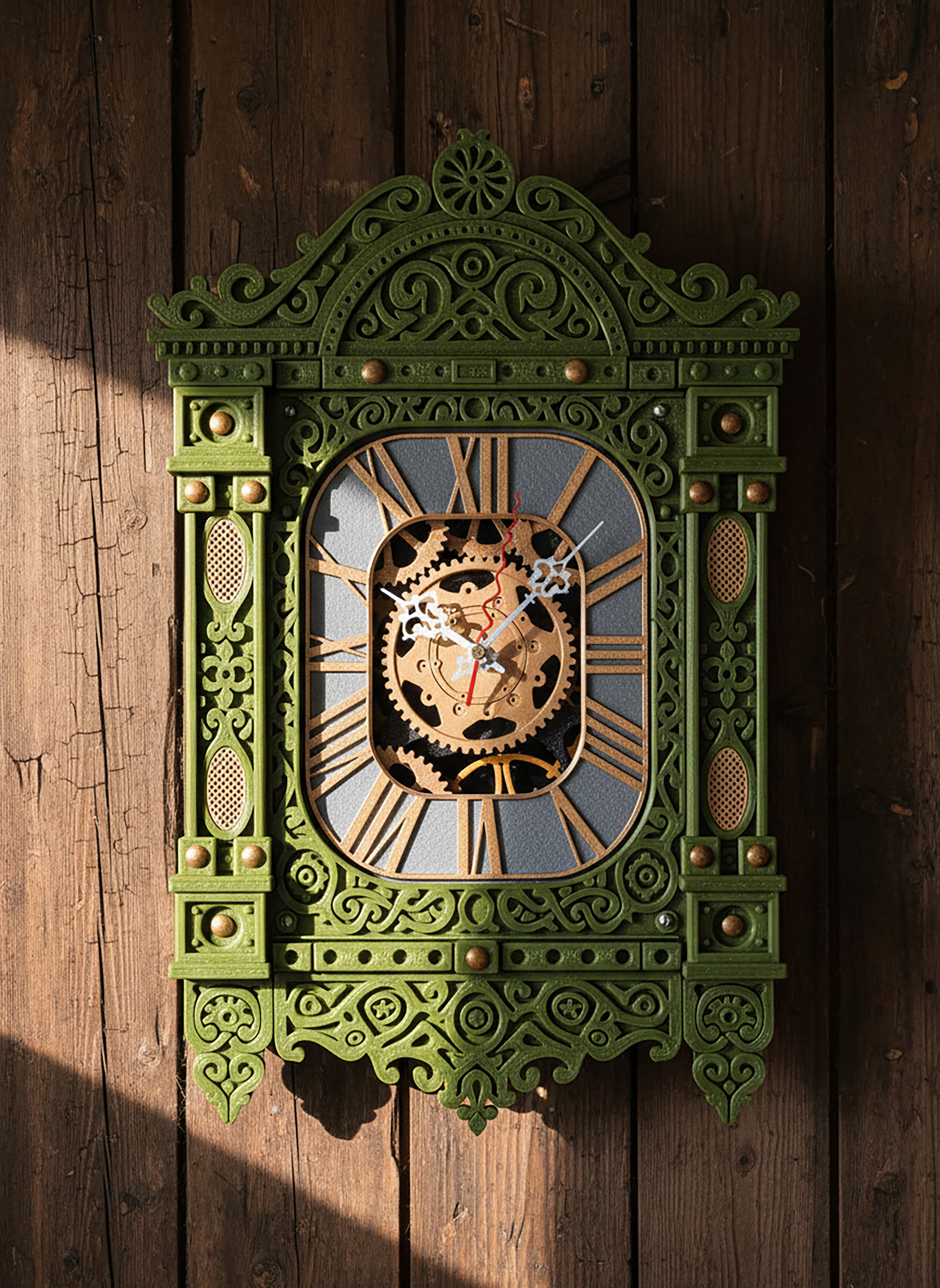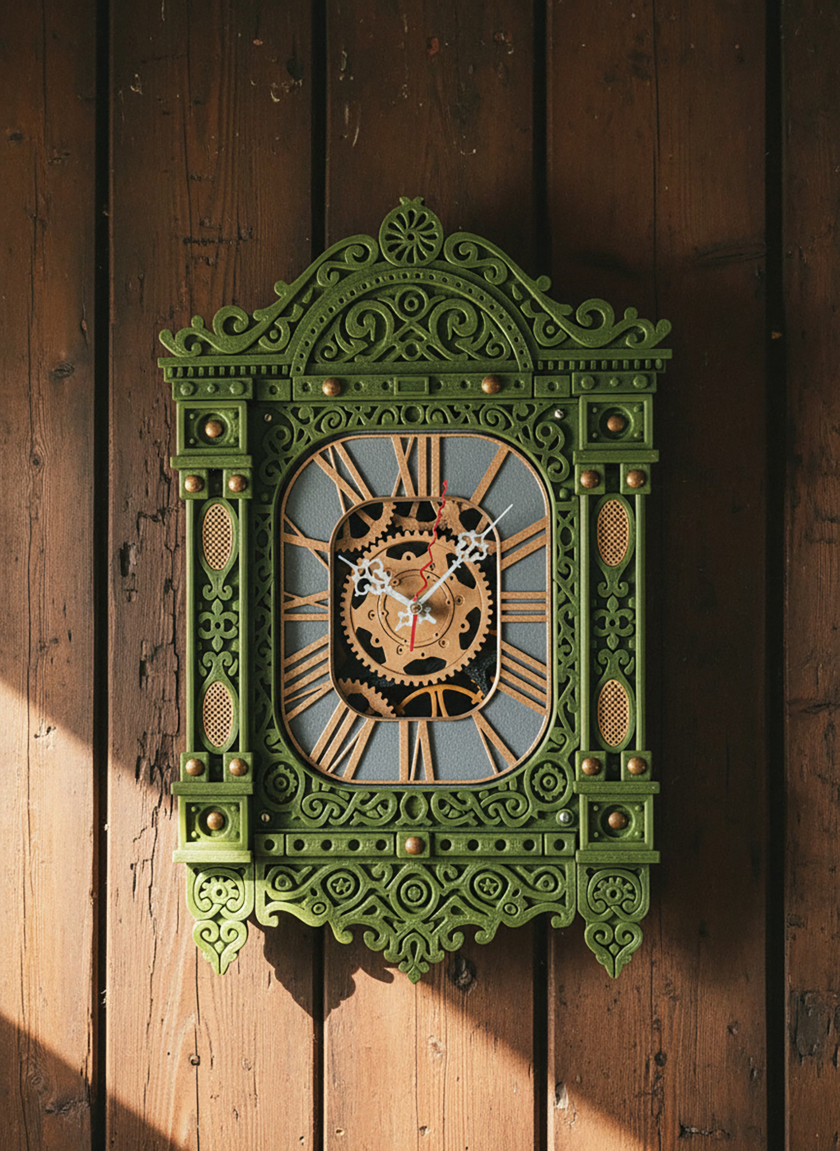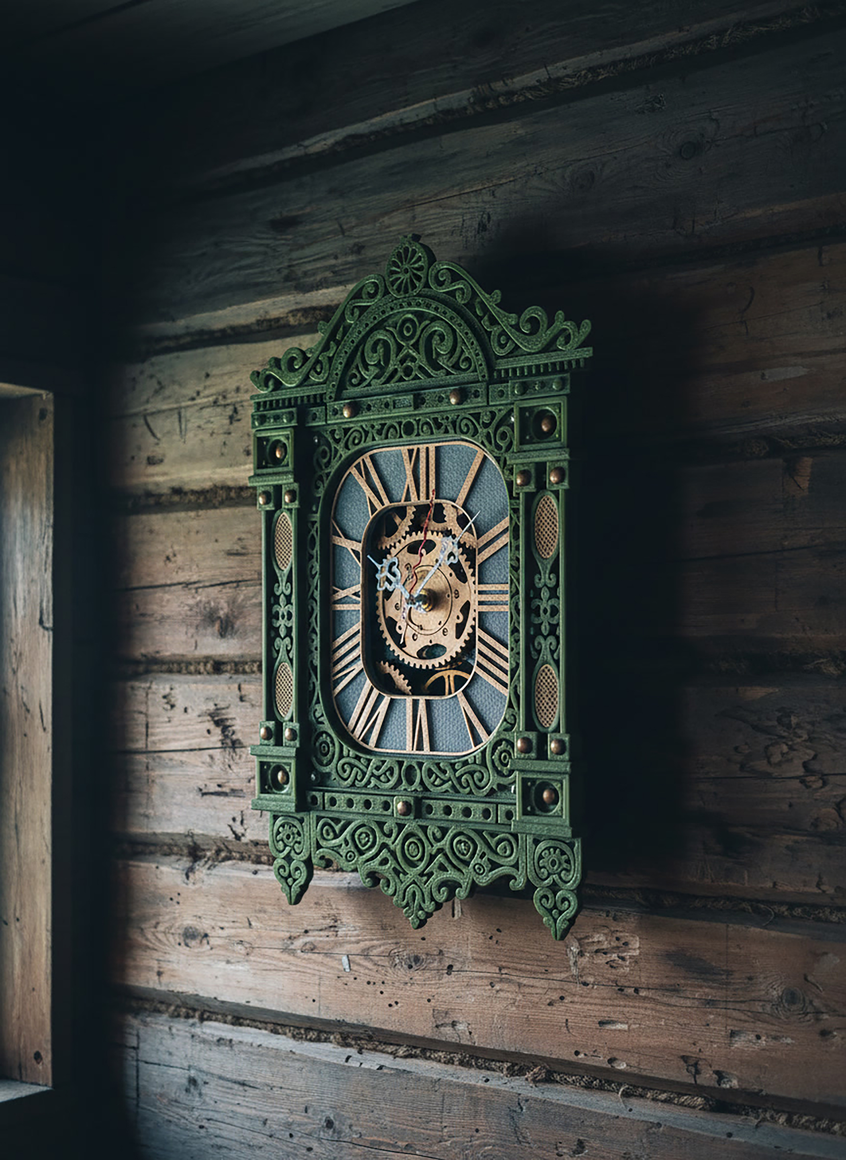 Орнамент корпуса отсылает к мотивам северной резьбы и архитектурных наличников. Он не кричит о декоре, а поддерживает форму — как рама поддерживает картину. Благодаря этому часы выглядят выразительно, но не перегружают пространство.