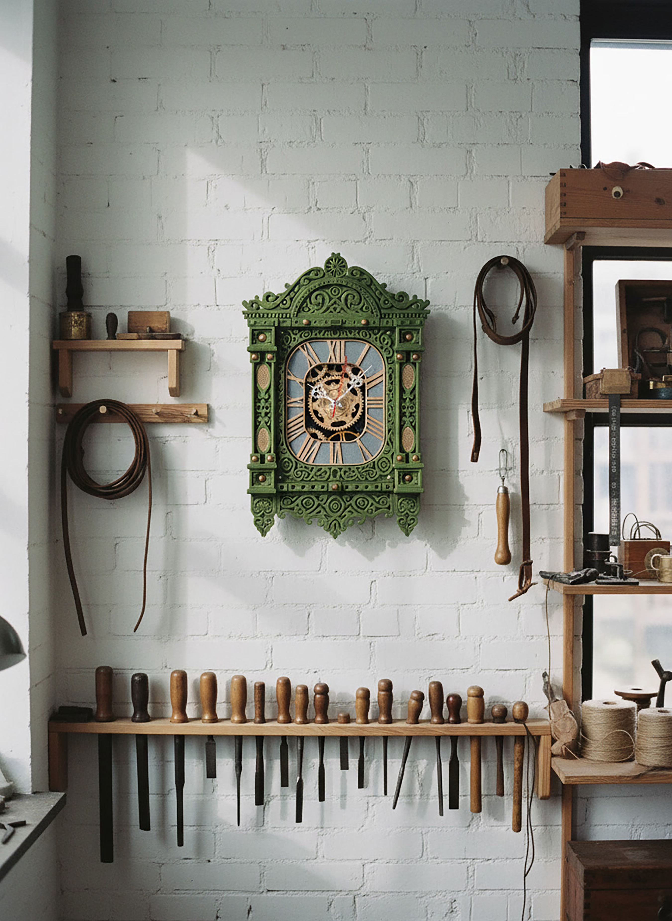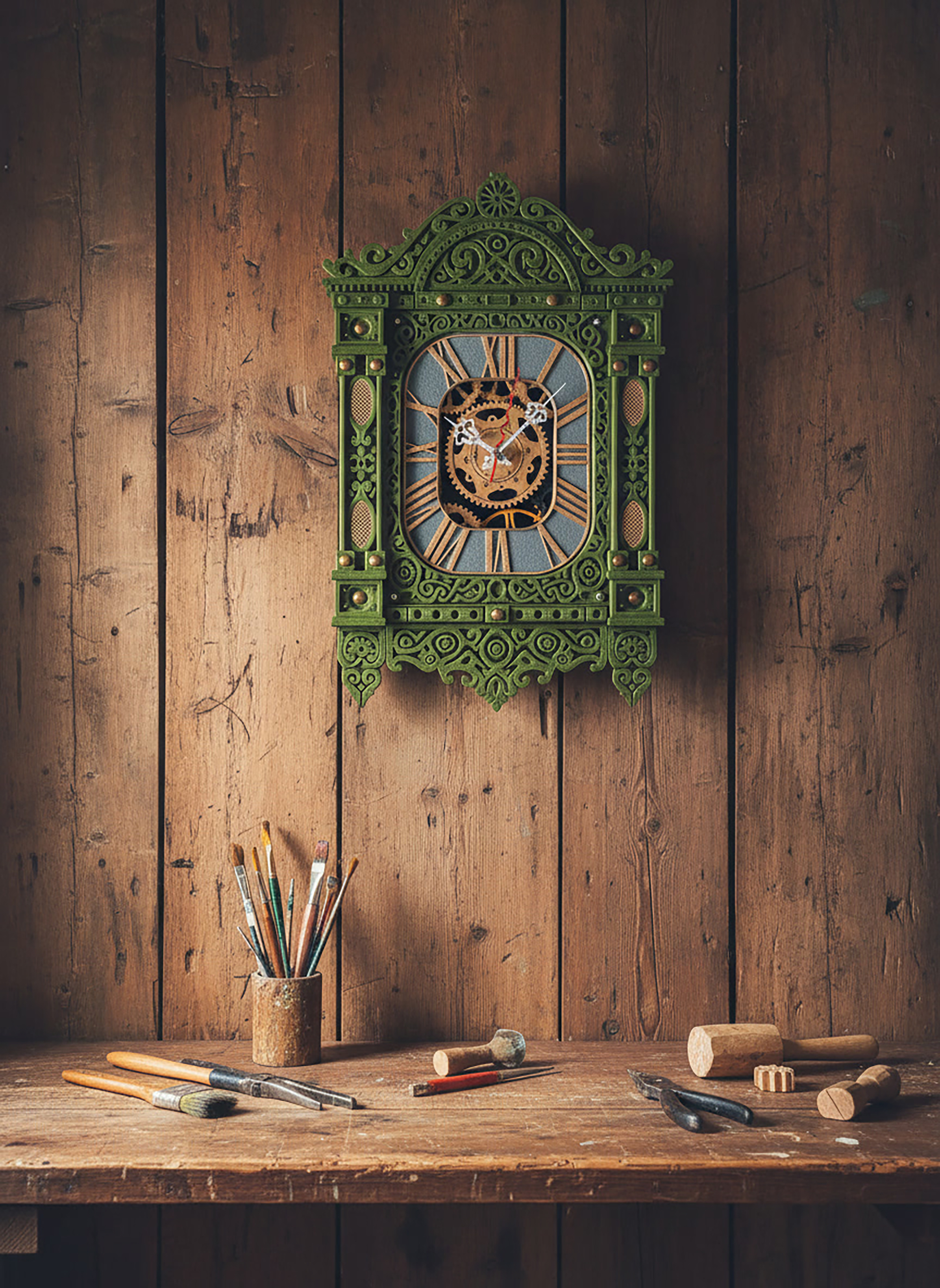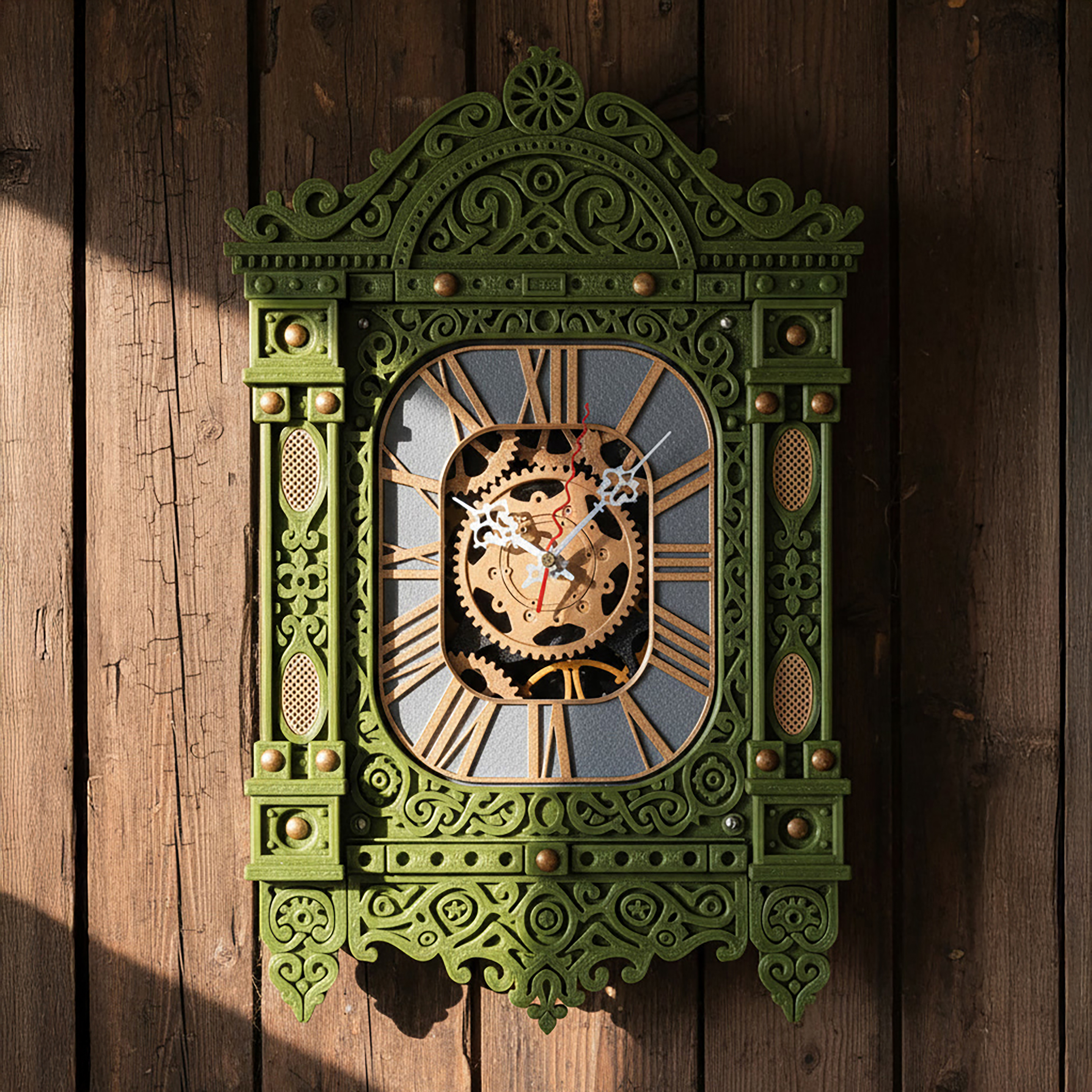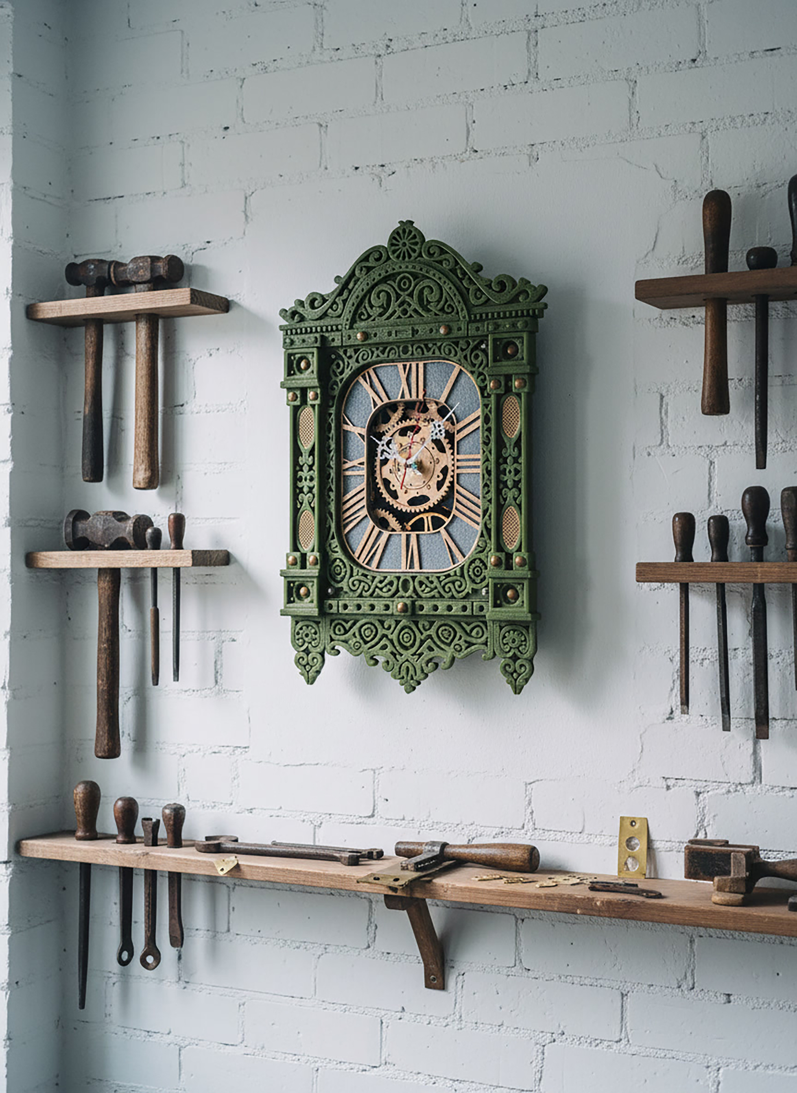 Орнамент корпуса отсылает к мотивам северной резьбы и архитектурных наличников. Он не кричит о декоре, а поддерживает форму — как рама поддерживает картину. Благодаря этому часы выглядят выразительно, но не перегружают пространство.