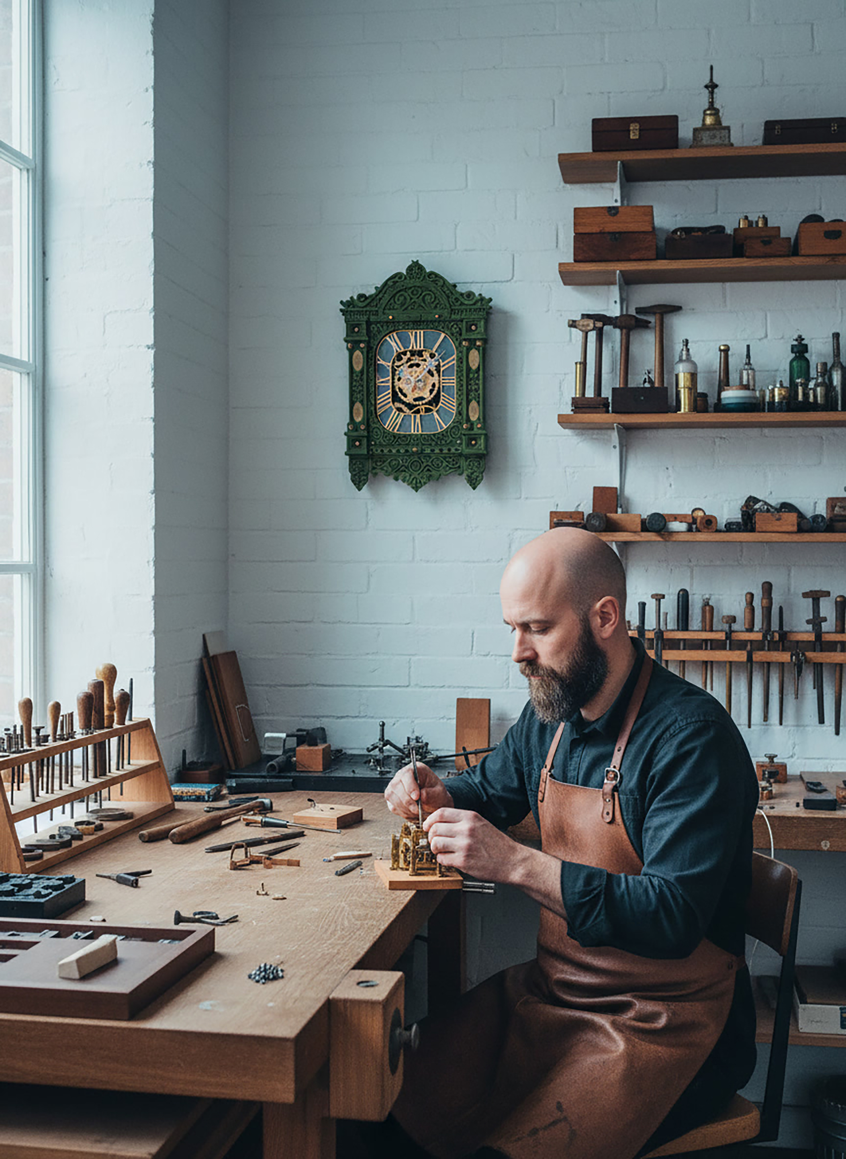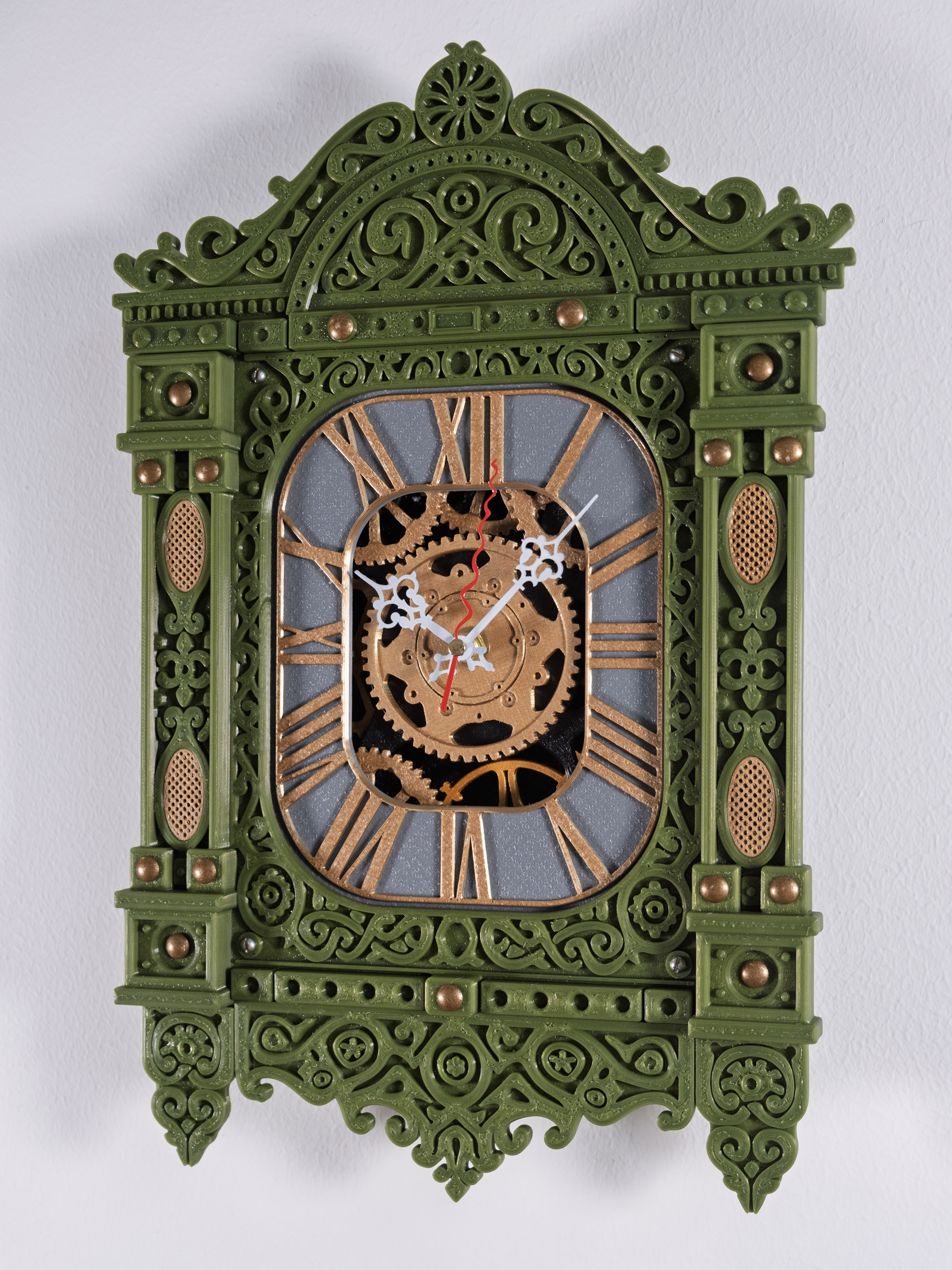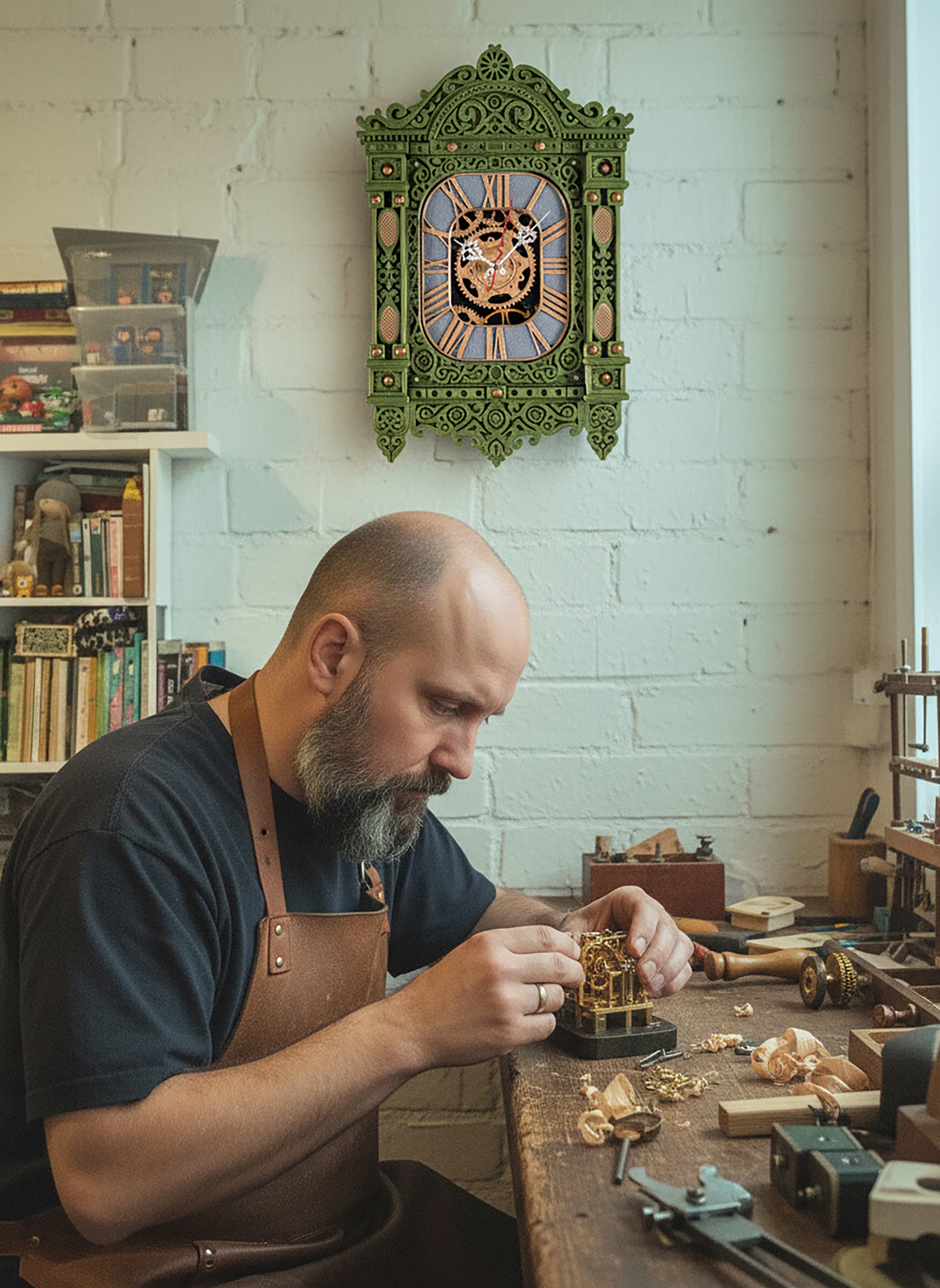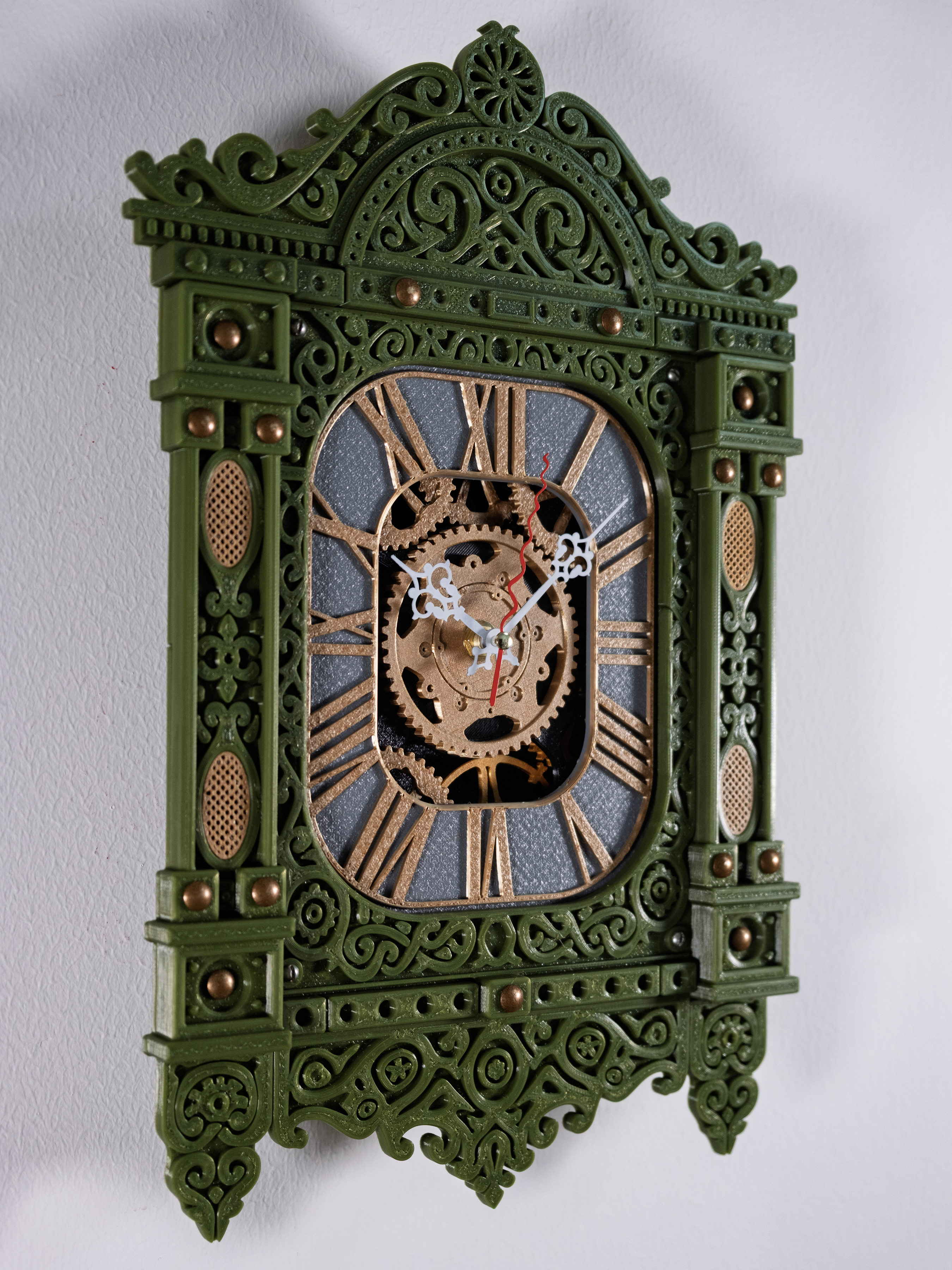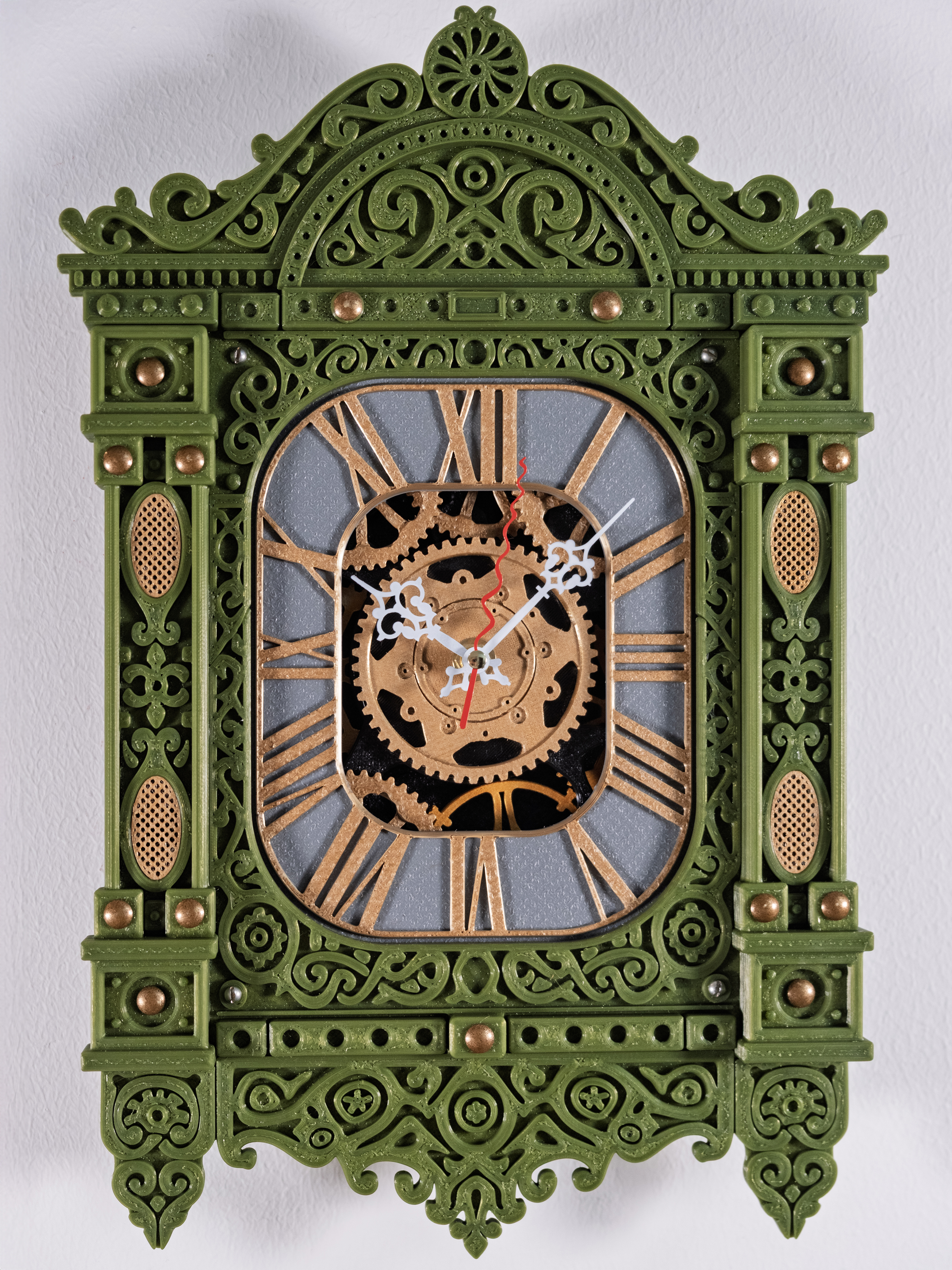 Орнамент корпуса отсылает к мотивам северной резьбы и архитектурных наличников. Он не кричит о декоре, а поддерживает форму — как рама поддерживает картину. Благодаря этому часы выглядят выразительно, но не перегружают пространство.