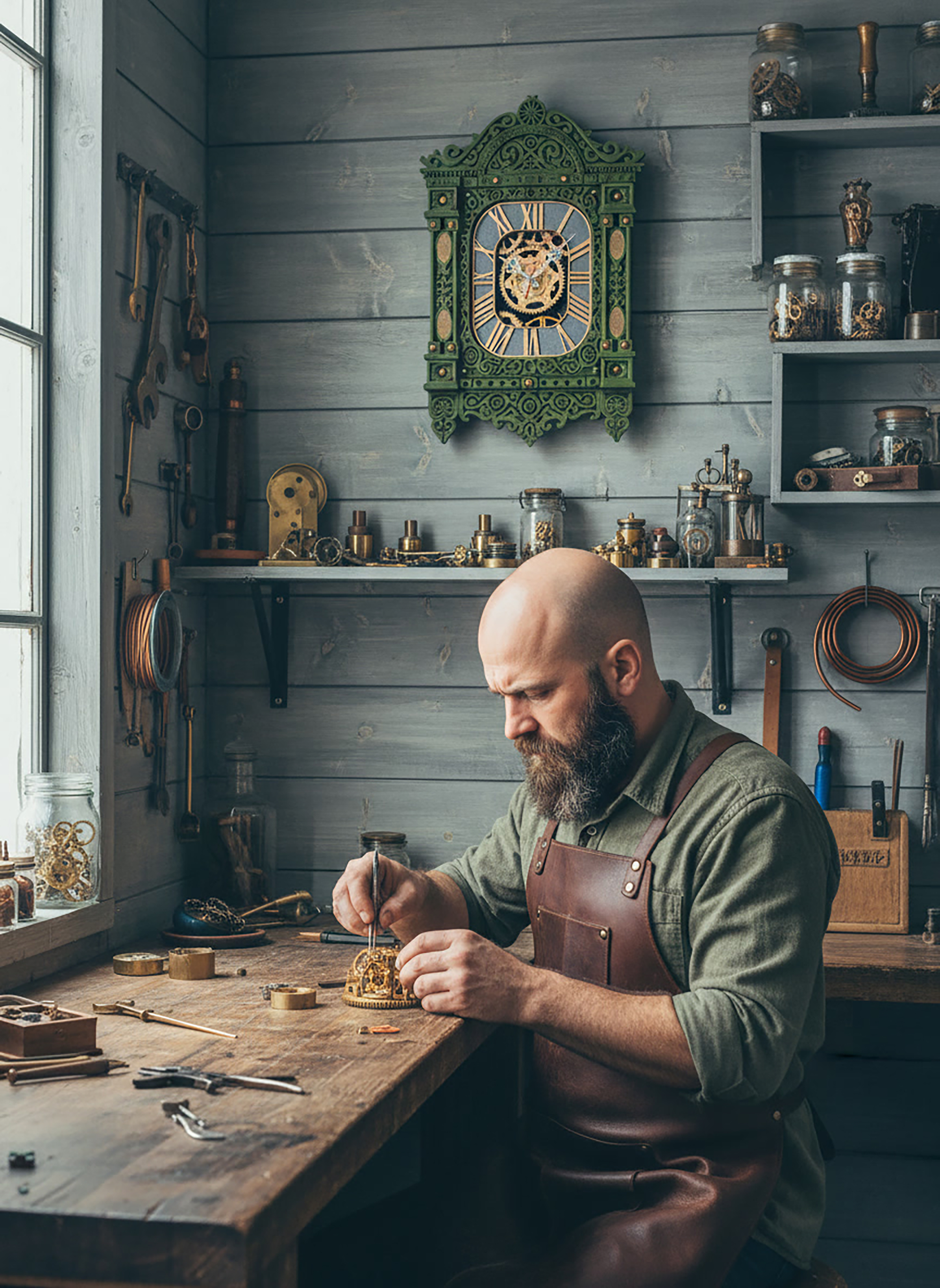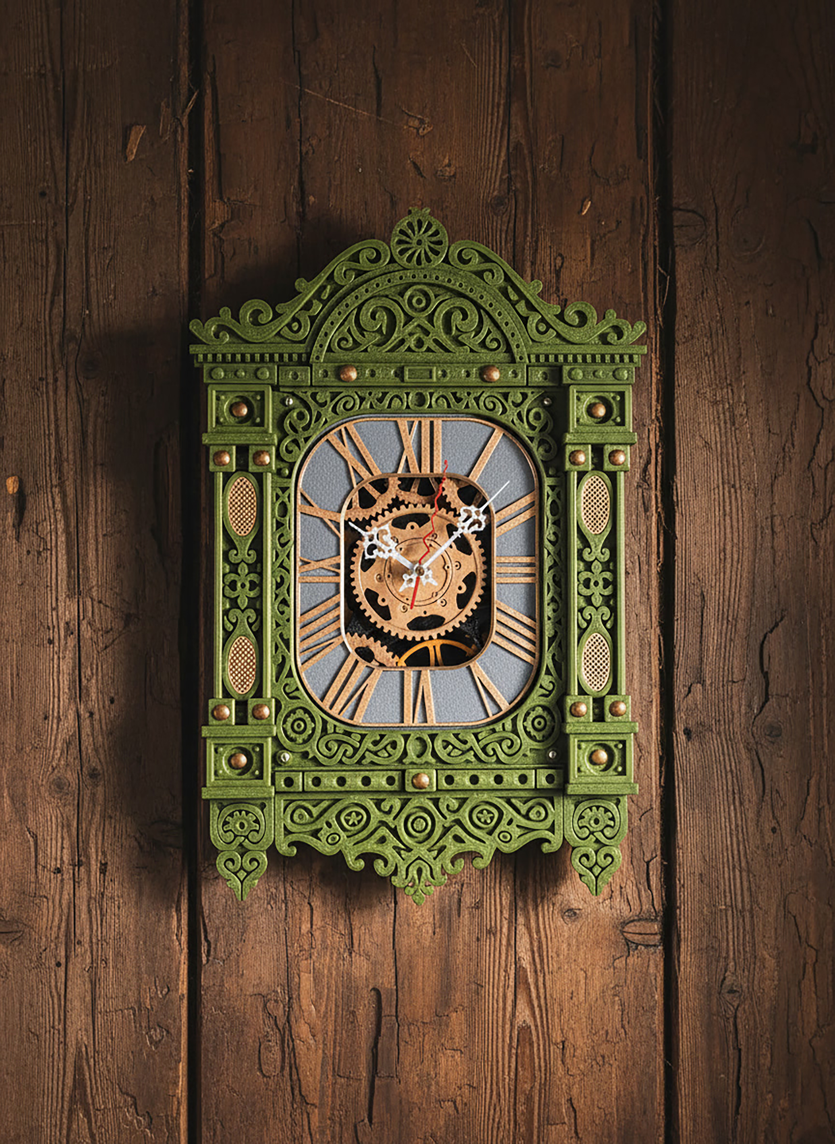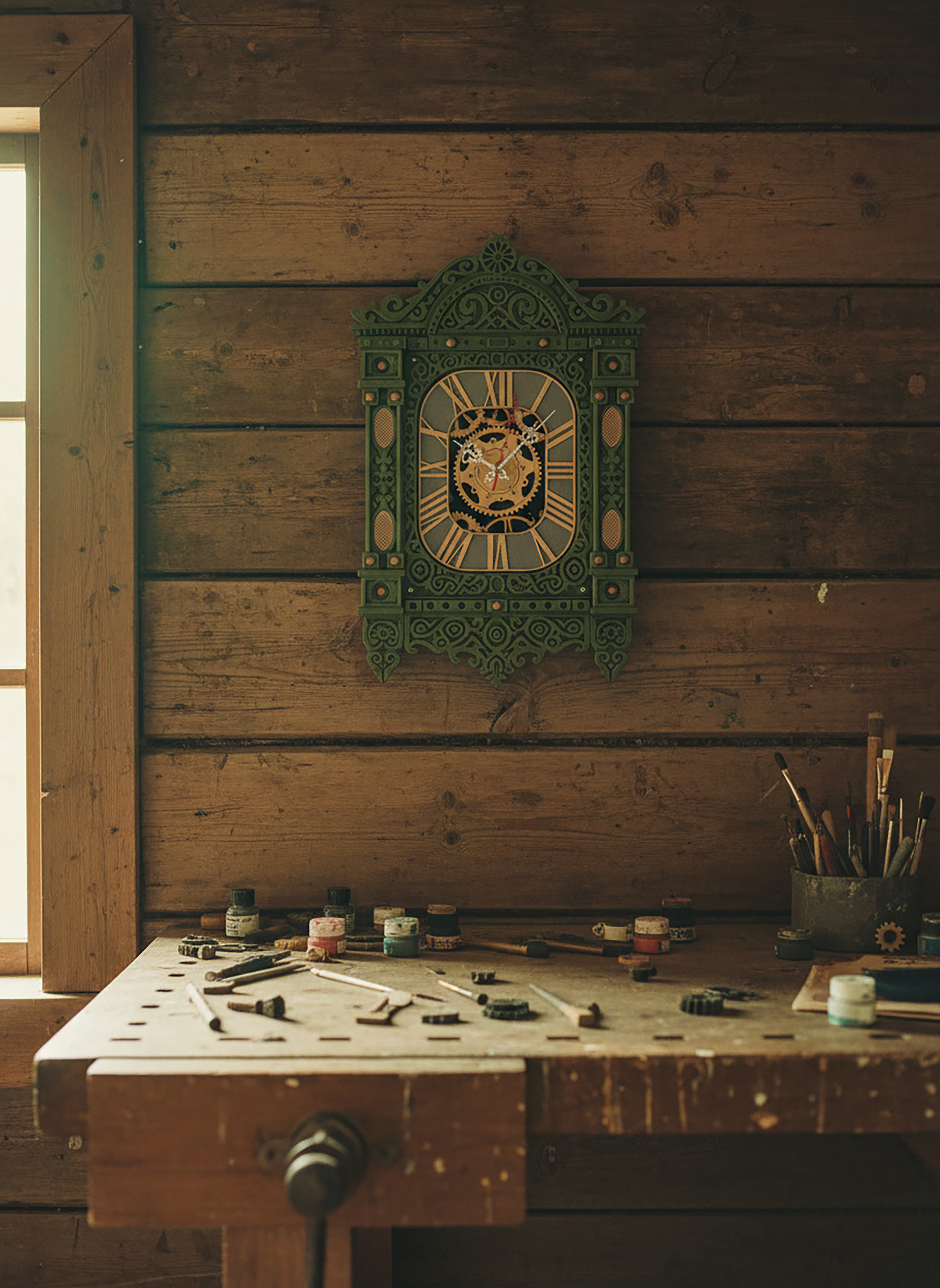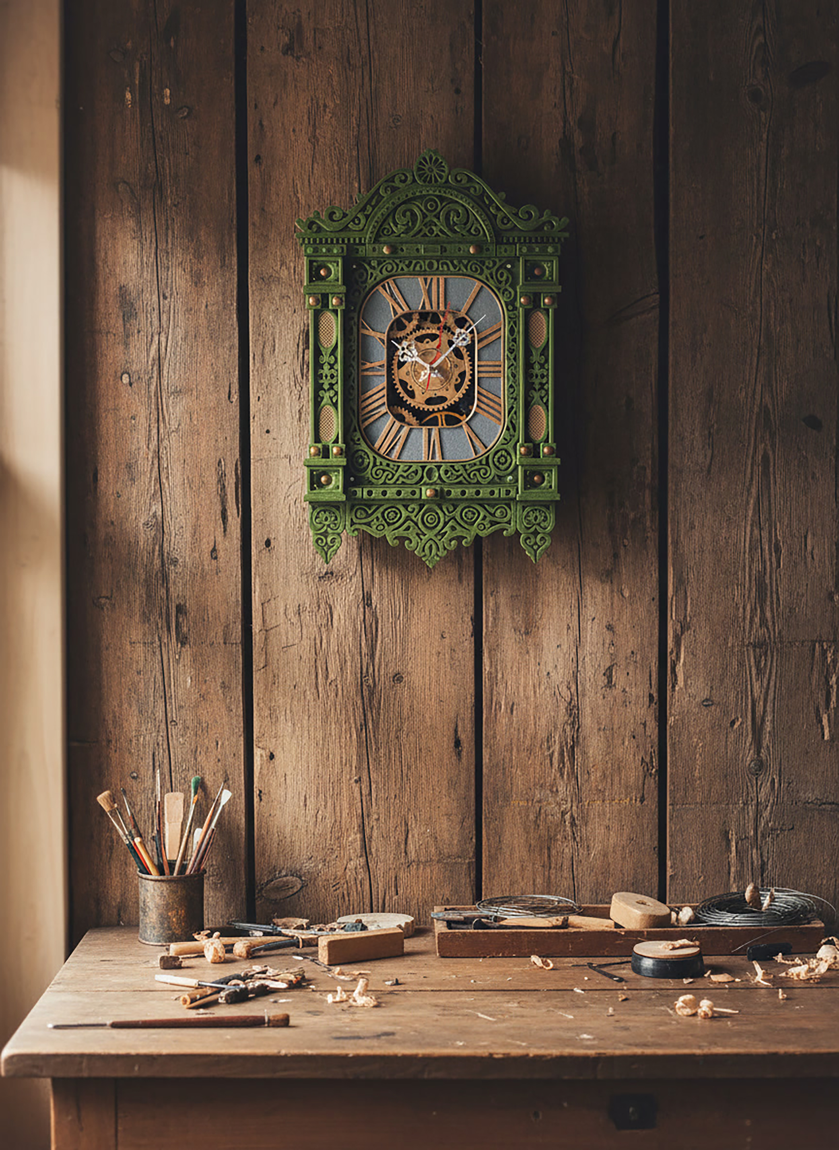 Тёмно-зелёный корпус напоминает вечерний лес и старую окрашенную древесину северных домов. Золотые элементы механизма мягко контрастируют с холодными серыми оттенками циферблата, создавая ощущение сумеречного времени — момента между днём и ночью, когда детали становятся особенно заметны.