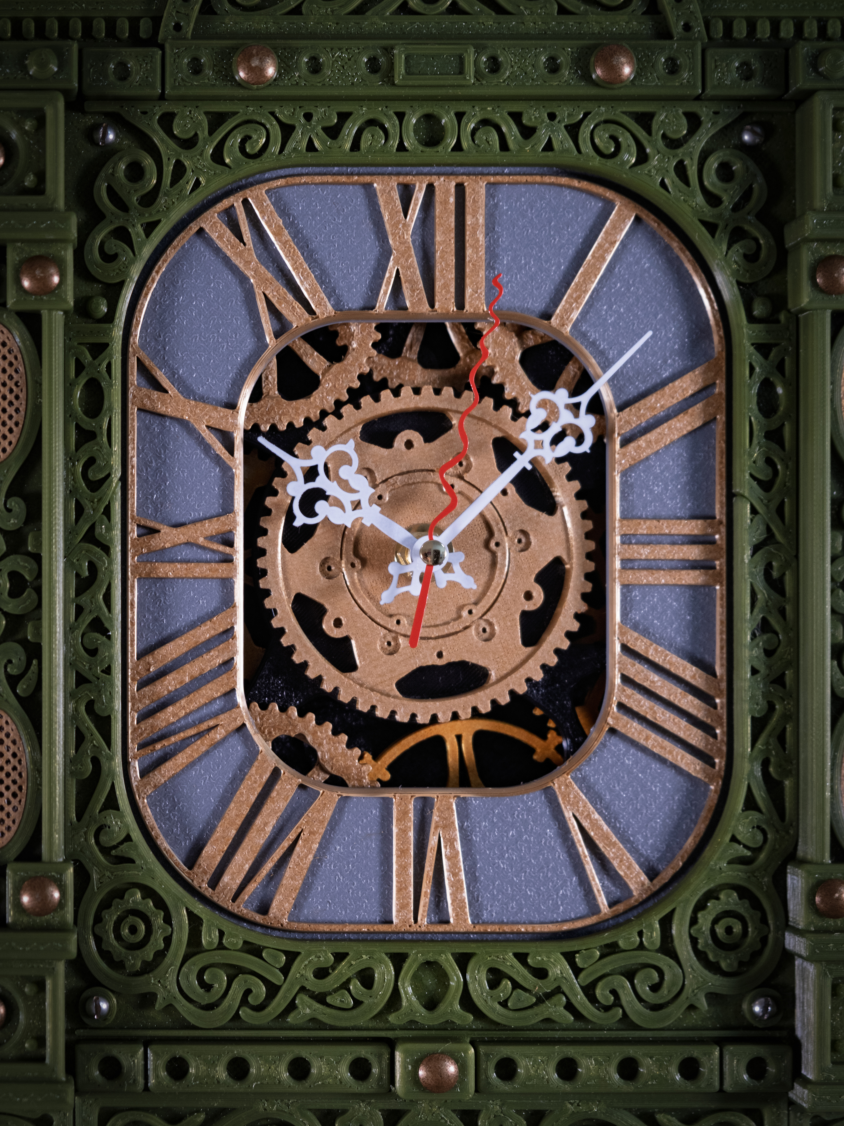 три основные шестерёнки постоянно вращаются, каждая работает от собственного механизма, создавая ощущение живого, почти медитативного движения. Это не демонстрация работы ради эффекта — это спокойное присутствие механики в интерьере.