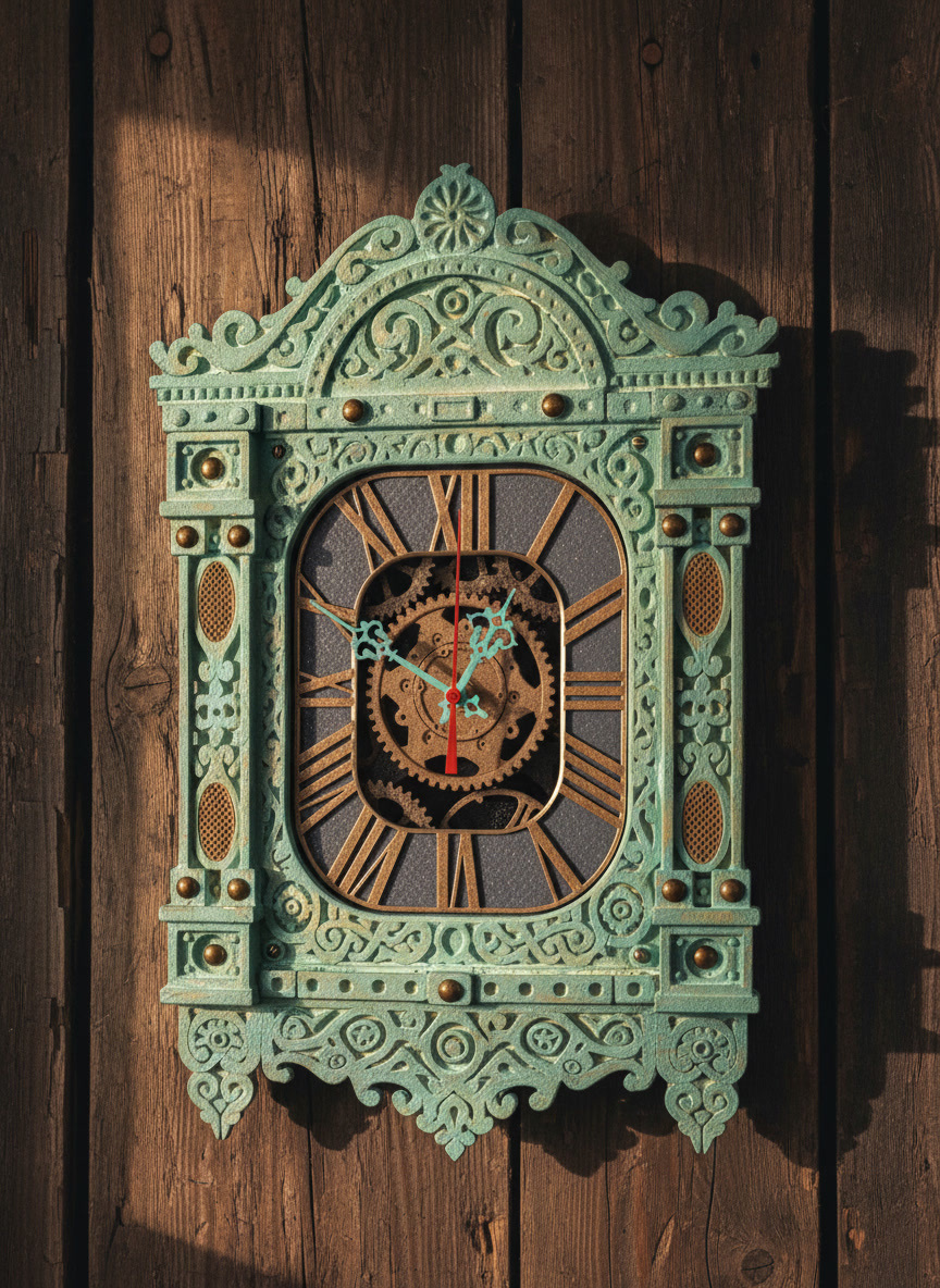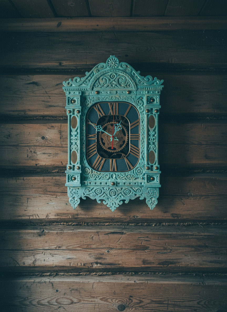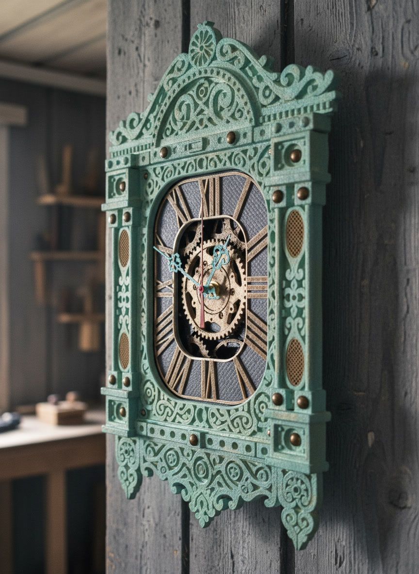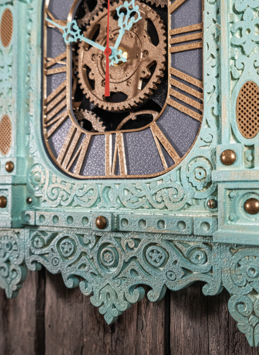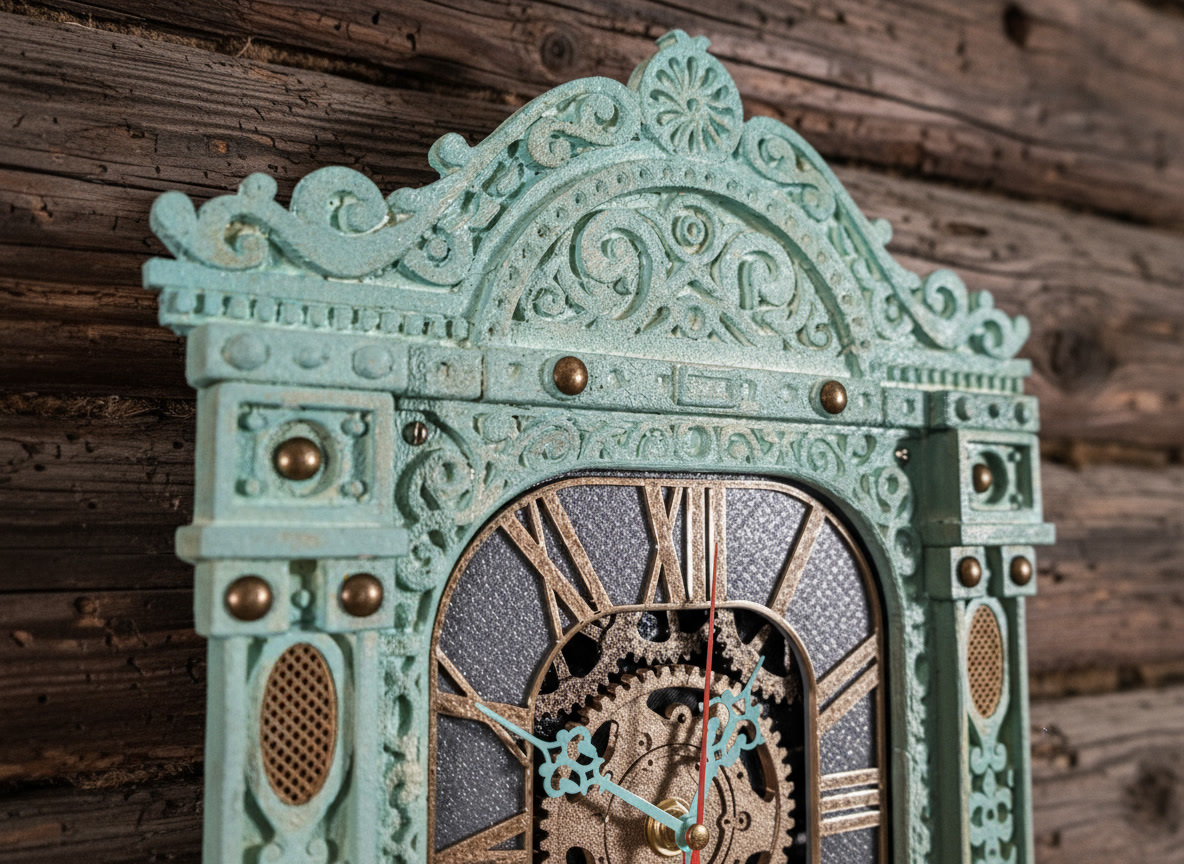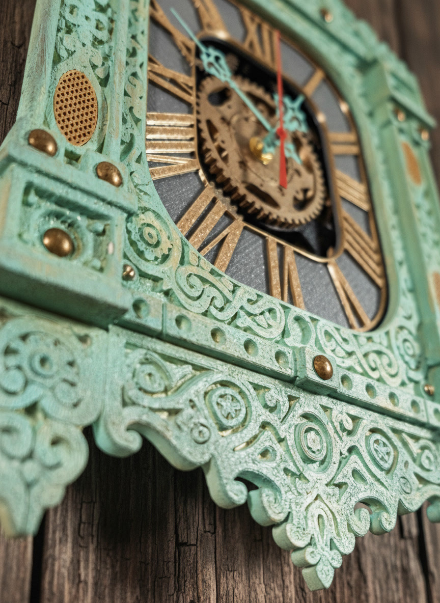 Внутри часов — чёткий кварцевый механизм, а вокруг — ручная фактура, слои краски и орнаменты, которые мы переносили по одному, продумывая силуэт и пропорции.