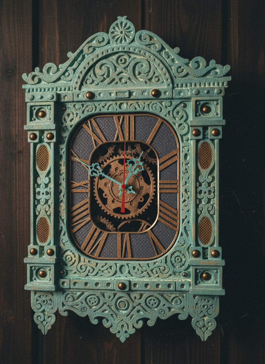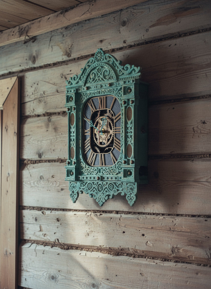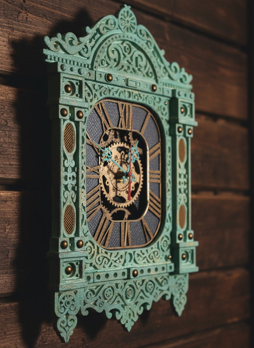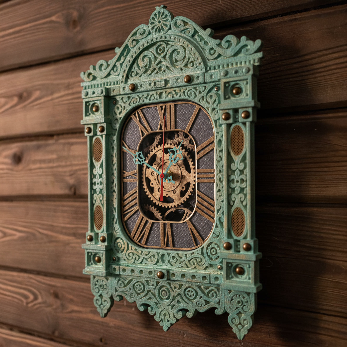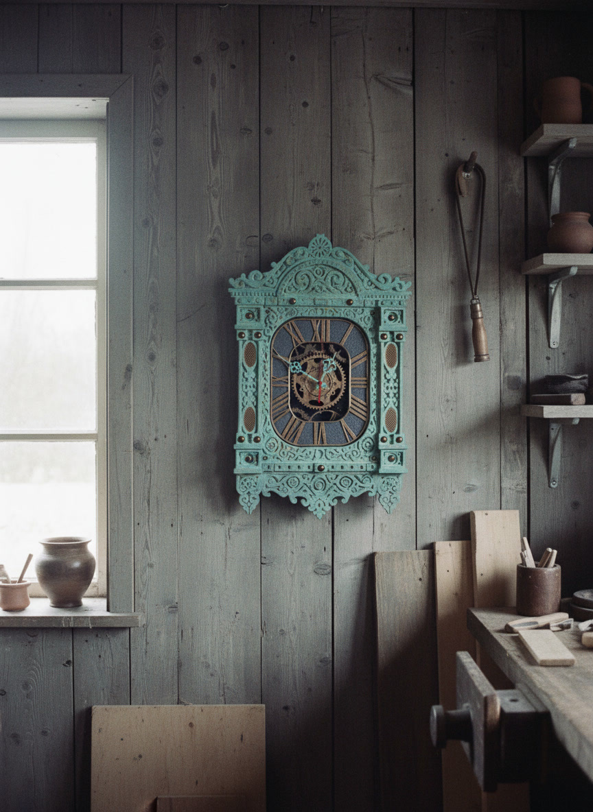 Внутри часов — чёткий кварцевый механизм, а вокруг — ручная фактура, слои краски и орнаменты, которые мы переносили по одному, продумывая силуэт и пропорции.