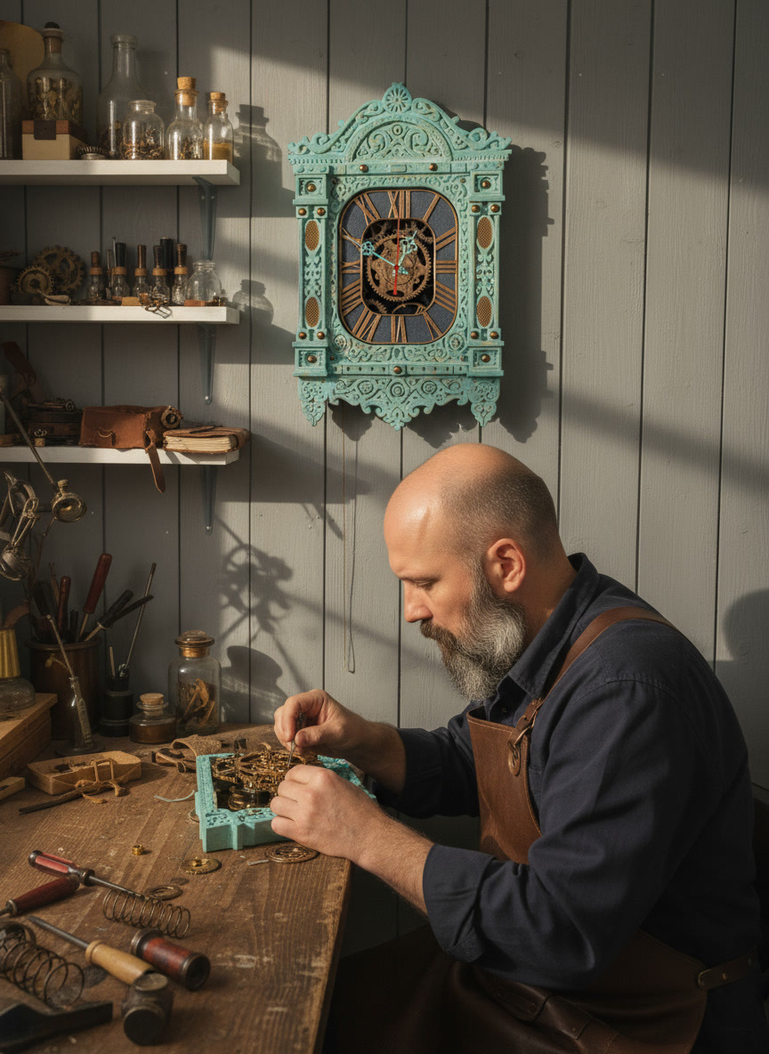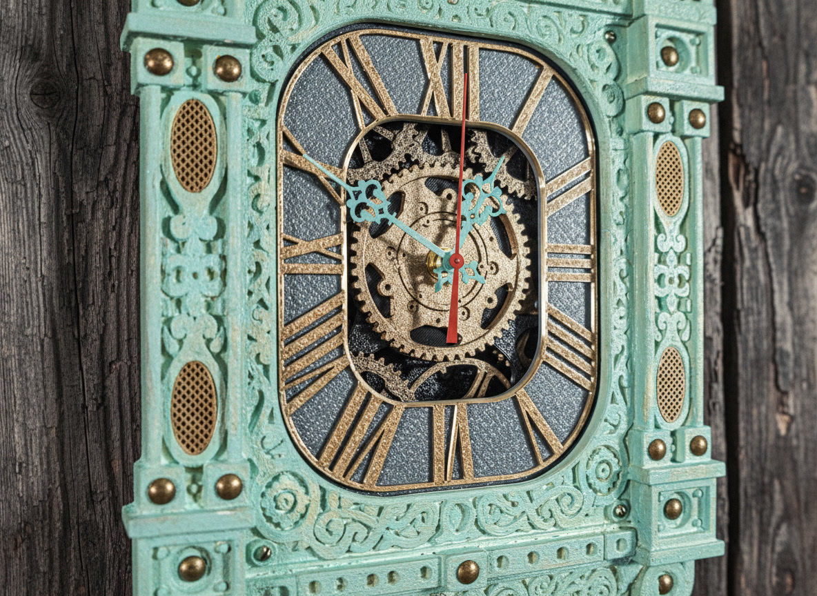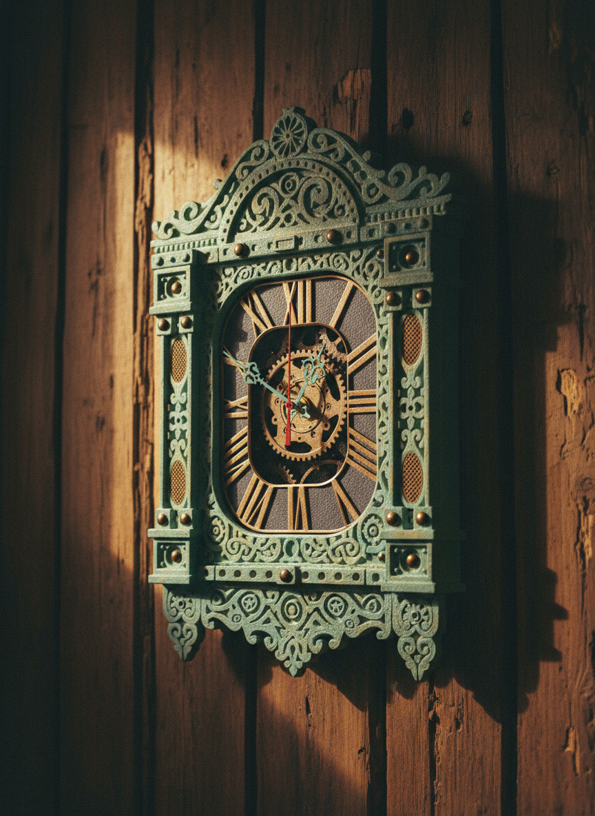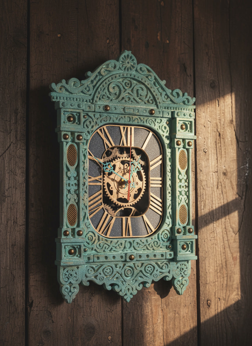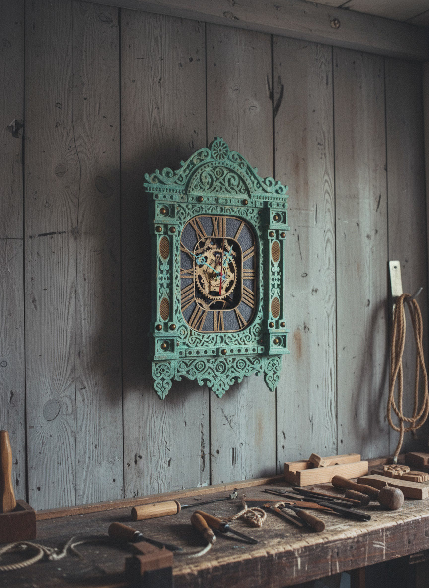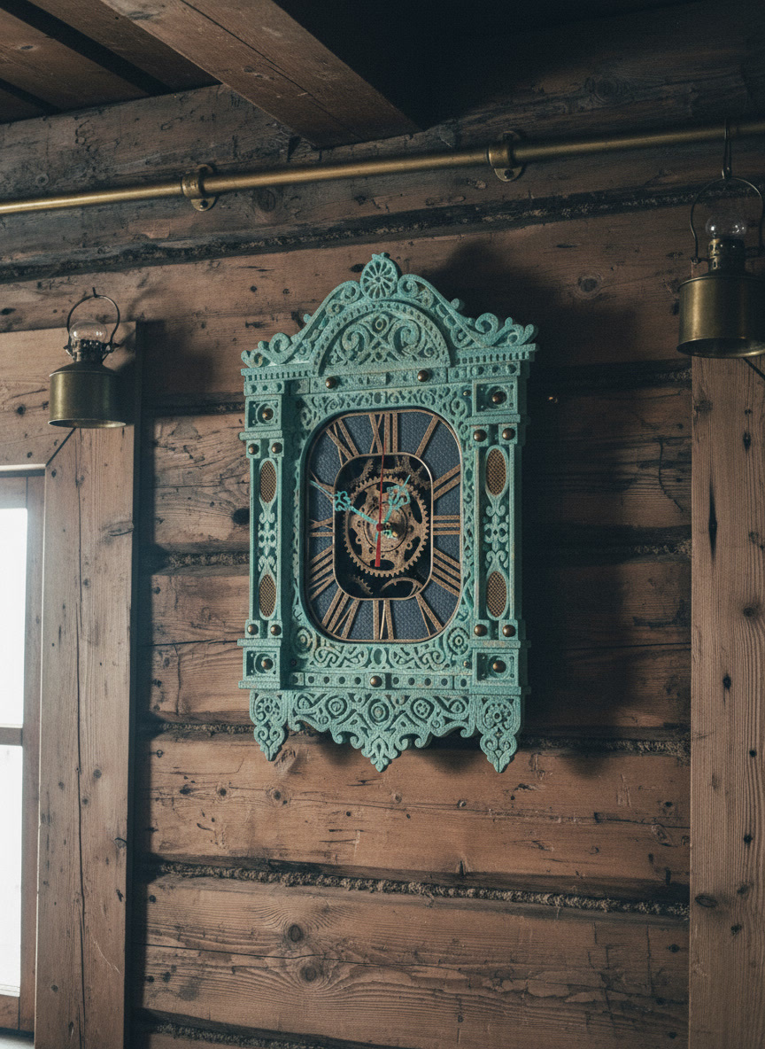 Внутри часов — чёткий кварцевый механизм, а вокруг — ручная фактура, слои краски и орнаменты, которые мы переносили по одному, продумывая силуэт и пропорции.