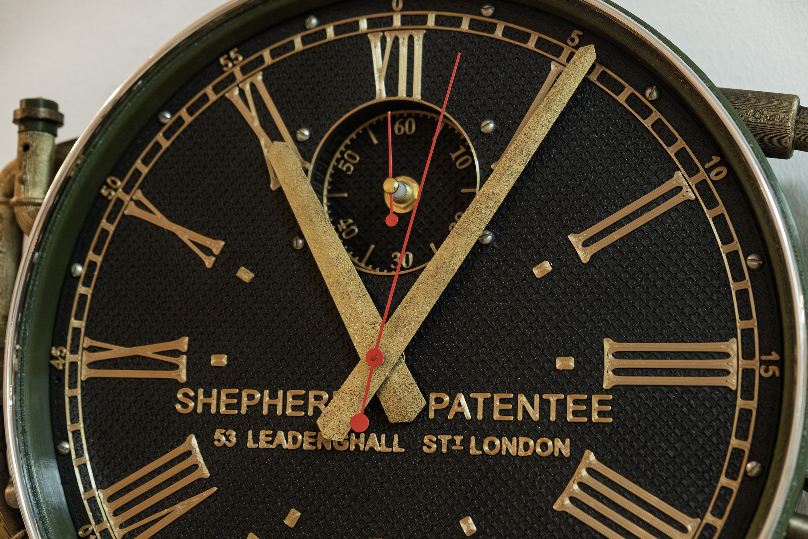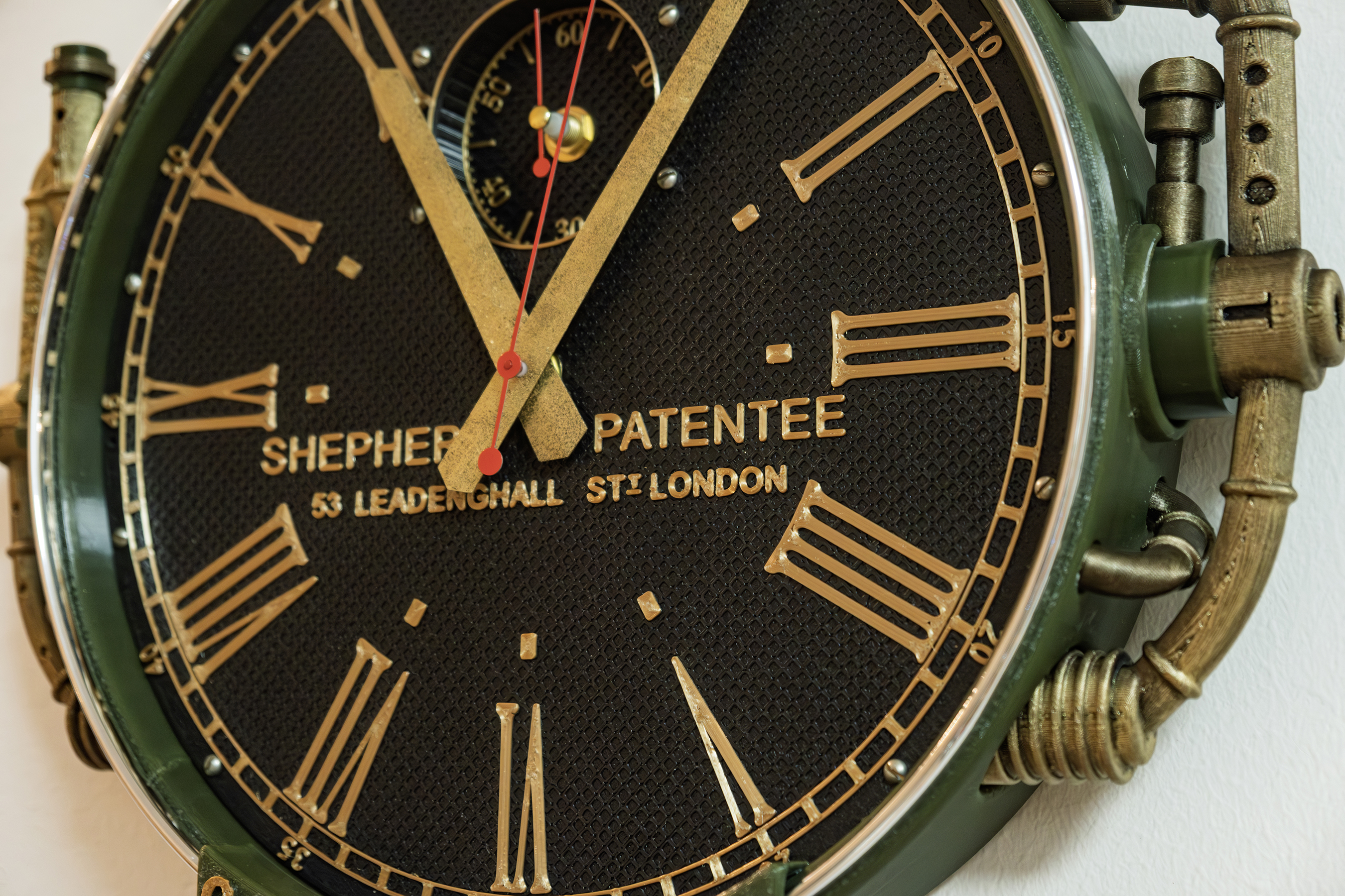 Цвет корпуса - глубокий тёмно-зелёный. Поверхность обработана вручную и дополнена патиной под состаренную латунь. Декоративные детали напоминают трубопроводы и механические соединения старой техники, формируя цельный и сдержанный облик.