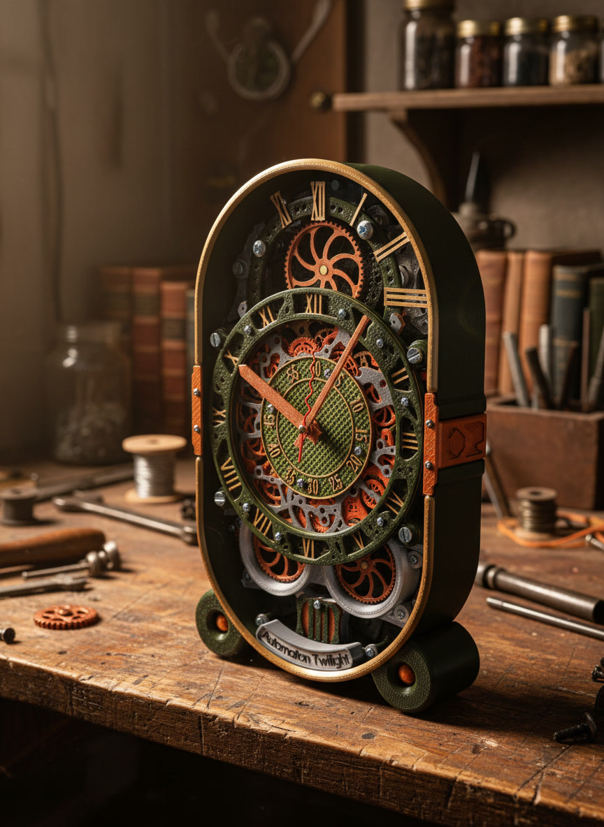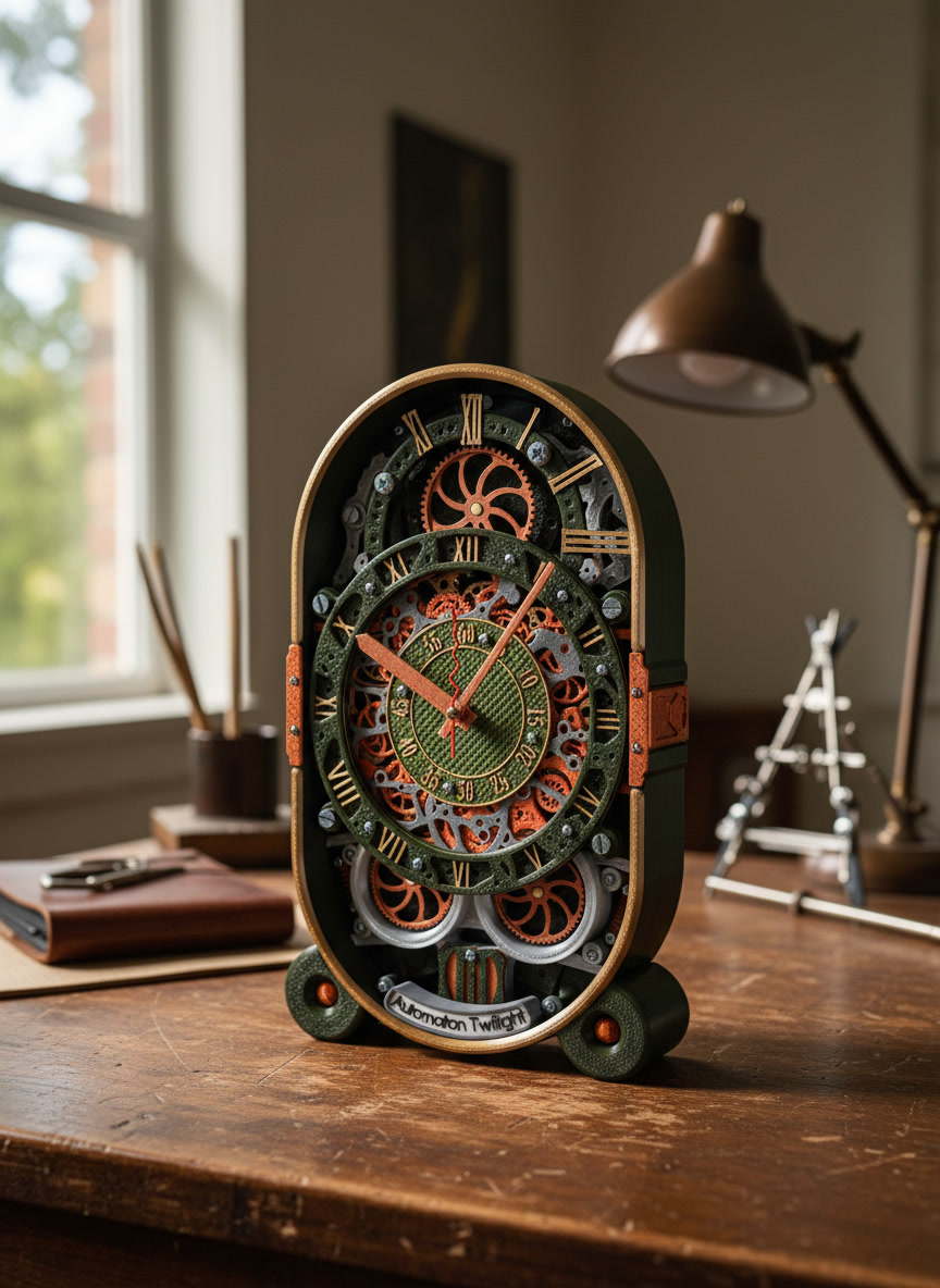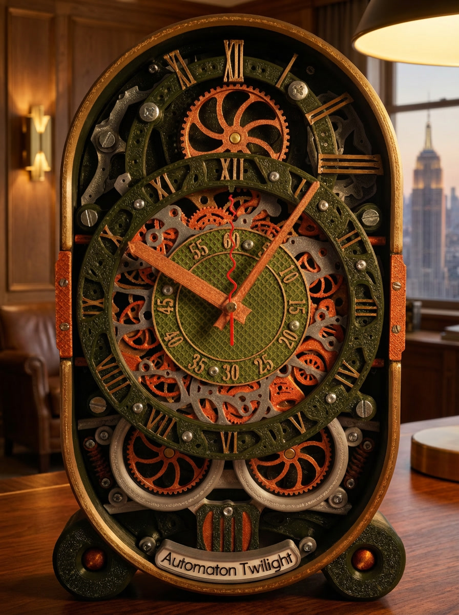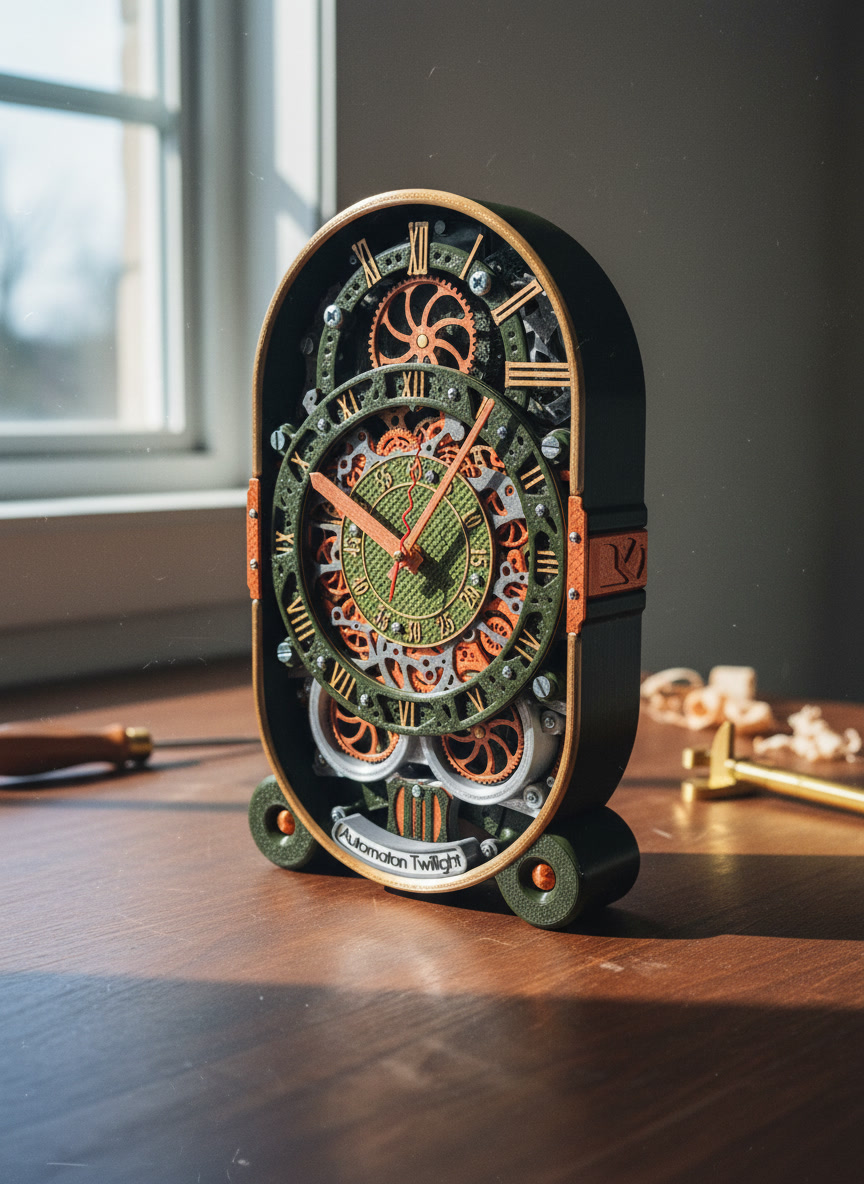 Эти уникальные настольные часы — не просто функциональный предмет, но настоящее произведение искусства, воплощающее в себе гармонию современных технологий и художественного замысла. Созданные методом 3D-печати из высококачественного полимера, они сочетают в себе несколько дизайнерских стилей и идею сумерек, что отражено в их цветовой палитре и названии — "Automaton Twilight" (Автоматон Сумерки).