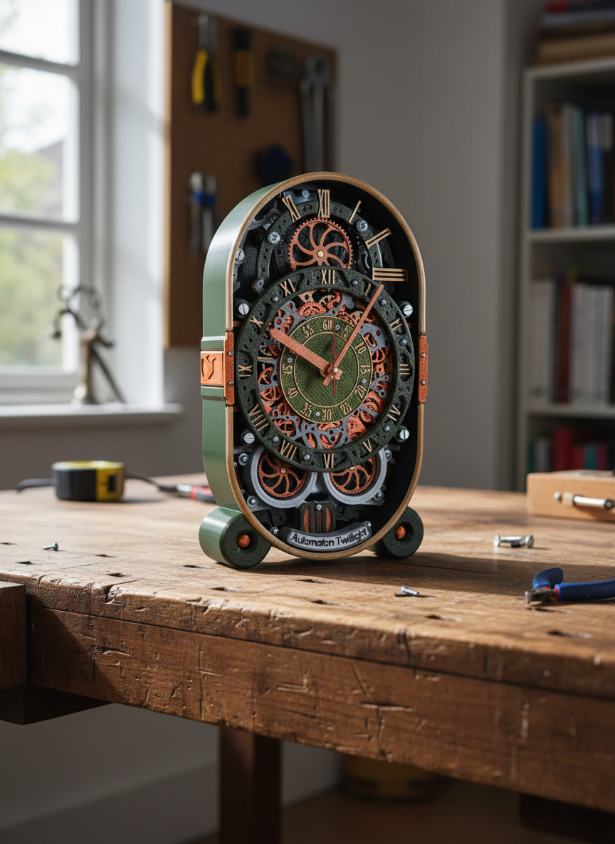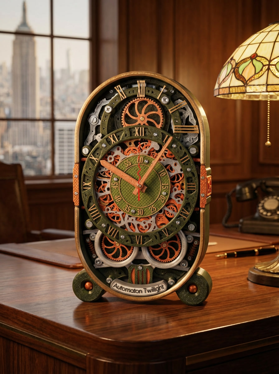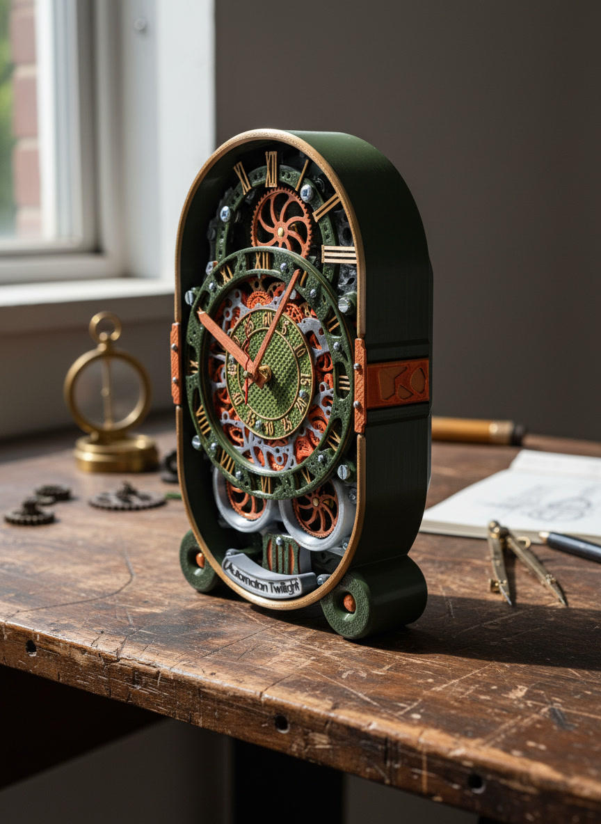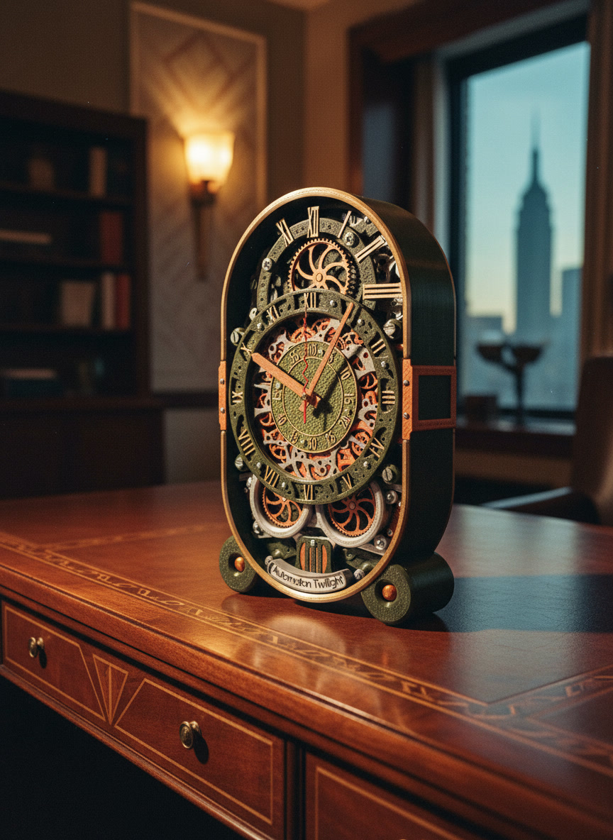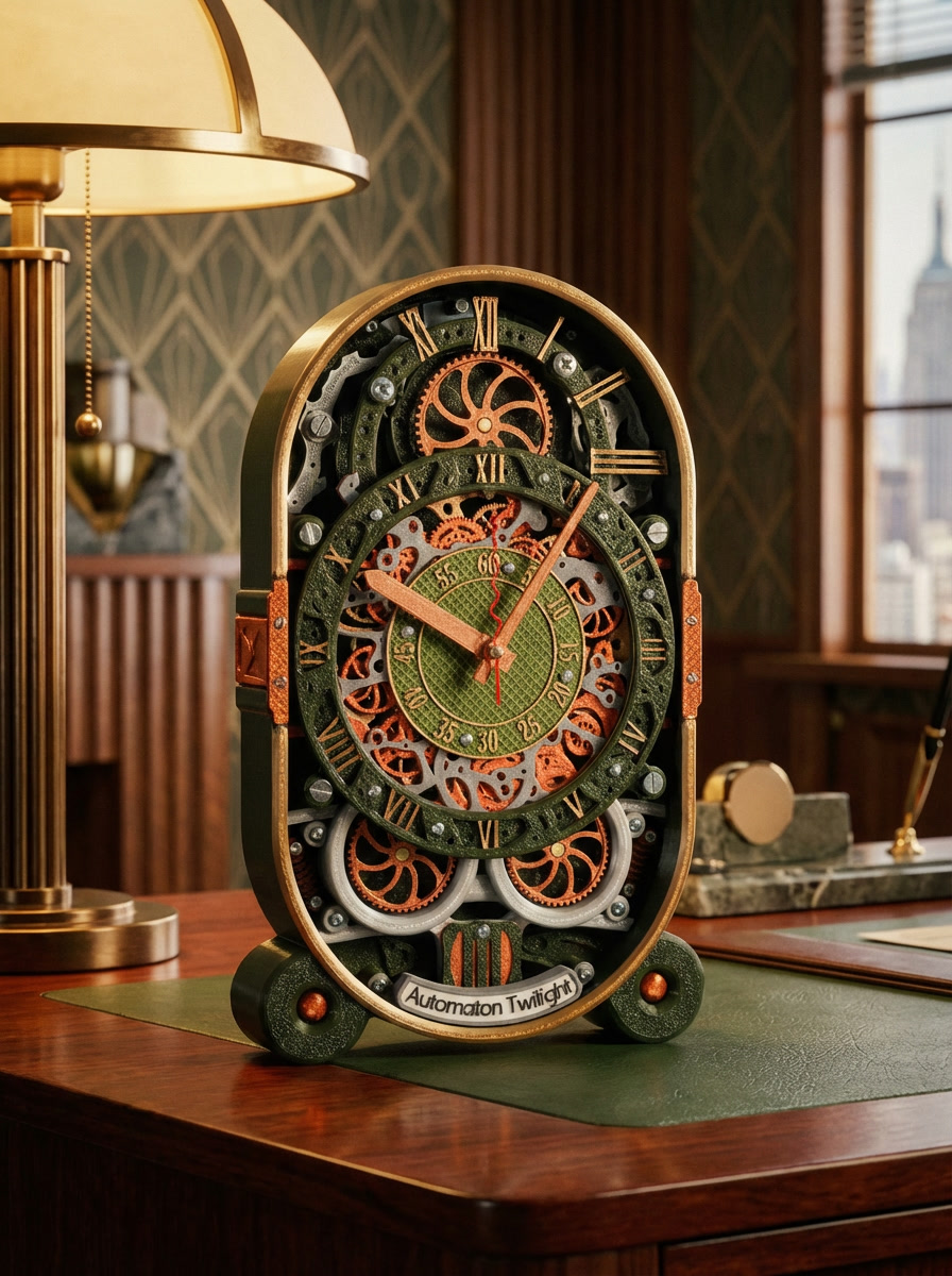 Эти уникальные настольные часы — не просто функциональный предмет, но настоящее произведение искусства, воплощающее в себе гармонию современных технологий и художественного замысла. Созданные методом 3D-печати из высококачественного полимера, они сочетают в себе несколько дизайнерских стилей и идею сумерек, что отражено в их цветовой палитре и названии — "Automaton Twilight" (Автоматон Сумерки).