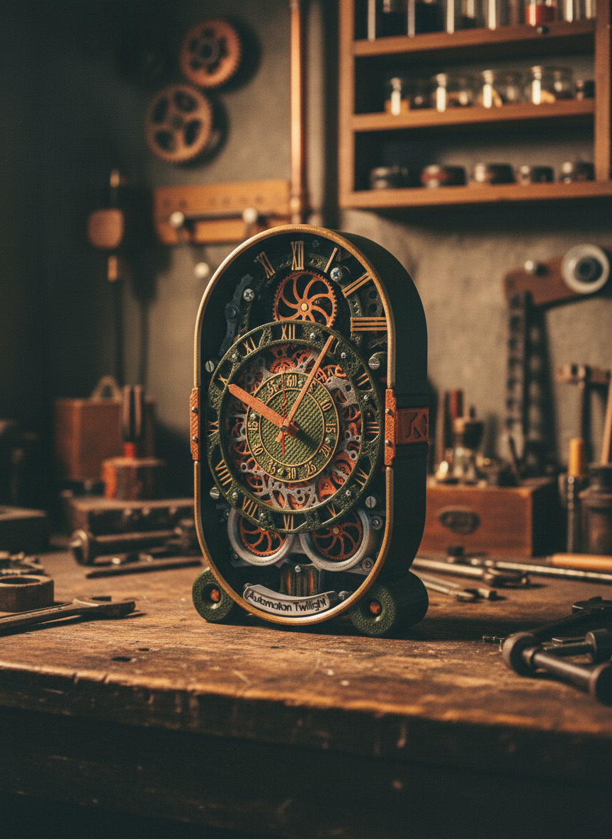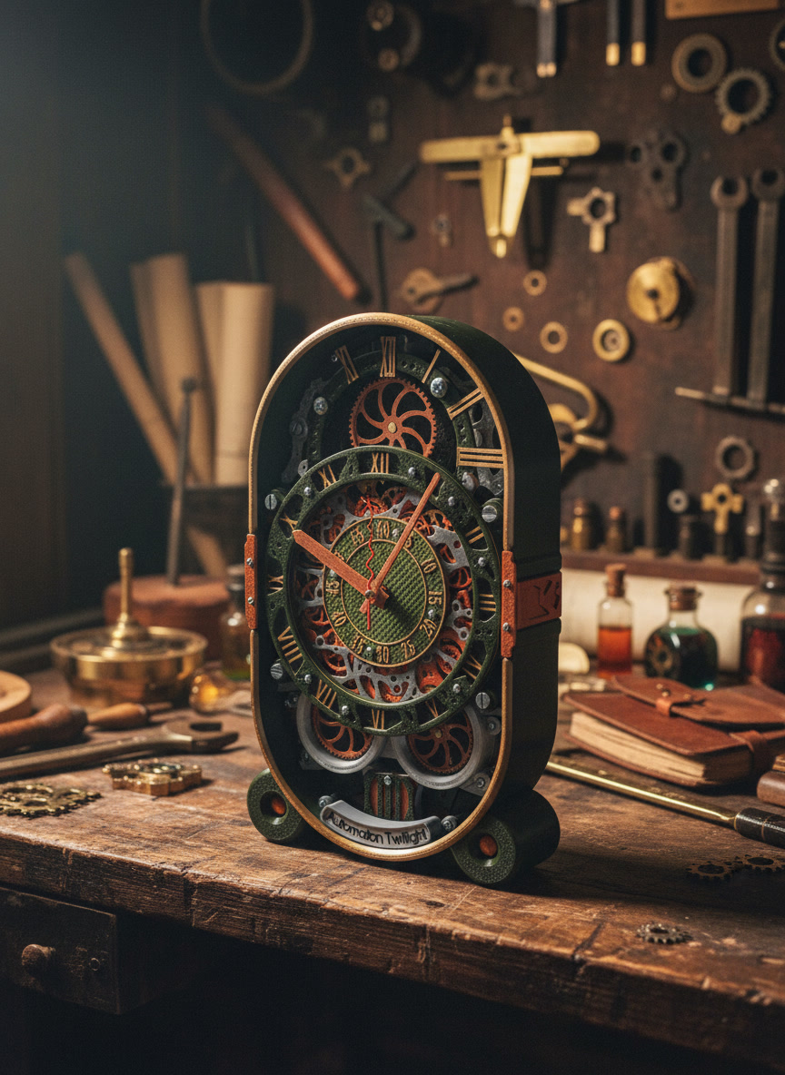 Цветовая гамма часов, где мягкий оливково-зелёный цвет сочетается с медными акцентами, отсылает нас к тихому моменту перехода дня в ночь. Это символика сумерек — времени, когда свет ещё не угас, но уже не доминирует, когда граница между светом и тьмой размыта. Тёмные и теплые оттенки корпуса напоминают таинственные, приглушённые цвета неба на закате, а медные элементы символизируют последние проблески уходящего солнца. Это создаёт атмосферу спокойствия и погружения в тихий ритм времени, в то время как три плавно вращающиеся шестерни добавляют динамики, делая часы живым и дышащим объектом.