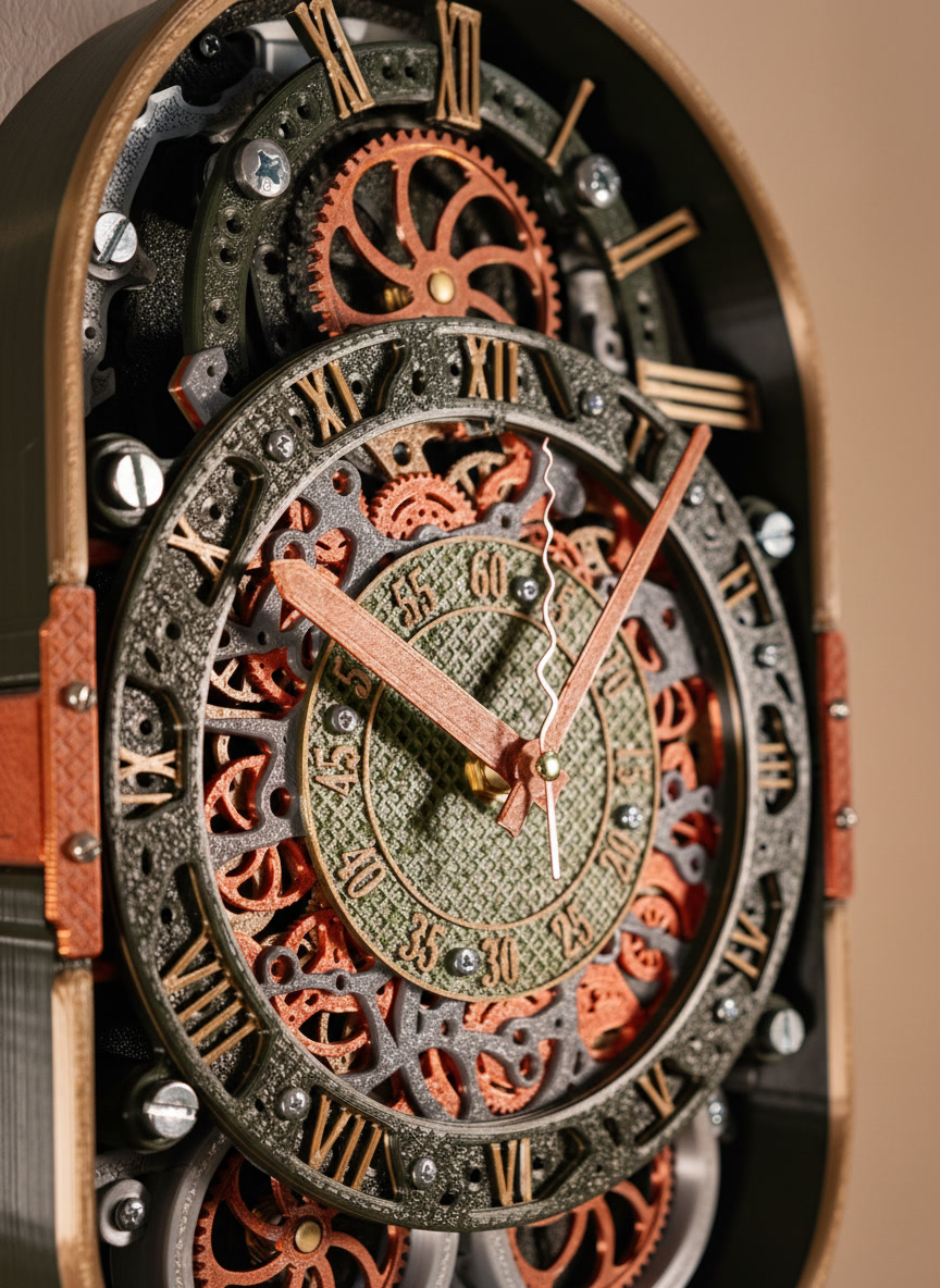 Индустриальный стиль с его акцентом на механические детали, такие как открытые шестеренки и винты, позволяет подчеркнуть сложность устройства, создавая ощущение, что перед нами не просто часы, а загадочный механизм из фантастического будущего. Эти элементы также перекликаются с стимпанком, где механика служит не только функциональной, но и эстетической задачей. Сложные и детализированные шестерни, словно застывшие в моменте между светом и тьмой, визуализируют скрытую магию технологий.