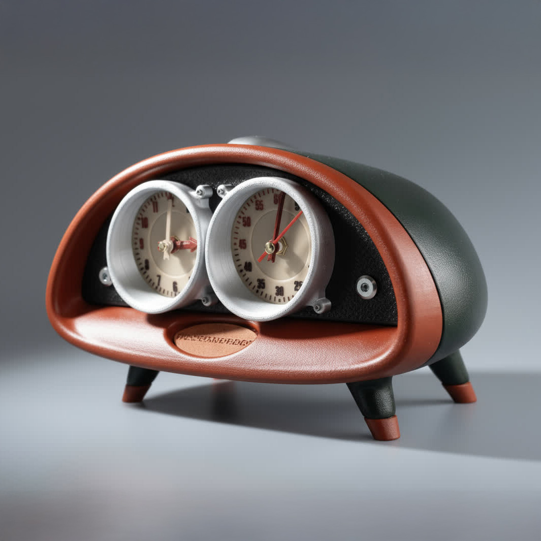 Настольные часы, созданные под вдохновением от золотой эры американского автодизайна. В их облике угадываются линии классических приборных панелей Cadillac и Corvette — плавные изгибы корпуса, блеск металла, уверенное ощущение скорости и движения, превращённое в форму.